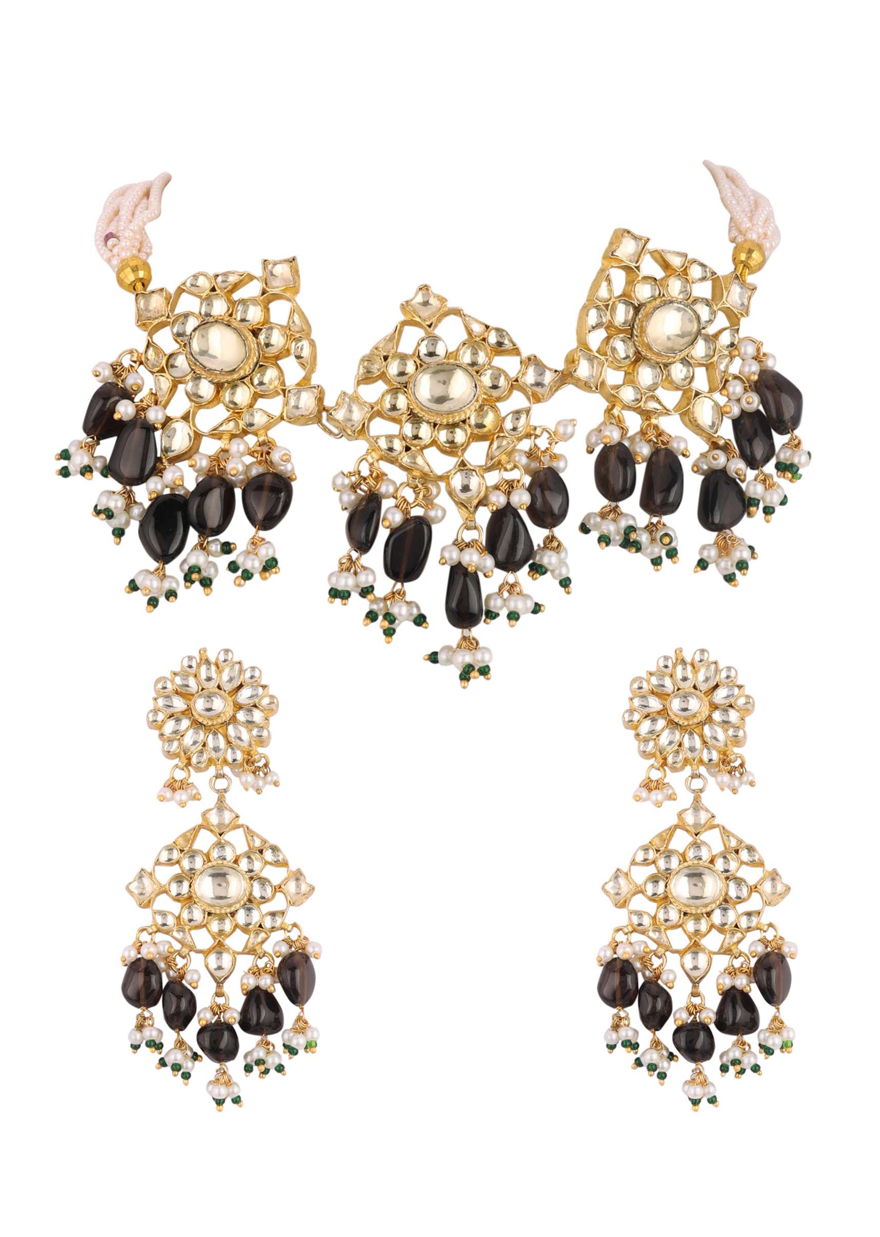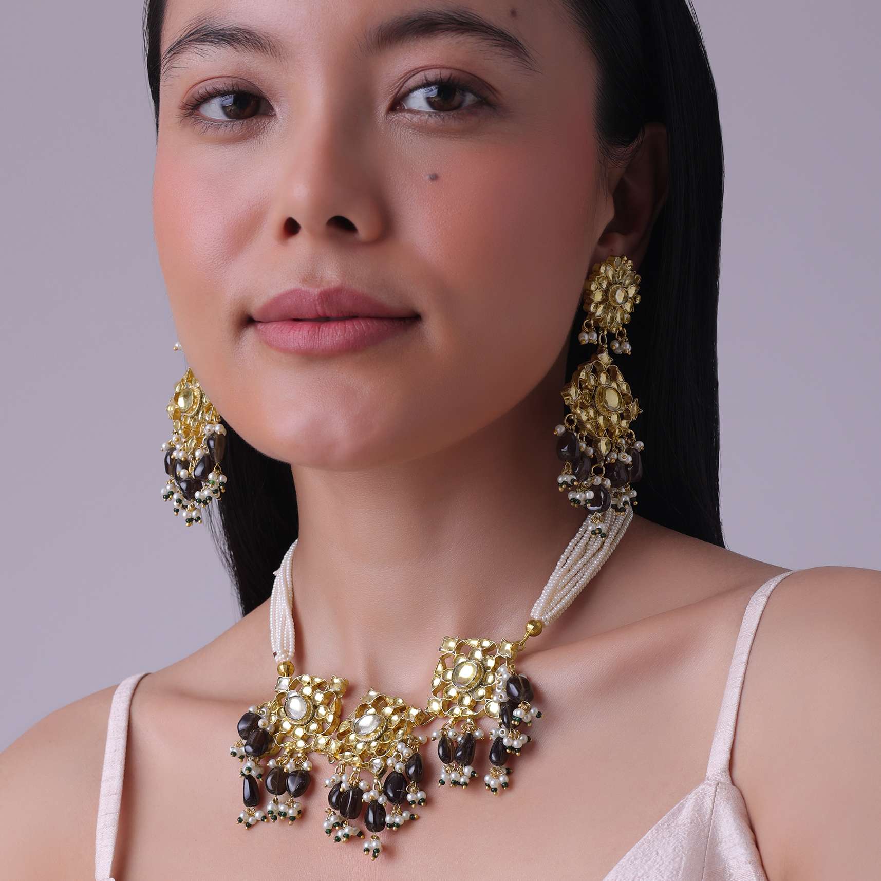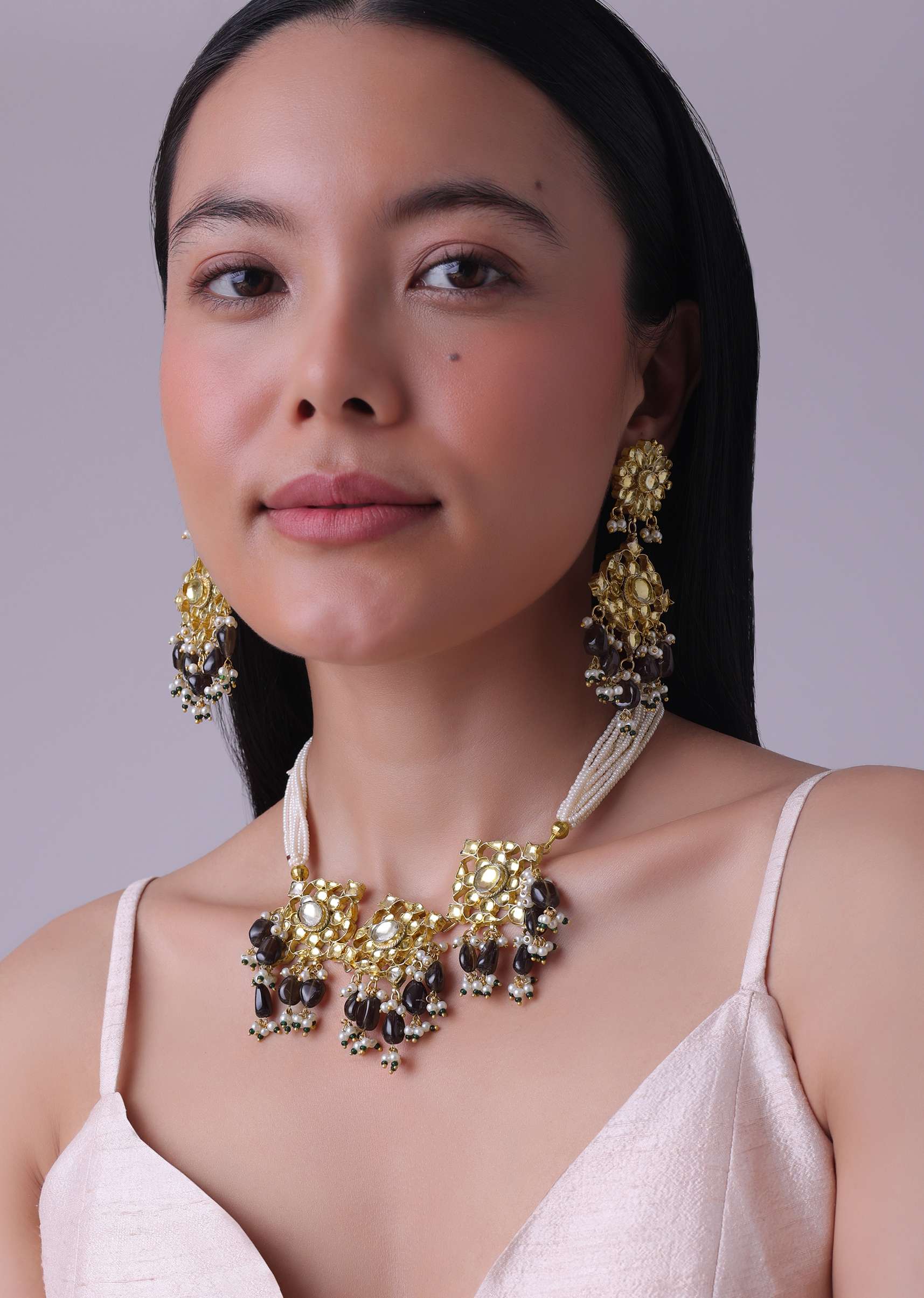 Introducing this exquisite gold finish kundan polki necklace and earring set with stones and beads, a stunning piece of jewelry that exudes elegance and beauty. This gorgeous set is handcrafted by skilled artisans using the finest quality materials and intricate craftsmanship, making it a timeless piece that will be treasured for years to come. The set features beautiful black stones and bead drops on the necklace with detailed polki work, perfect for your upcoming festive occasions or weddings.The jewelry set is polished and anti-tarnish.Avoid contact with water, chemicals, harsh liquids, perfumes, etc.Do not wear this piece of jewelry while showering, gymming, swimming, etc.Hard contact must be avoided completely.Please keep the product away from moisture and humidity when not in use.Baroque pearls and Natural stones can range from minor aberrations to distinctly ovoid, curved, pinched, or lumpy shapes.Slight variations in design may vary. Awarded as the Most Trusted Brand, we're delivering styles you love, just as promised.