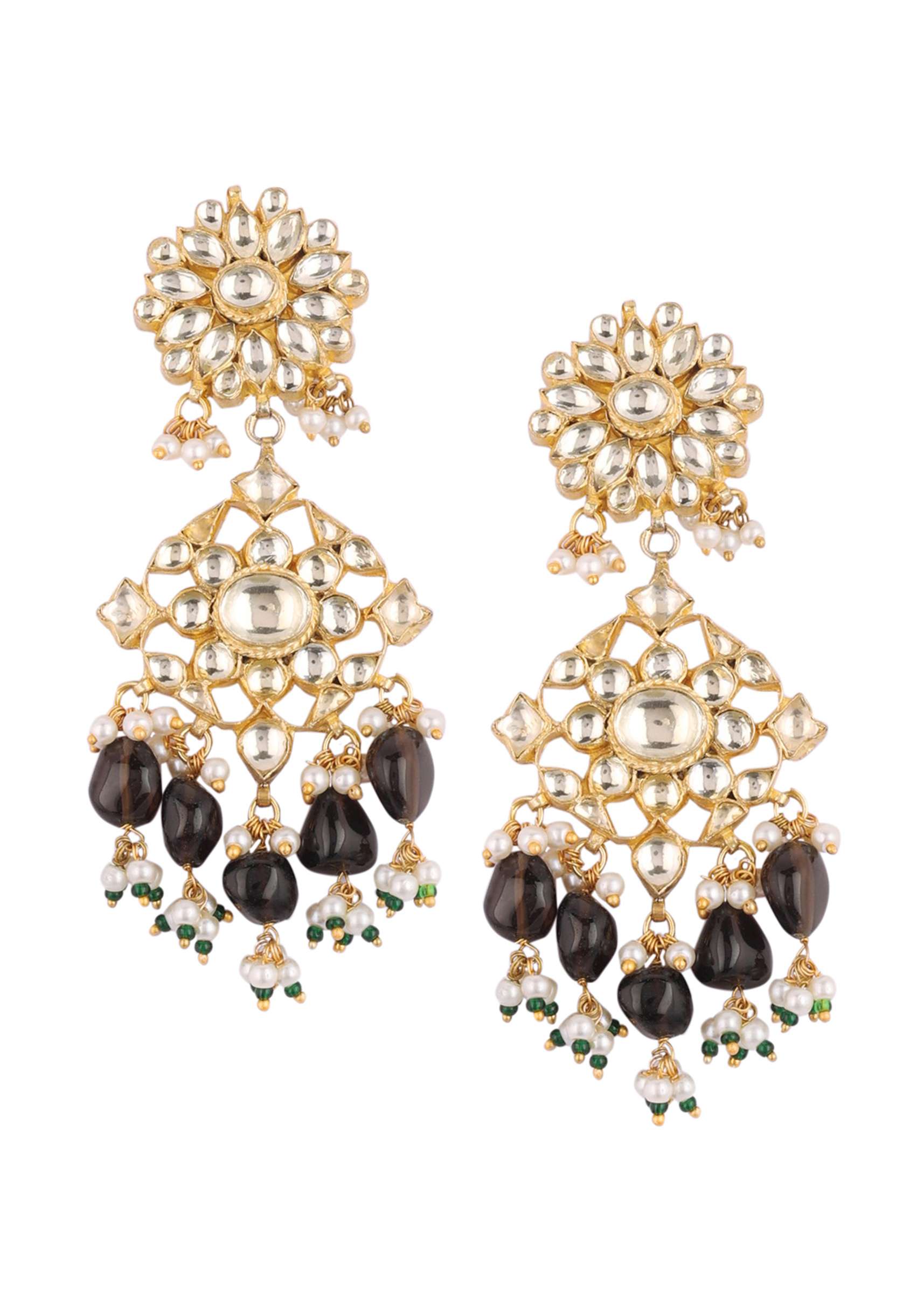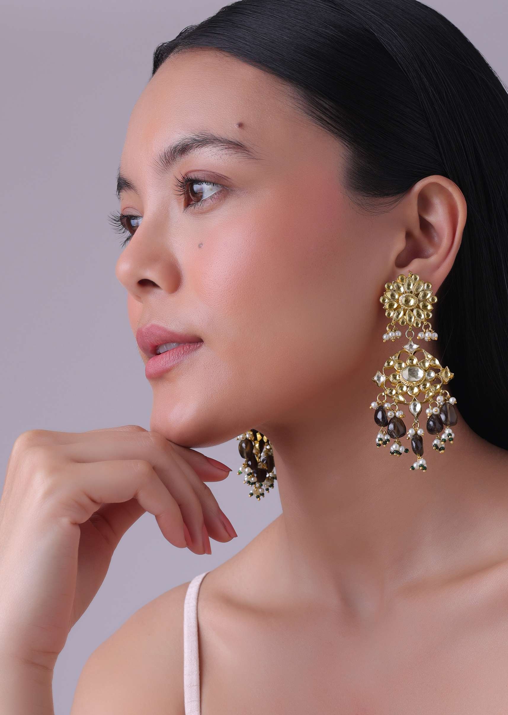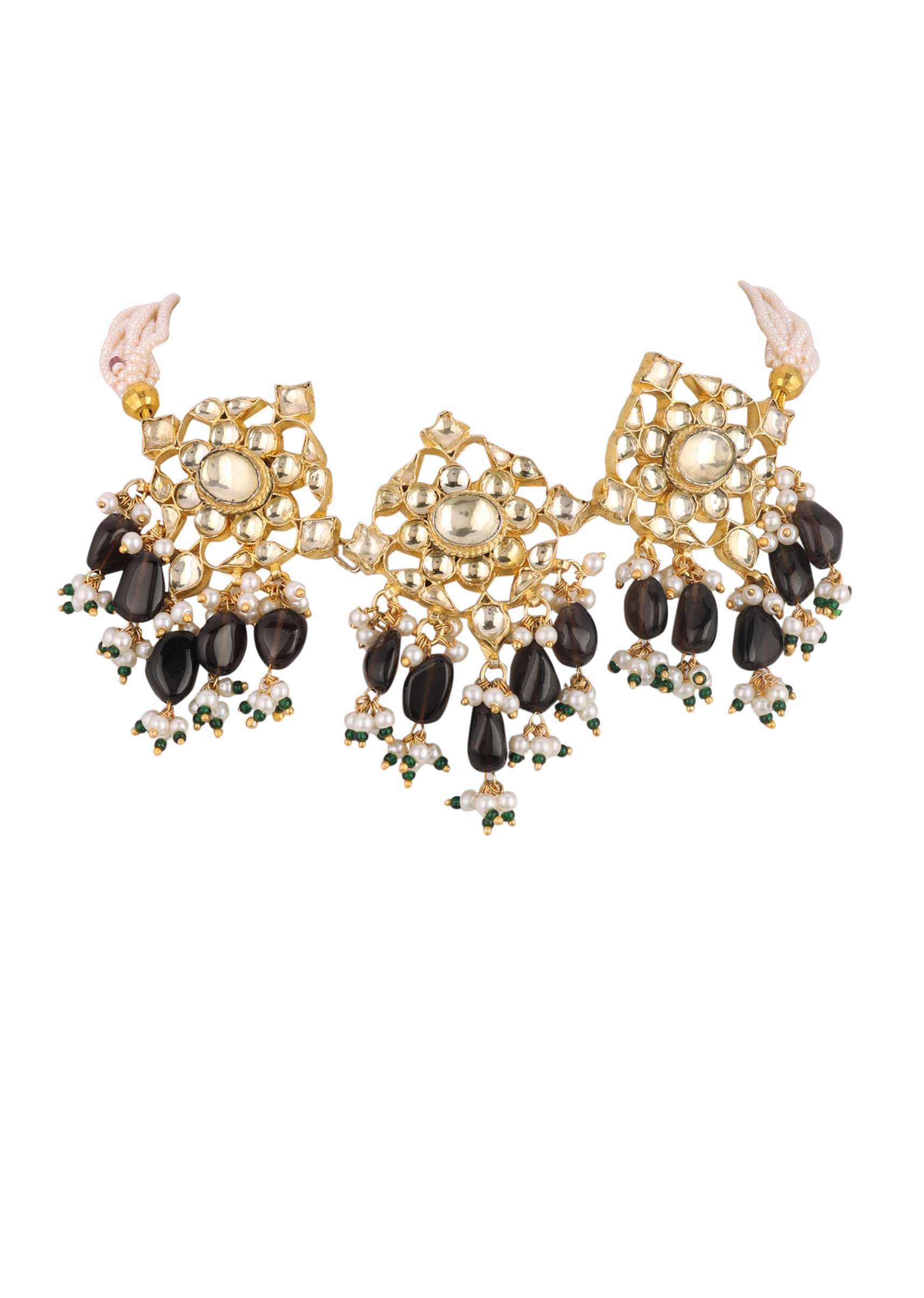 Introducing this exquisite gold finish kundan polki necklace and earring set with stones and beads, a stunning piece of jewelry that exudes elegance and beauty. This gorgeous set is handcrafted by skilled artisans using the finest quality materials and intricate craftsmanship, making it a timeless piece that will be treasured for years to come. The set features beautiful black stones and bead drops on the necklace with detailed polki work, perfect for your upcoming festive occasions or weddings.The jewelry set is polished and anti-tarnish.Avoid contact with water, chemicals, harsh liquids, perfumes, etc.Do not wear this piece of jewelry while showering, gymming, swimming, etc.Hard contact must be avoided completely.Please keep the product away from moisture and humidity when not in use.Baroque pearls and Natural stones can range from minor aberrations to distinctly ovoid, curved, pinched, or lumpy shapes.Slight variations in design may vary. Awarded as the Most Trusted Brand, we're delivering styles you love, just as promised.