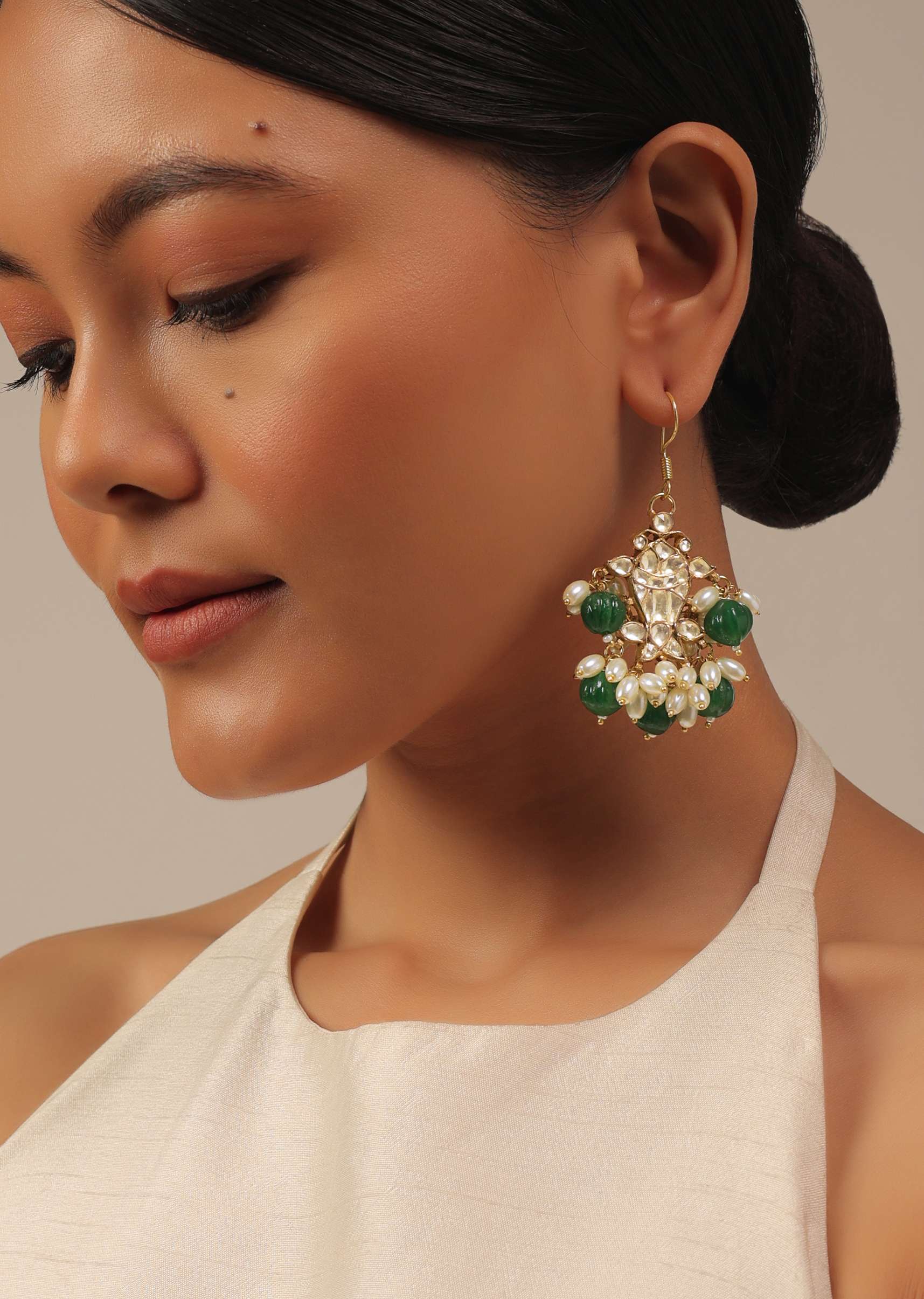 Gold Finish Kundan Polki Dangling Earrings With Synthetic Emerald Stones