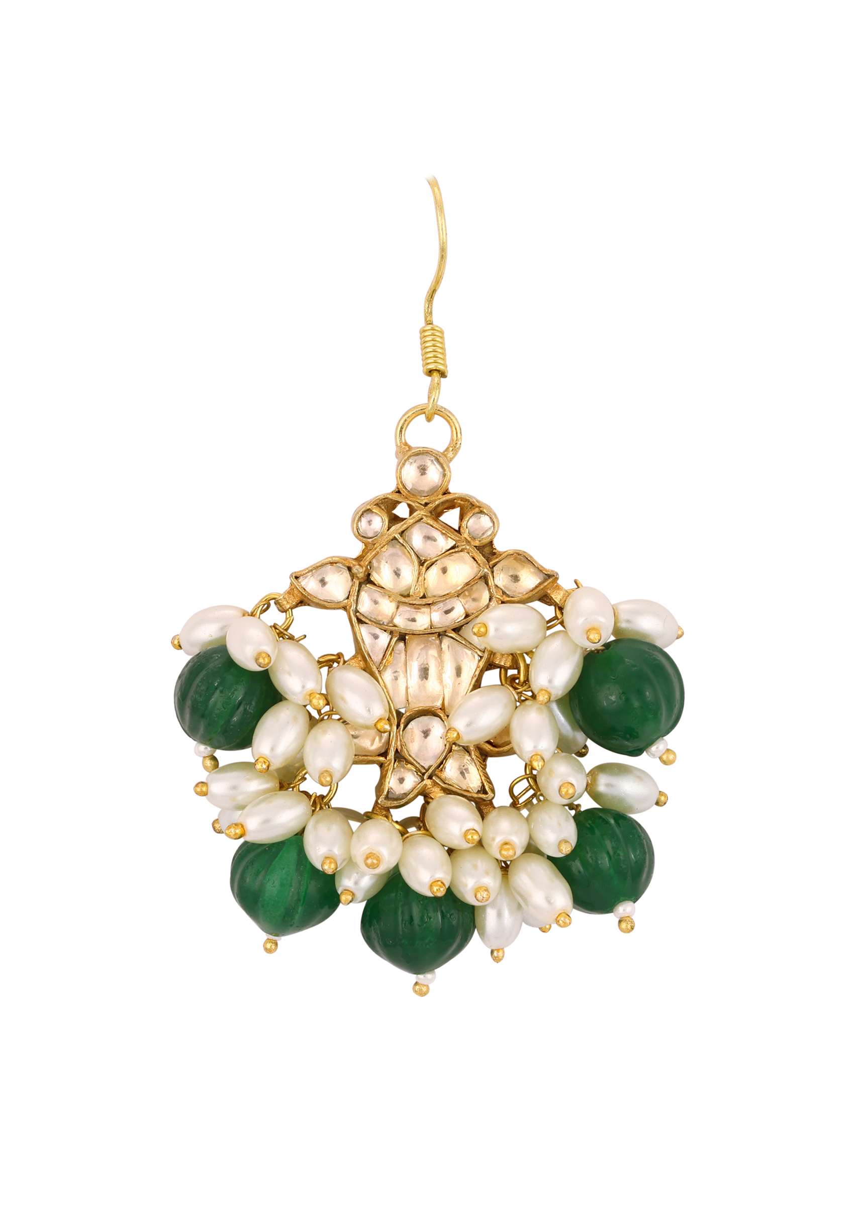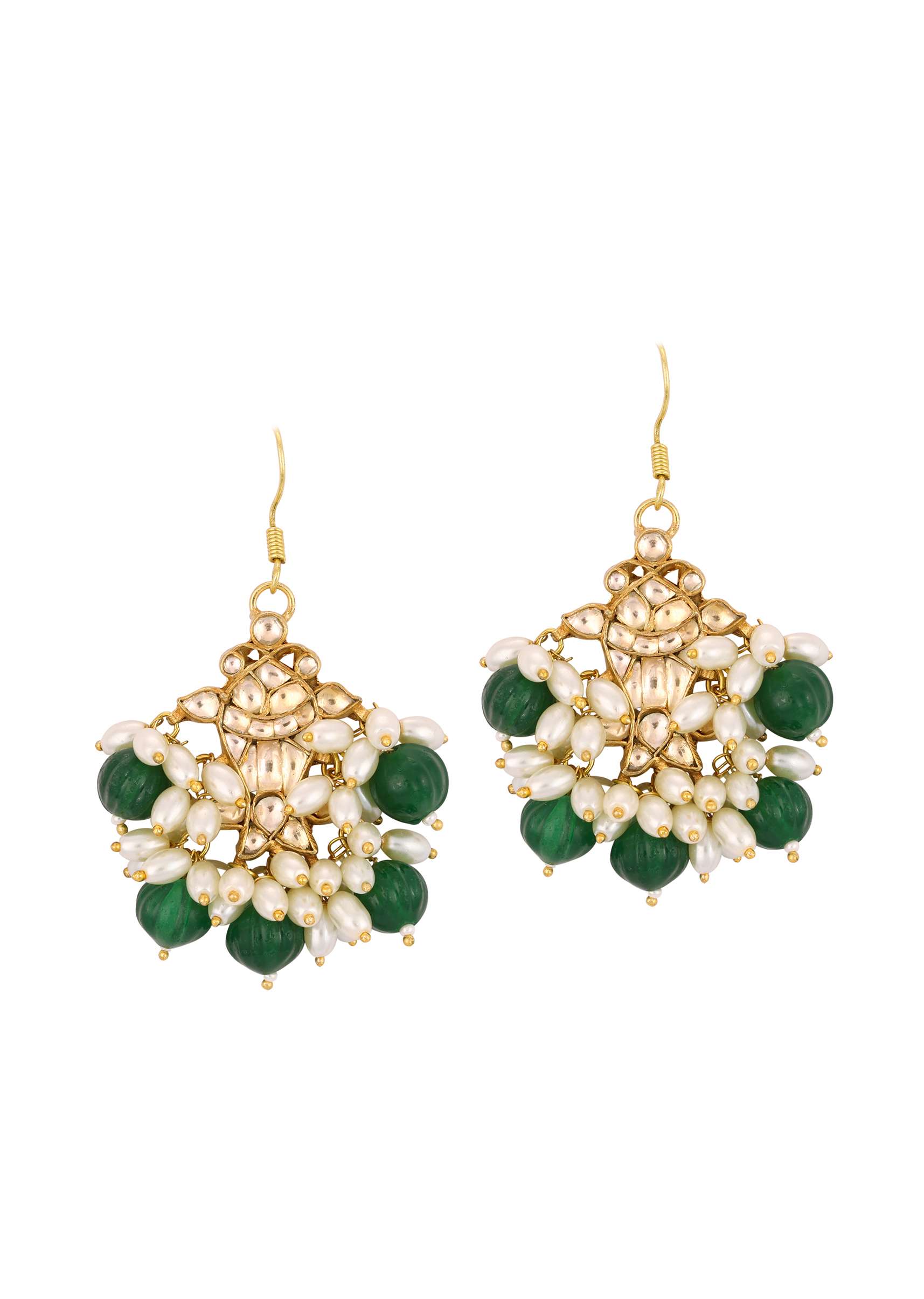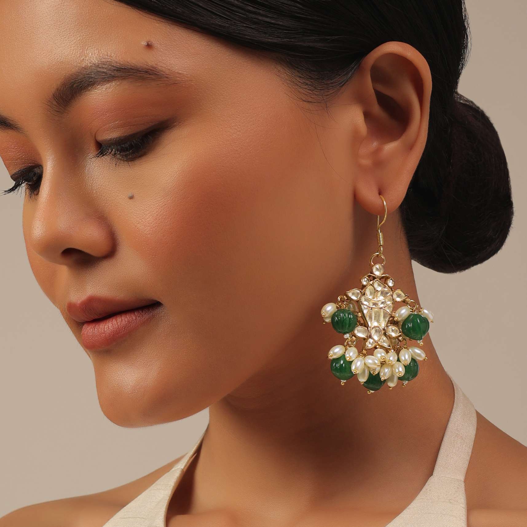 Our stunning gold finish kundan polki dangling earrings are a perfect blend of traditional and modern design that will elevate any outfit. The earrings feature a stunning floral design accentuated by synthetic emerald stones. These earrings are ideal for attending a wedding or a celebratory event due to their gorgeous and detailed design. Avoid contact with water, chemicals, harsh liquids, perfumes, etc. Hard contact must be avoided completely. Slight variations in design may vary. Awarded as the Most Trusted Brand, we're delivering styles you love, just as promised.