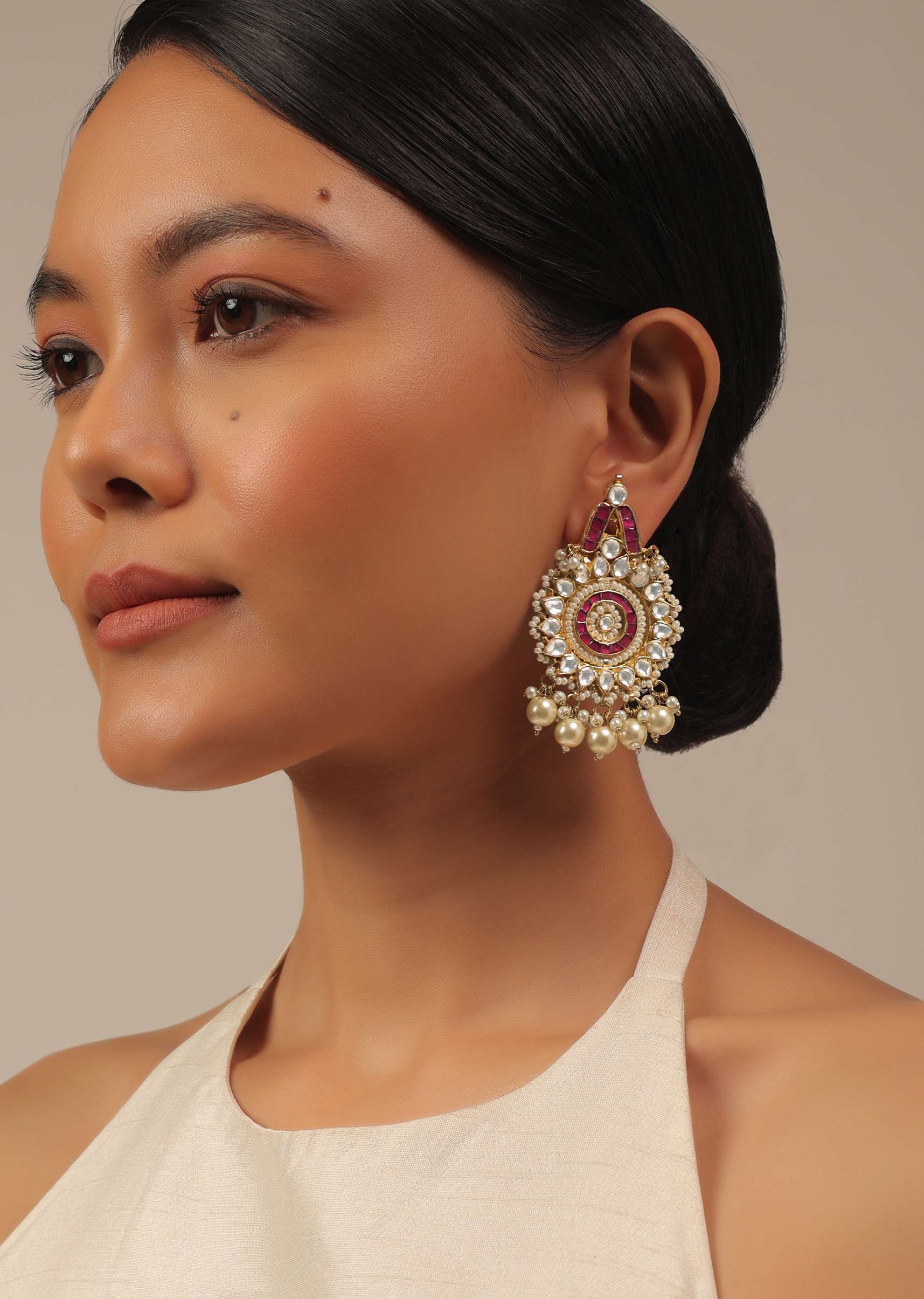Gold Finish Kundan Polki Earrings With Pearls And Beads