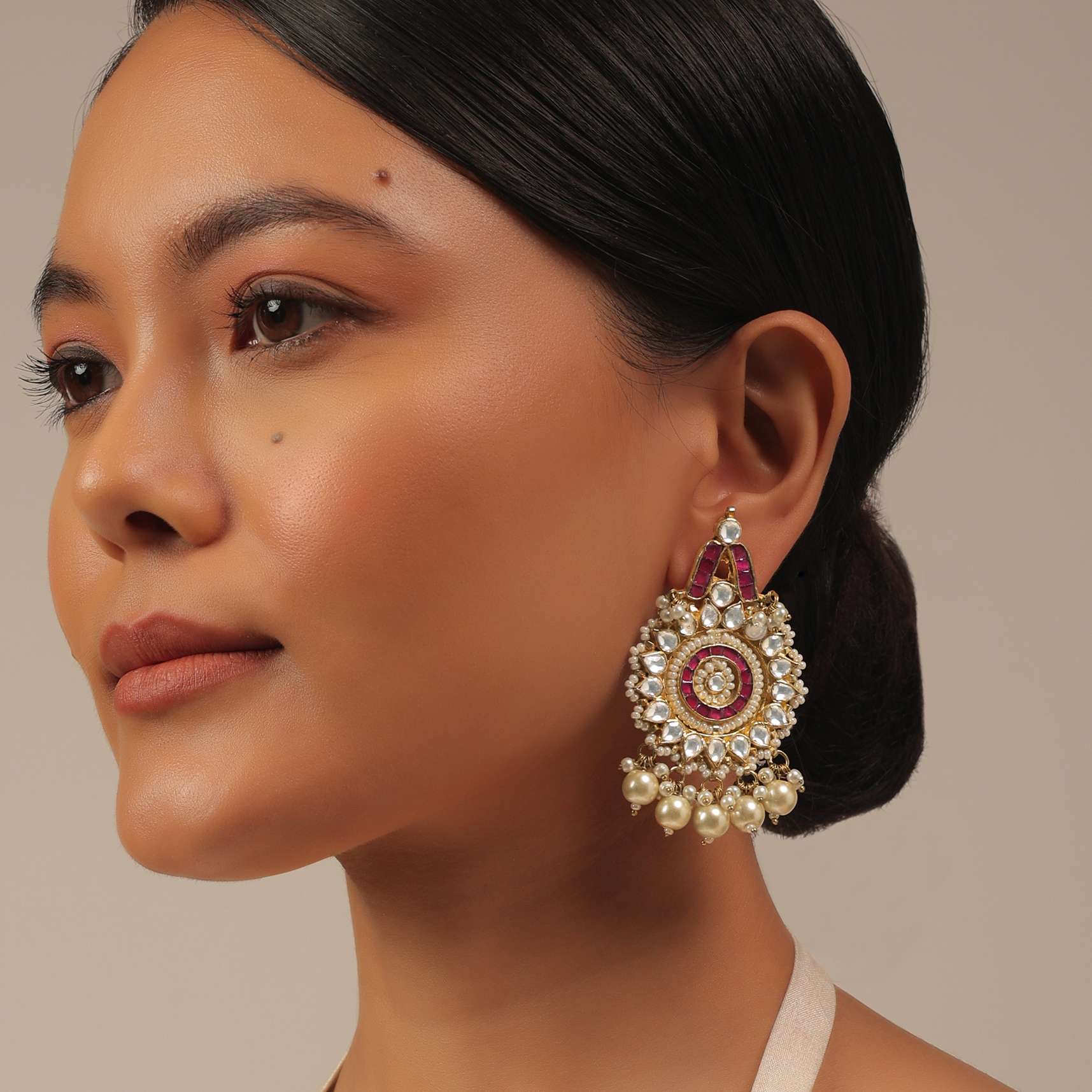 These earrings are a combination of Kundan Polki stones, pearls, and beads that gives a regal and luxurious look, making them an apt choice for bridal wear. They can also... More Product Details