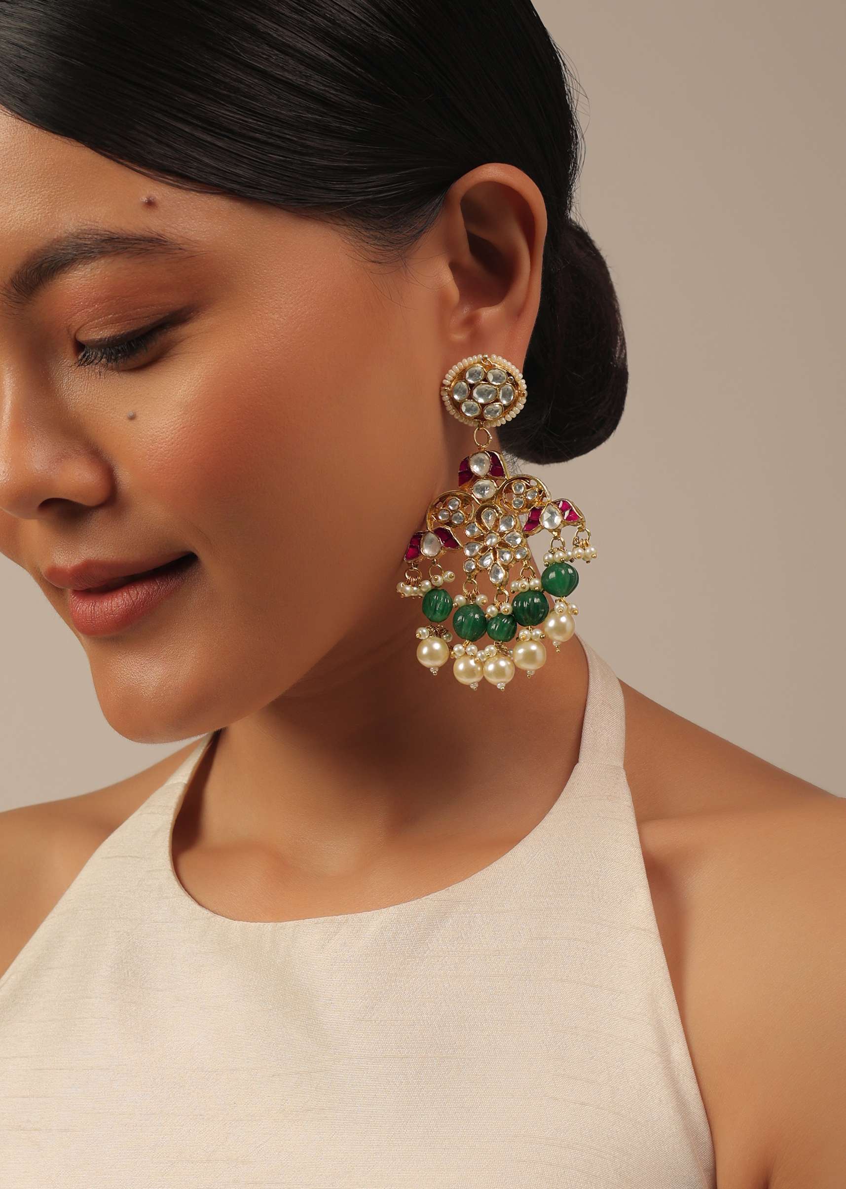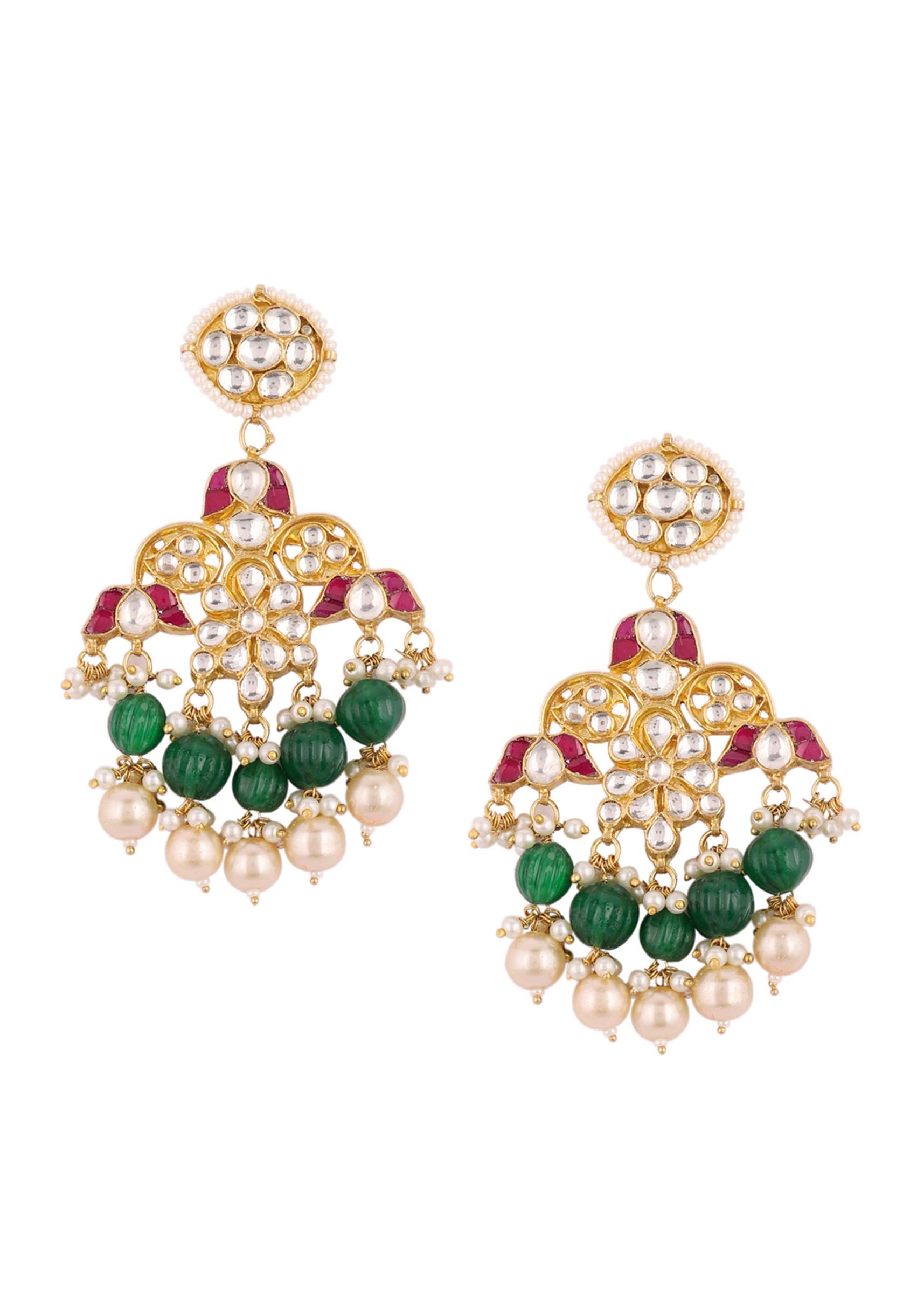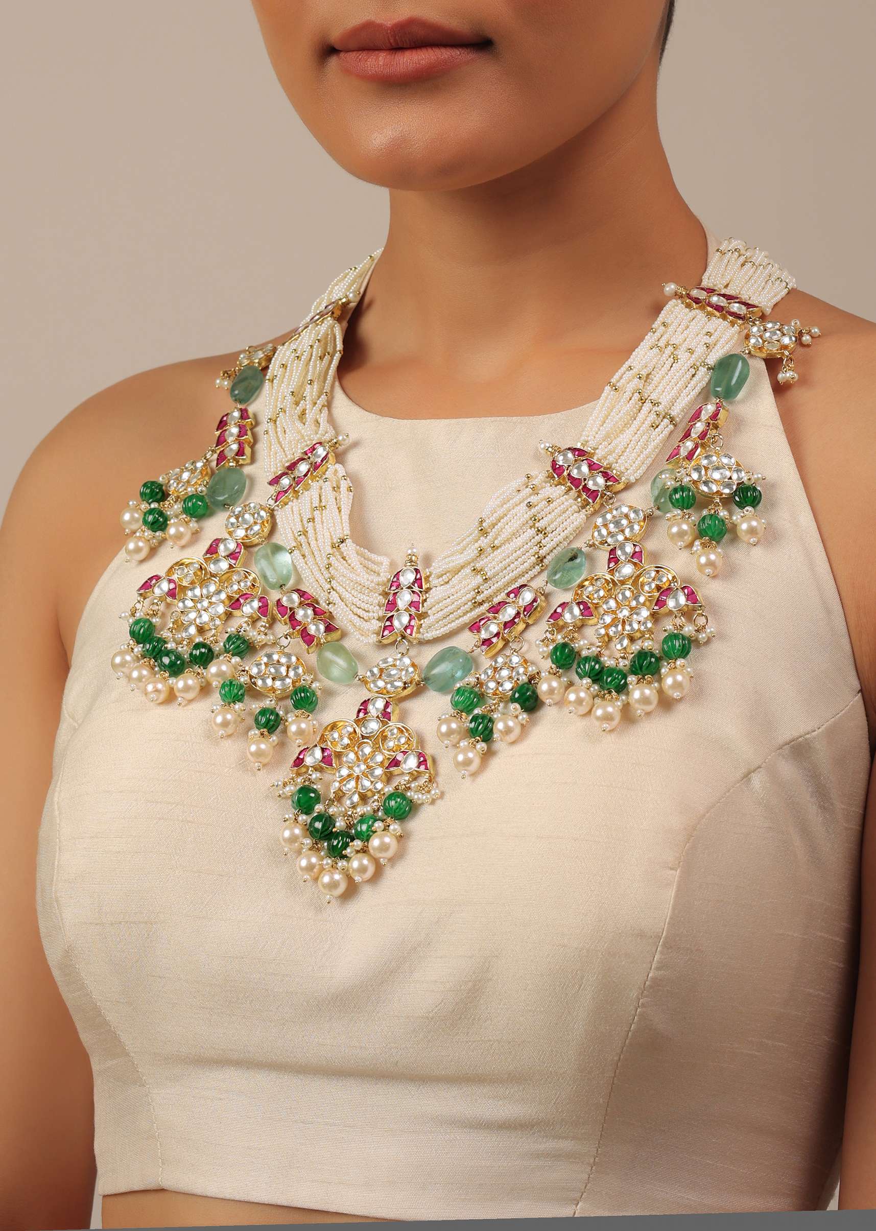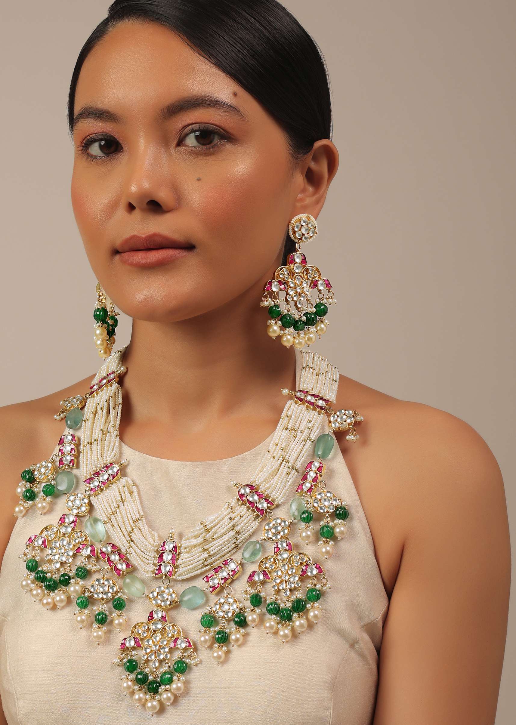 Introducing this breathtaking gold finish kundan polki long necklace and earrings set.Crafted with exquisite attention to detail, this set features a long necklace that drapes beautifully along the neckline, embellished with radiant pink stones, green beads, and dazzling diamonds set in delicate kundan polki work.The set includes a pair of stunning earrings that perfectly match the necklace. The jewelry set is polished and anti-tarnish.Avoid contact with water, chemicals, harsh liquids, perfumes, etc.Do not wear this piece of jewelry while showering, gymming, swimming, etc.Hard contact must be avoided completely.Please keep the product away from moisture and humidity when not in use.Baroque pearls and Natural stones can range from minor aberrations to distinctly ovoid, curved, pinched, or lumpy shapes.Slight variations in design may vary. Awarded as the Most Trusted Brand, we're delivering styles you love, just as promised.