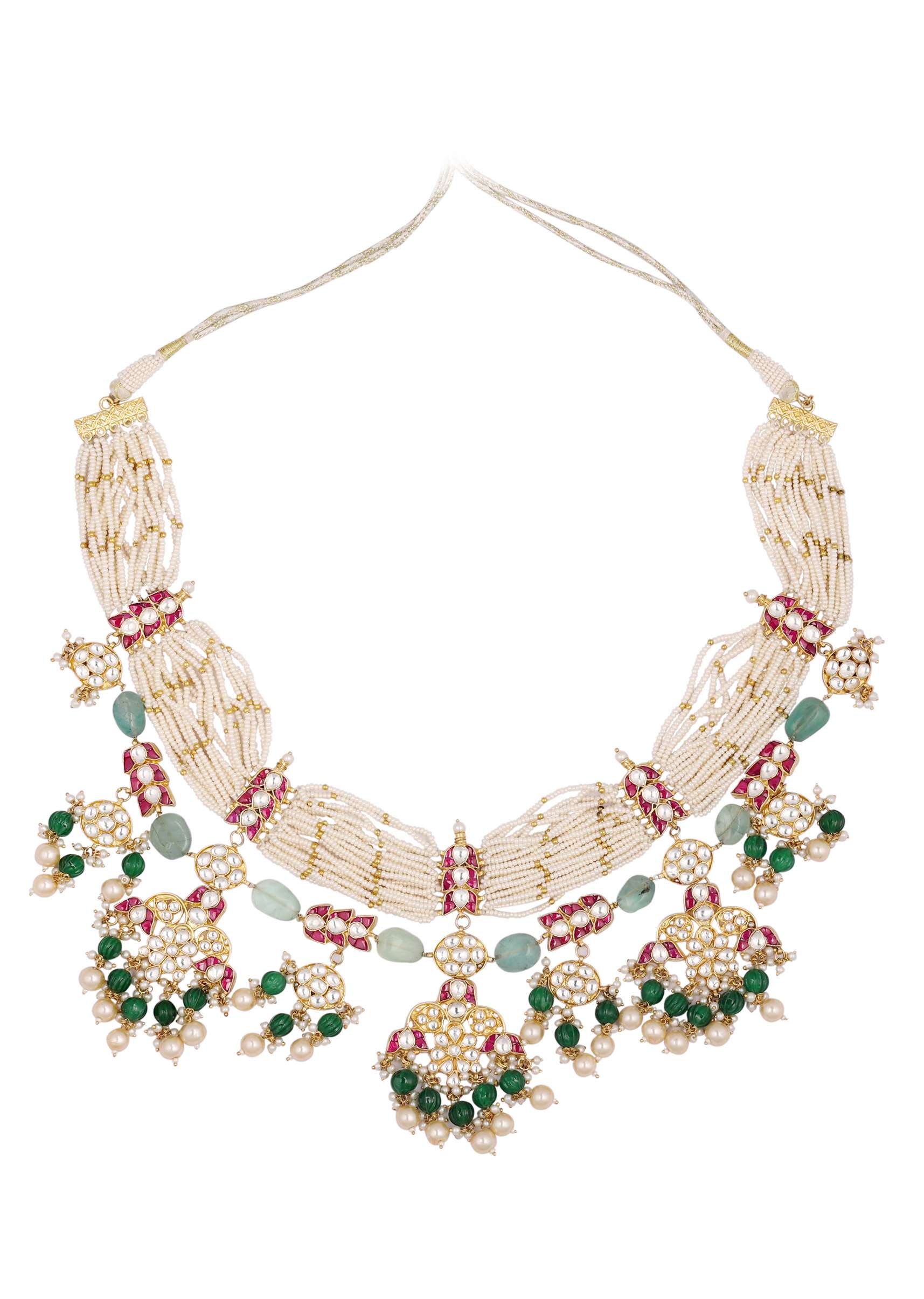 Gold Finish Kundan Polki Multicolor Choker Set With Pearls And Green Beads