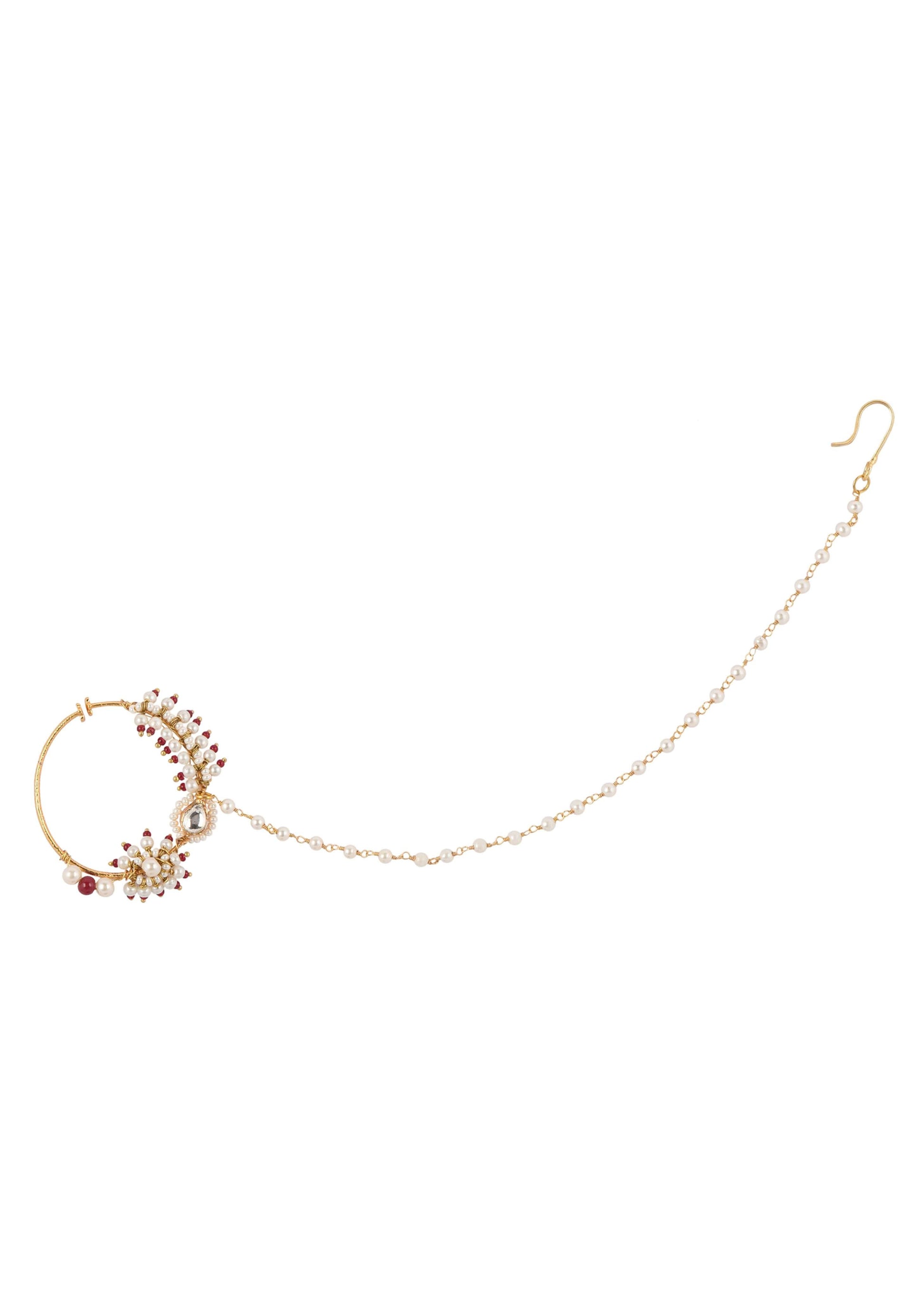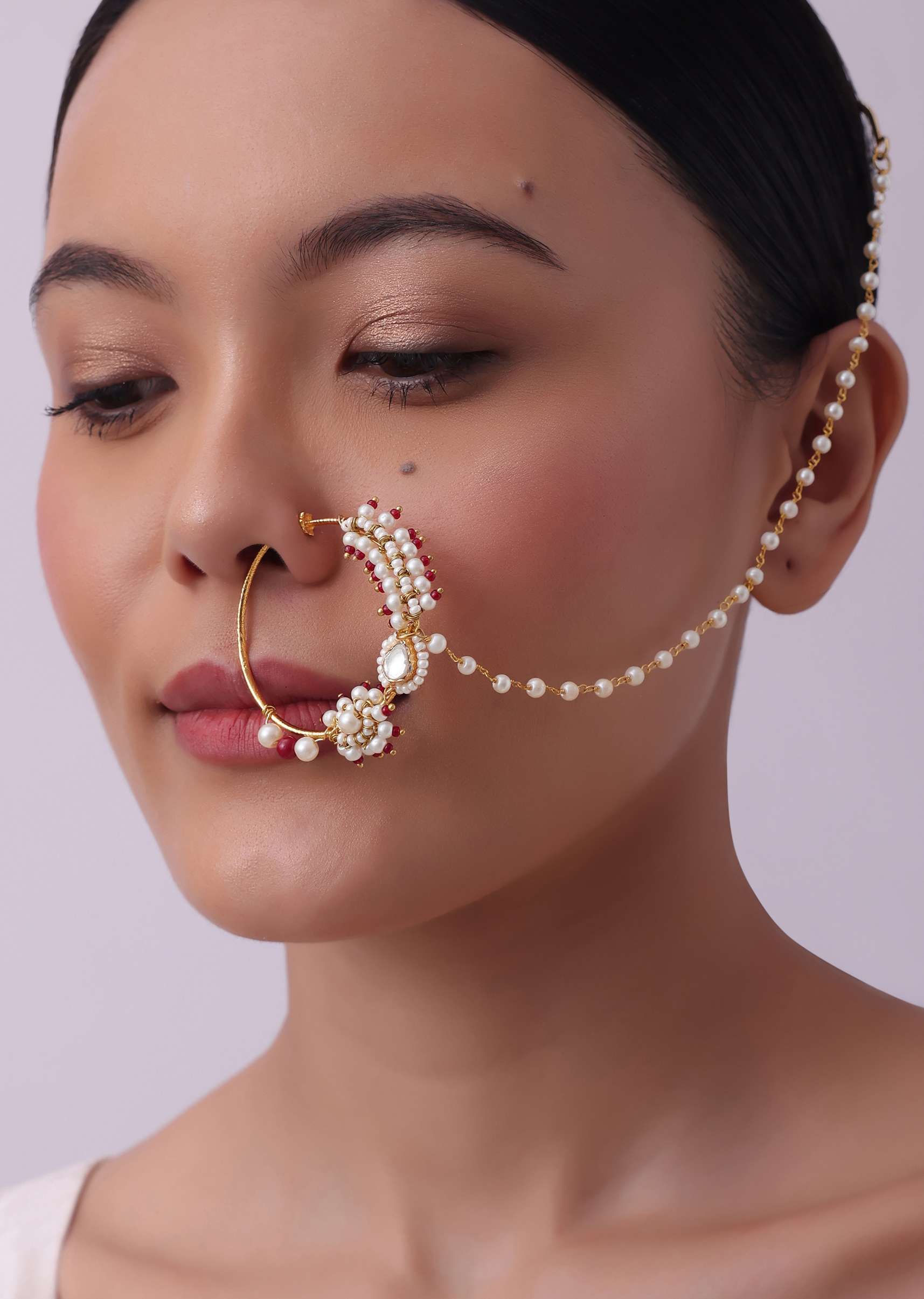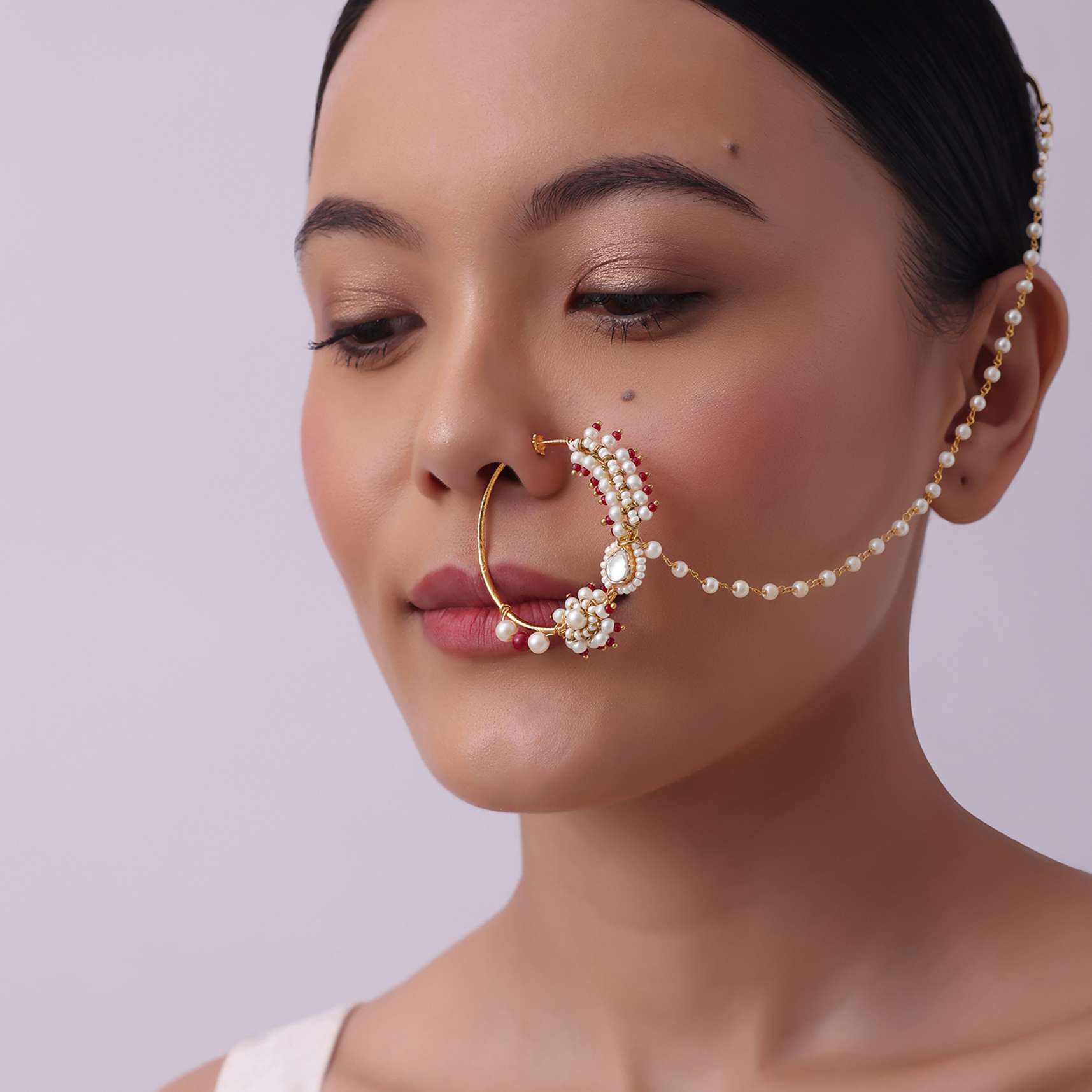 Bridal kundan polki nath with a sleek string design in pearls, ruby beads, and white beads that emits sleek sophistication. An effortless upgrade to any traditional and bridal ensemble, it is a gold-finished piece, crafted with gold drops and a pearl in the center. This elegant nath is kundan studded with a base of high-quality mixed metal alloy. Avoid contact with water, chemicals, harsh liquids, perfumes, etc. Hard contact must be avoided completely. Slight variations in design may vary. Awarded as the Most Trusted Brand, we're delivering styles you love, just as promised.