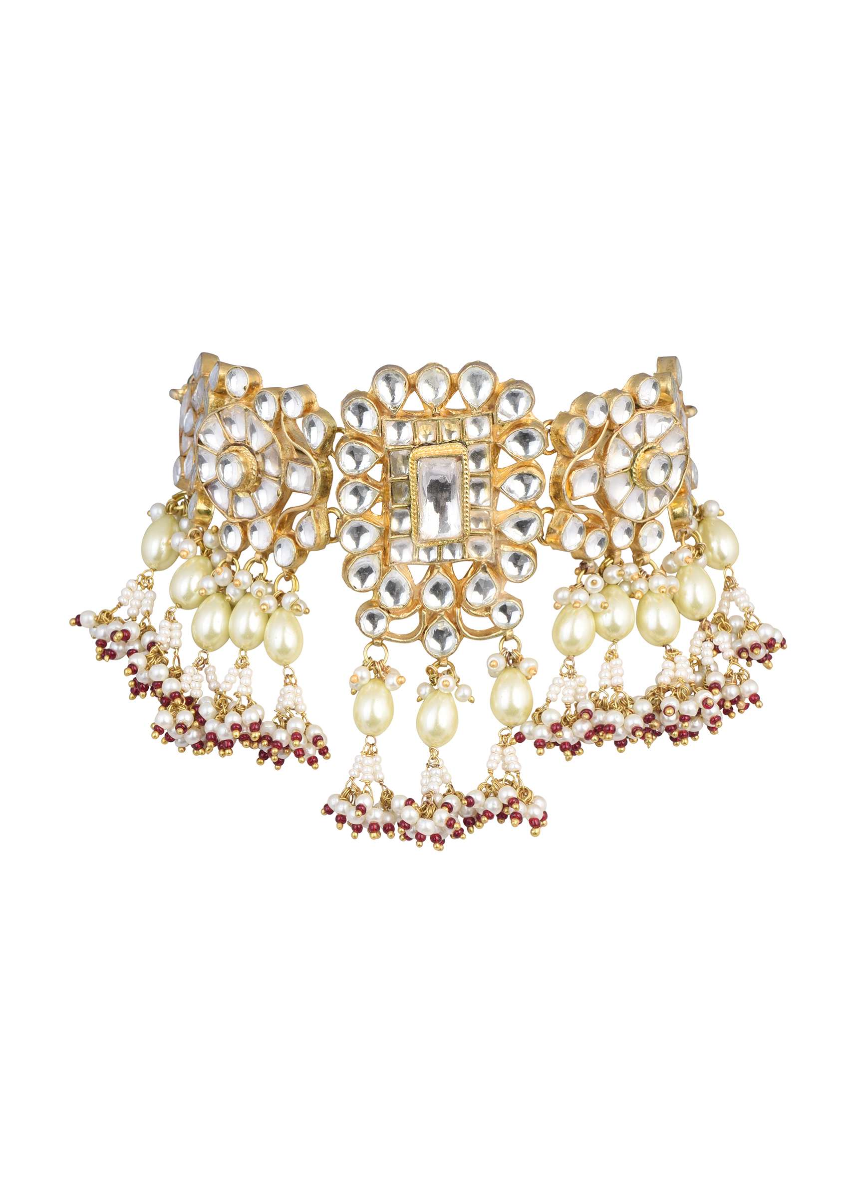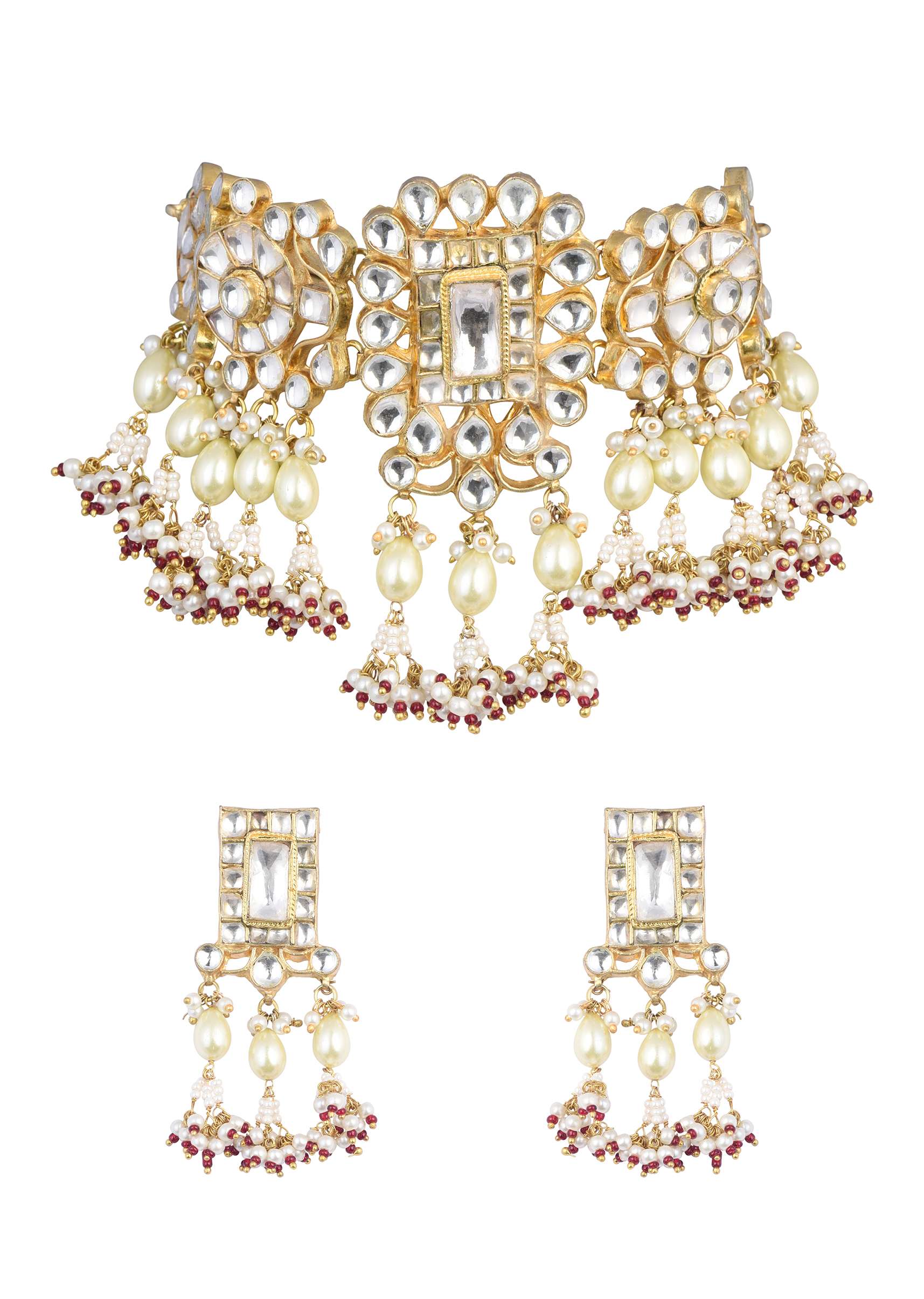 Gold Finish Kundan Polki Pearl White Choker Set With Pearls and Red Beads