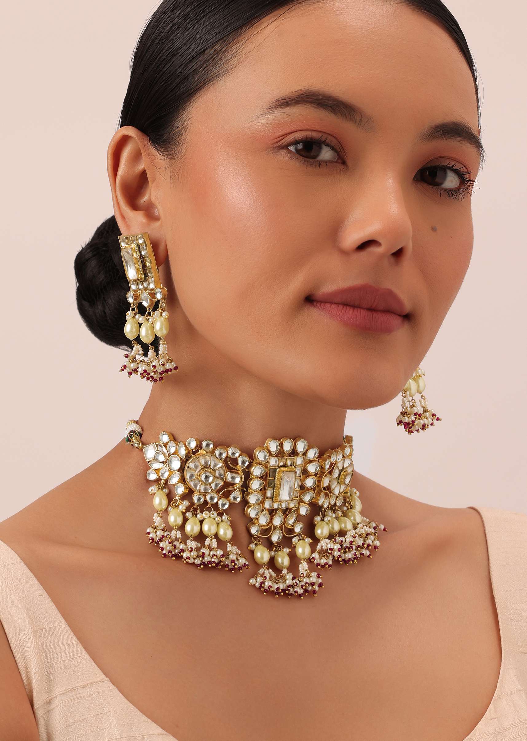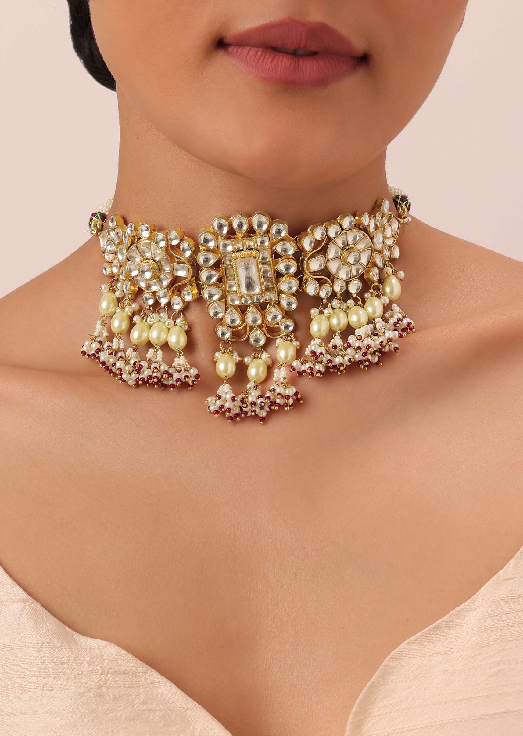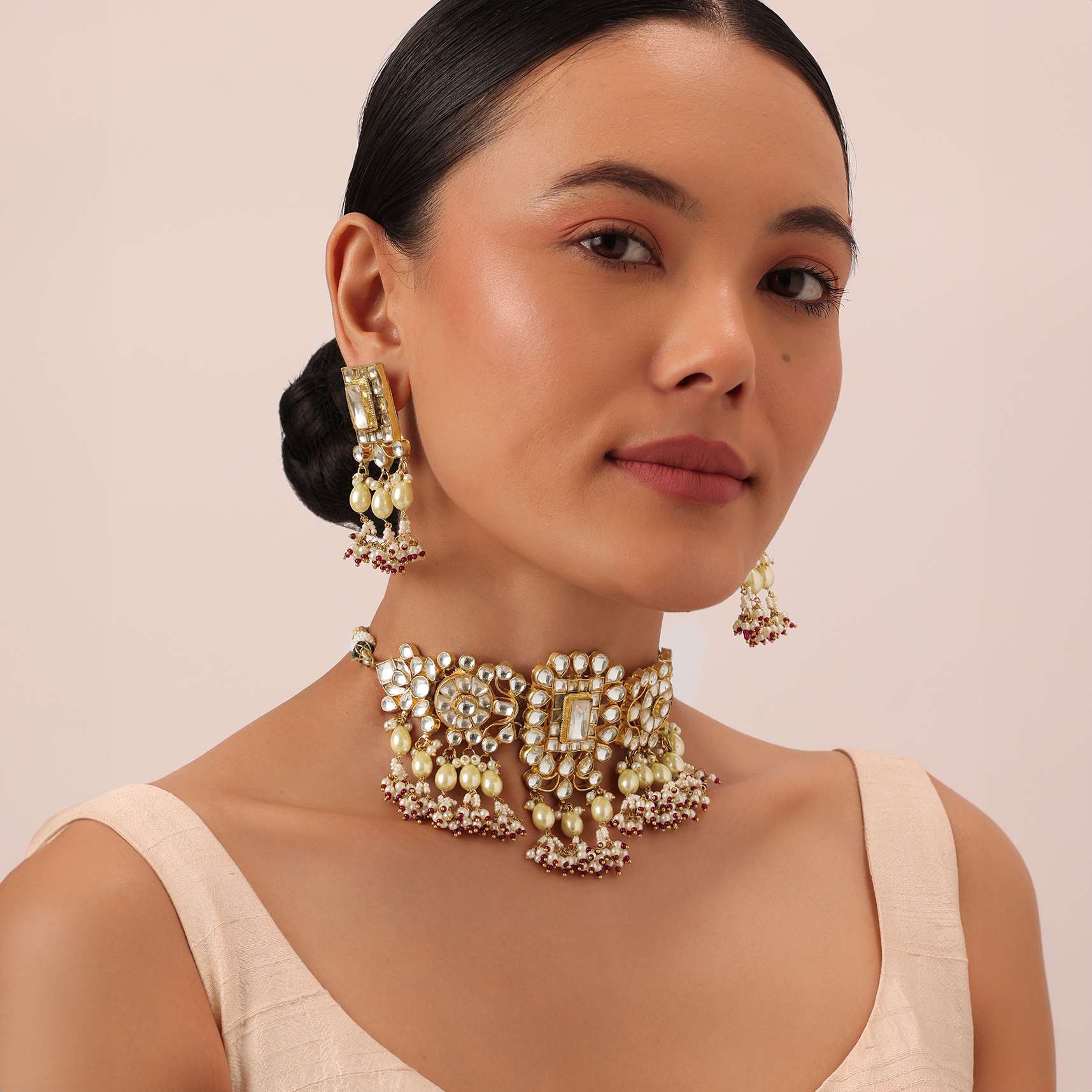 Introducing this exquisite gold finish kundan polki choker and earring set with pearls and beads, a stunning set that exudes elegance and beauty. This gorgeous set is handcrafted by skilled artisans using the finest quality materials and intricate craftsmanship, making it a timeless piece that will be treasured for years to come. The jewelry set is polished and anti-tarnish.Avoid contact with water, chemicals, harsh liquids, perfumes, etc.Do not wear this piece of jewelry while showering, gymming, swimming, etc.Hard contact must be avoided completely.Please keep the product away from moisture and humidity when not in use.Baroque pearls and Natural stones can range from minor aberrations to distinctly ovoid, curved, pinched, or lumpy shapes.Slight variations in design may vary. Awarded as the Most Trusted Brand, we're delivering styles you love, just as promised.