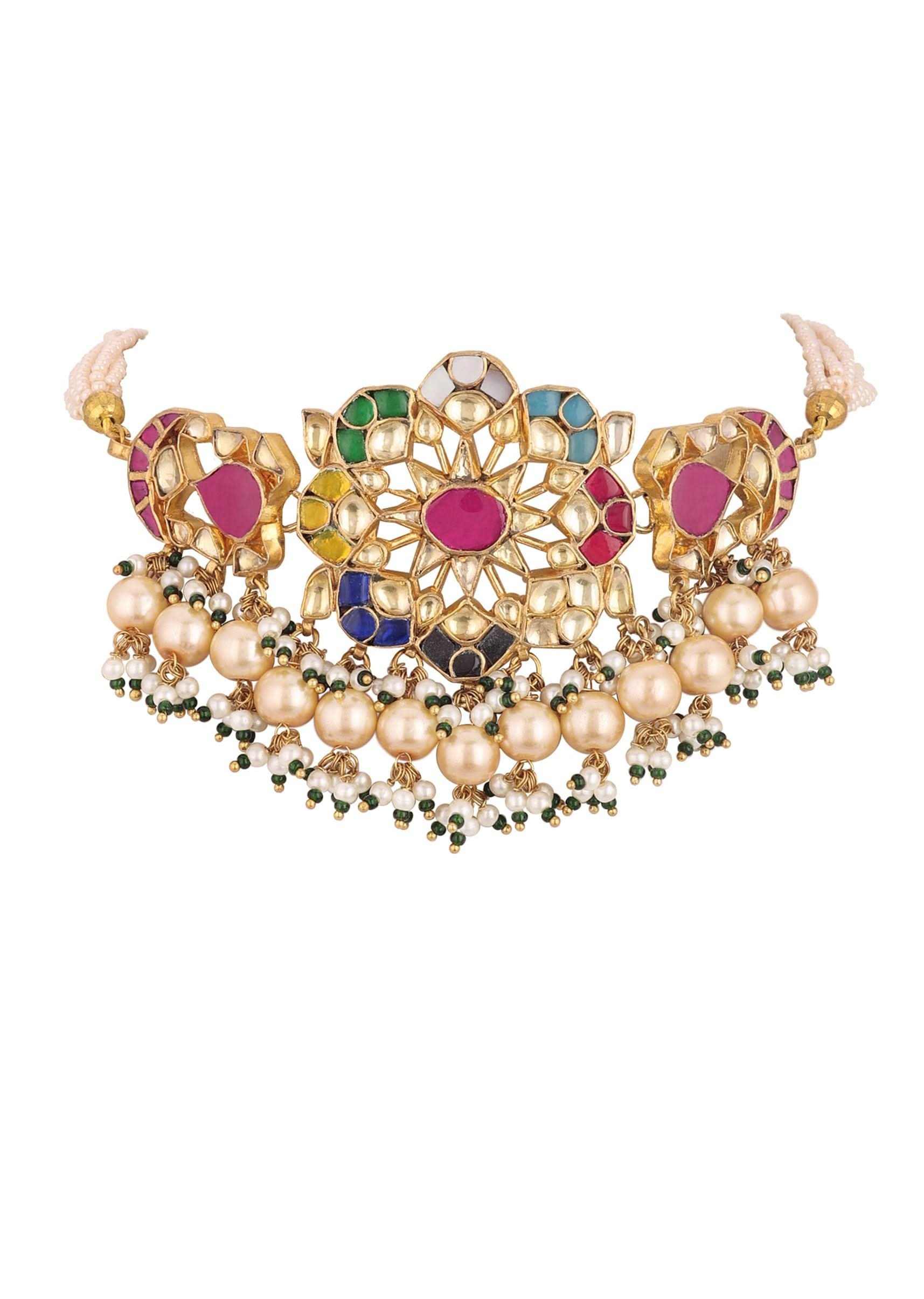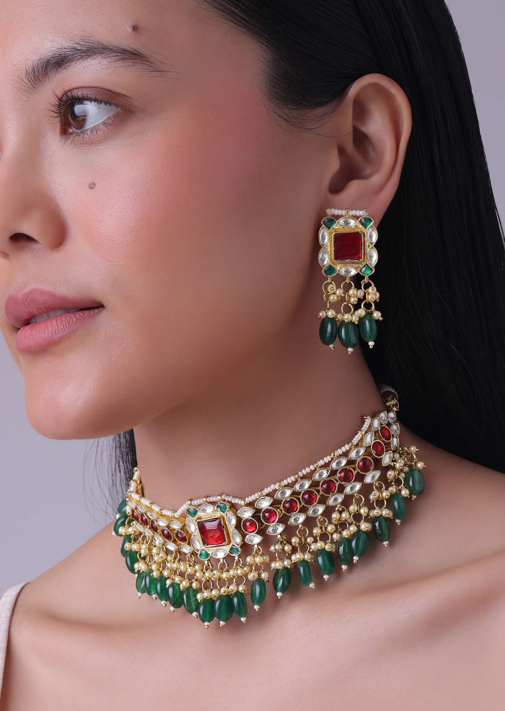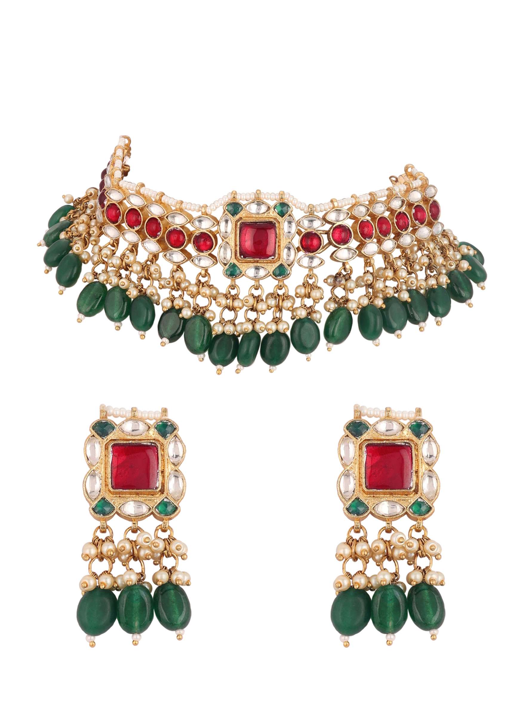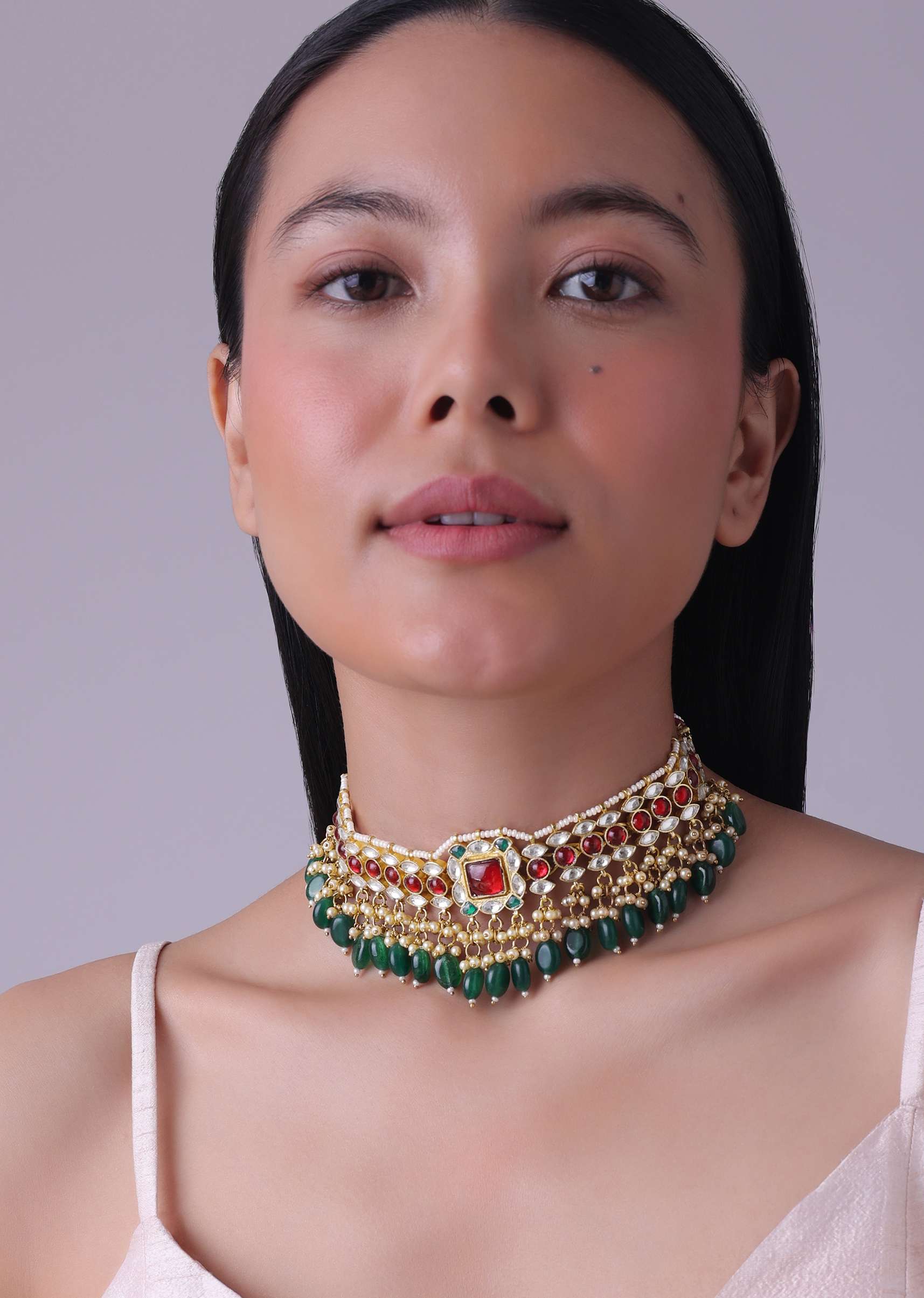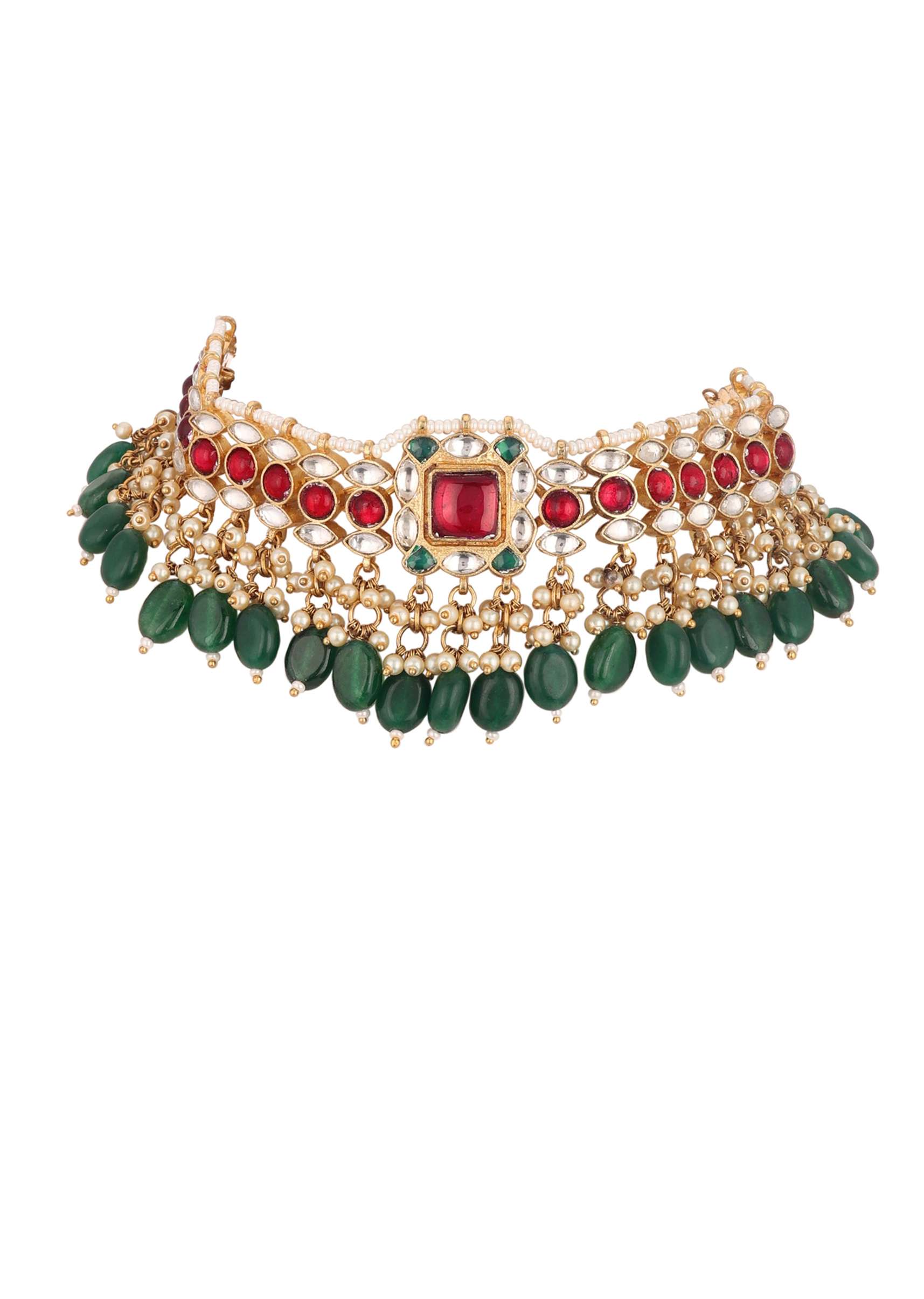Gold Finish Kundan Polki Red And Green Choker Set With Beads And Stones