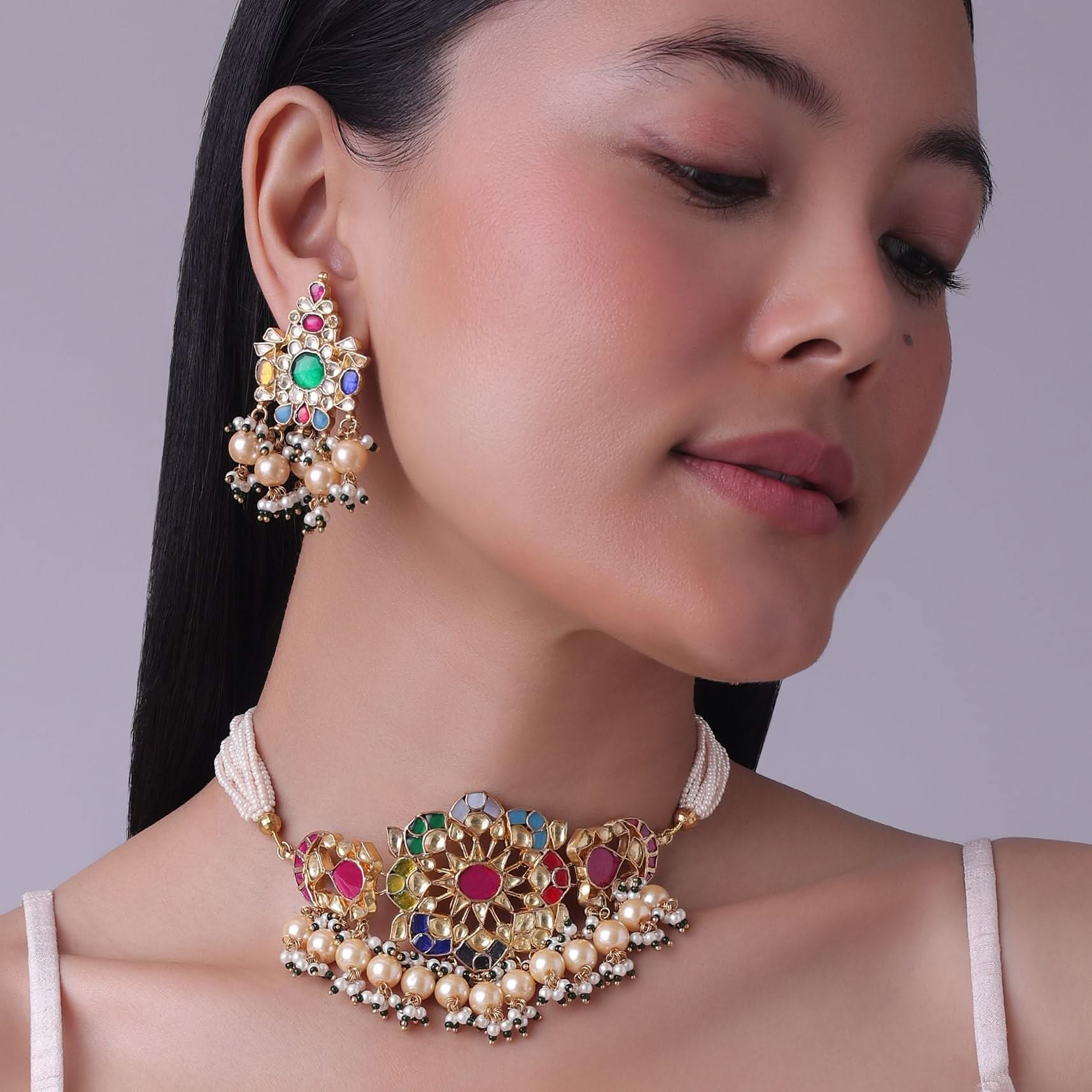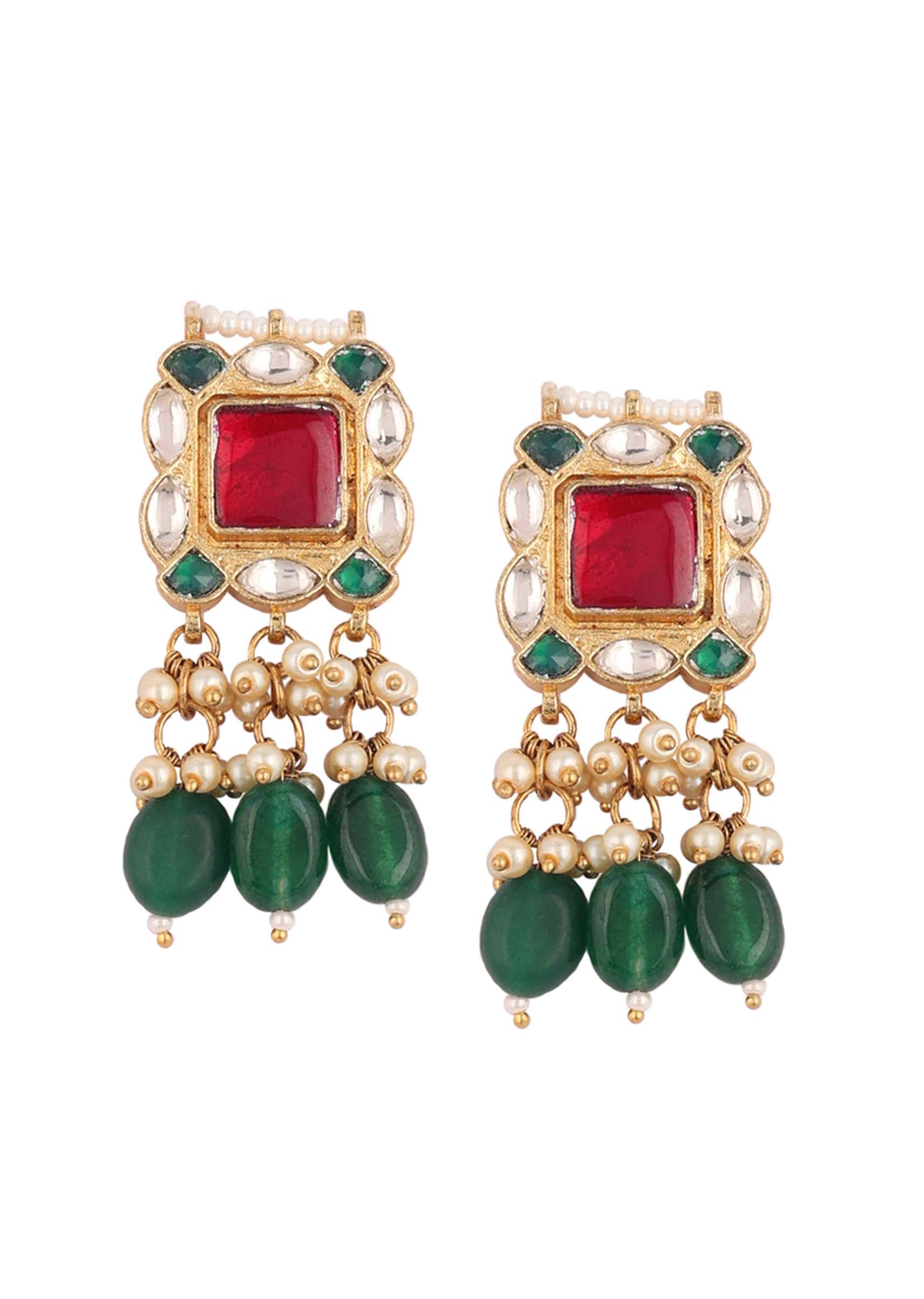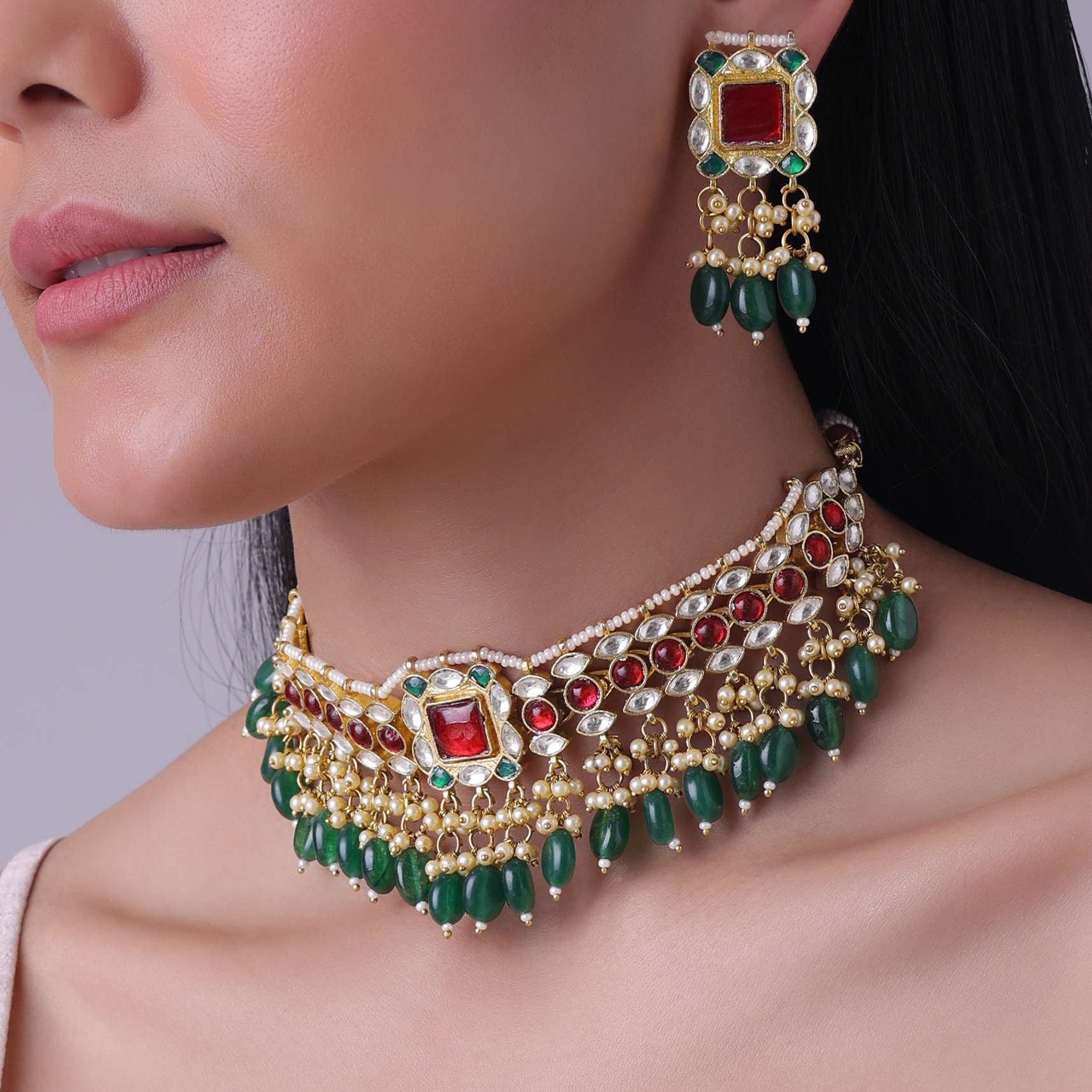 Introducing this exquisite gold finish red and green kundan polki choker and earring set with stones and beads, a stunning piece of jewelry that exudes elegance and beauty. This gorgeous set is handcrafted by skilled artisans using the finest quality materials and intricate craftsmanship, making it a timeless piece that will be treasured for years to come. The set features beautiful stones and bead detailing on the necklace, with green stone drops that are perfect for your upcoming festive occasions or weddings.The jewelry set is polished and anti-tarnish.Avoid contact with water, chemicals, harsh liquids, perfumes, etc.Do not wear this piece of jewelry while showering, gymming, swimming, etc.Hard contact must be avoided completely.Please keep the product away from moisture and humidity when not in use.Baroque pearls and Natural stones can range from minor aberrations to distinctly ovoid, curved, pinched, or lumpy shapes.Slight variations in design may vary. Awarded as the Most Trusted Brand, we're delivering styles you love, just as promised.