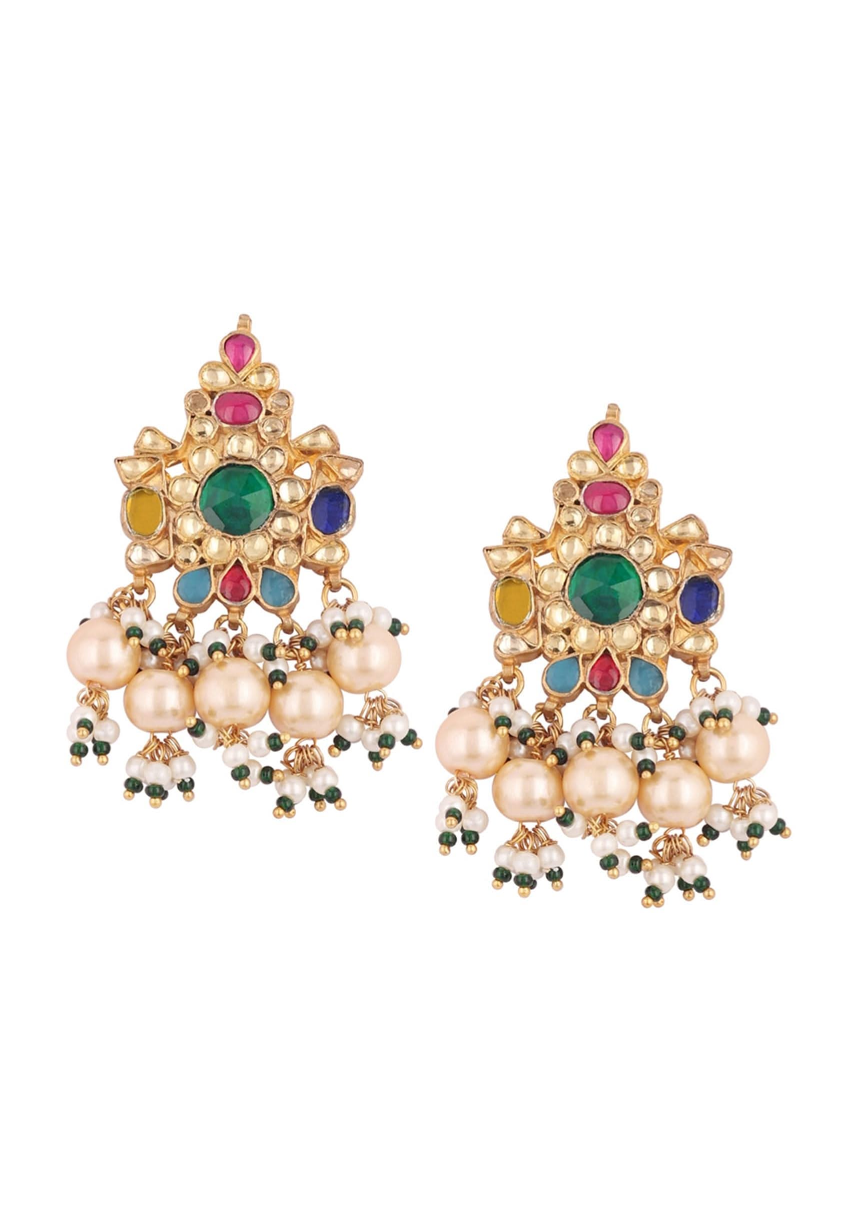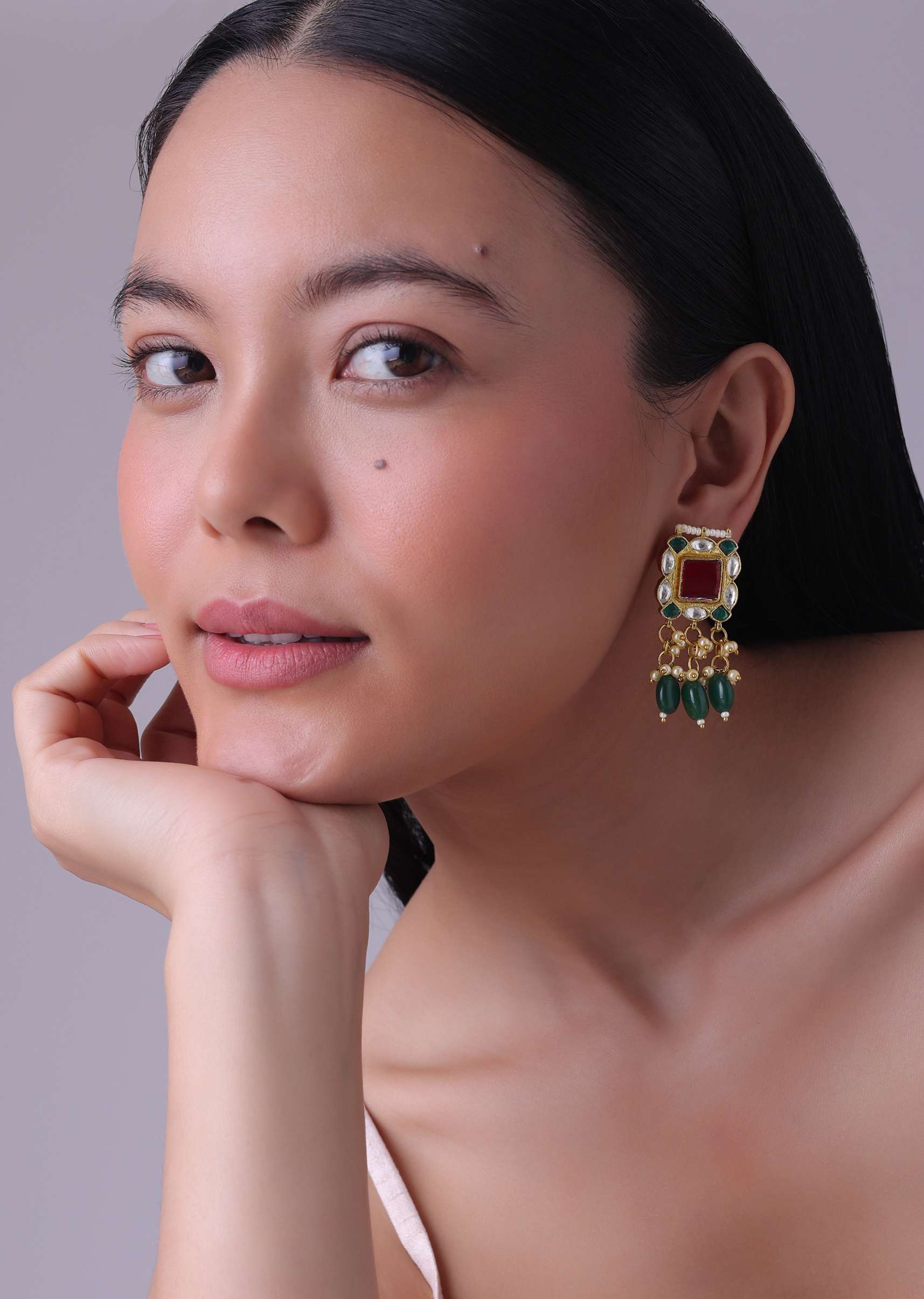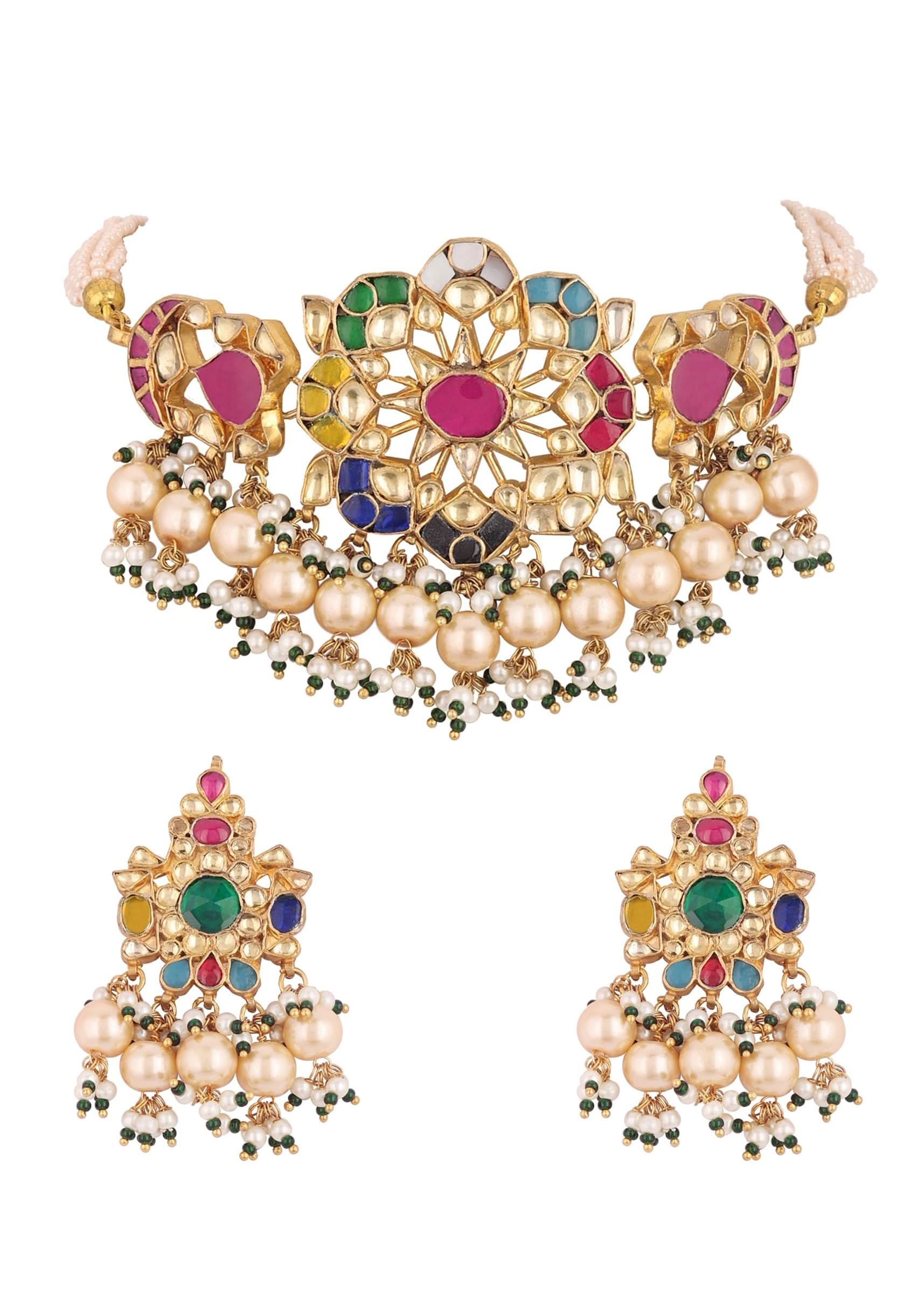 Introducing this exquisite gold finish red and green kundan polki choker and earring set with stones and beads, a stunning piece of jewelry that exudes elegance and beauty. This gorgeous set is handcrafted by skilled artisans using the finest quality materials and intricate craftsmanship, making it a timeless piece that will be treasured for years to come. The set features beautiful stones and bead detailing on the necklace, with green stone drops that are perfect for your upcoming festive occasions or weddings.The jewelry set is polished and anti-tarnish.Avoid contact with water, chemicals, harsh liquids, perfumes, etc.Do not wear this piece of jewelry while showering, gymming, swimming, etc.Hard contact must be avoided completely.Please keep the product away from moisture and humidity when not in use.Baroque pearls and Natural stones can range from minor aberrations to distinctly ovoid, curved, pinched, or lumpy shapes.Slight variations in design may vary. Awarded as the Most Trusted Brand, we're delivering styles you love, just as promised.