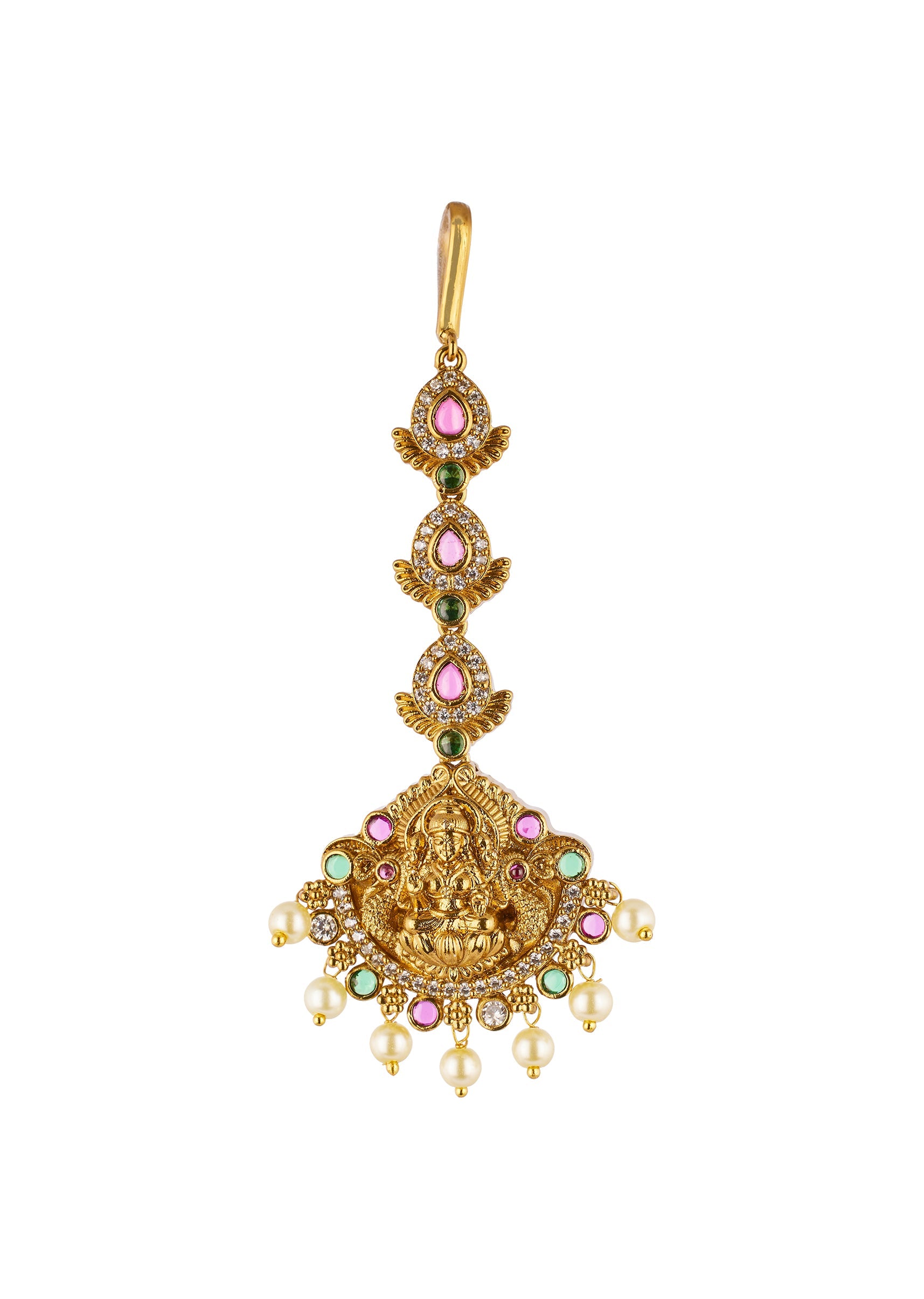 Gold Finish Maangtikka With Temple Style Motifs And Pink Green and Off White Simulated Stones