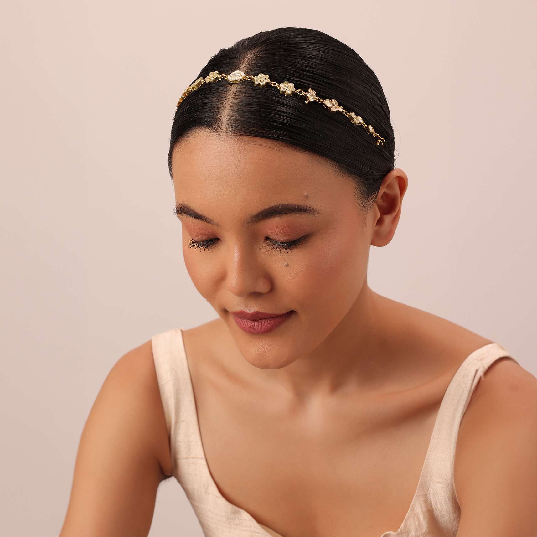 Add a contemporary touch to your ethnic outfits with our captivating headgear. Embellished with dazzling kundan this headgear is enhanced with meticulously designed motifs. Made from high quality mixed metal it displays a luxe gold-tone finish. Perfect for weddings and festive celebrations adorn this beauty for a stunning look. Keep away from moisture perfume alcohol and harsh chemicals.Spot clean only.Keep away from sharp objects. Awarded as the Most Trusted Brand, we're delivering styles you love, just as promised.