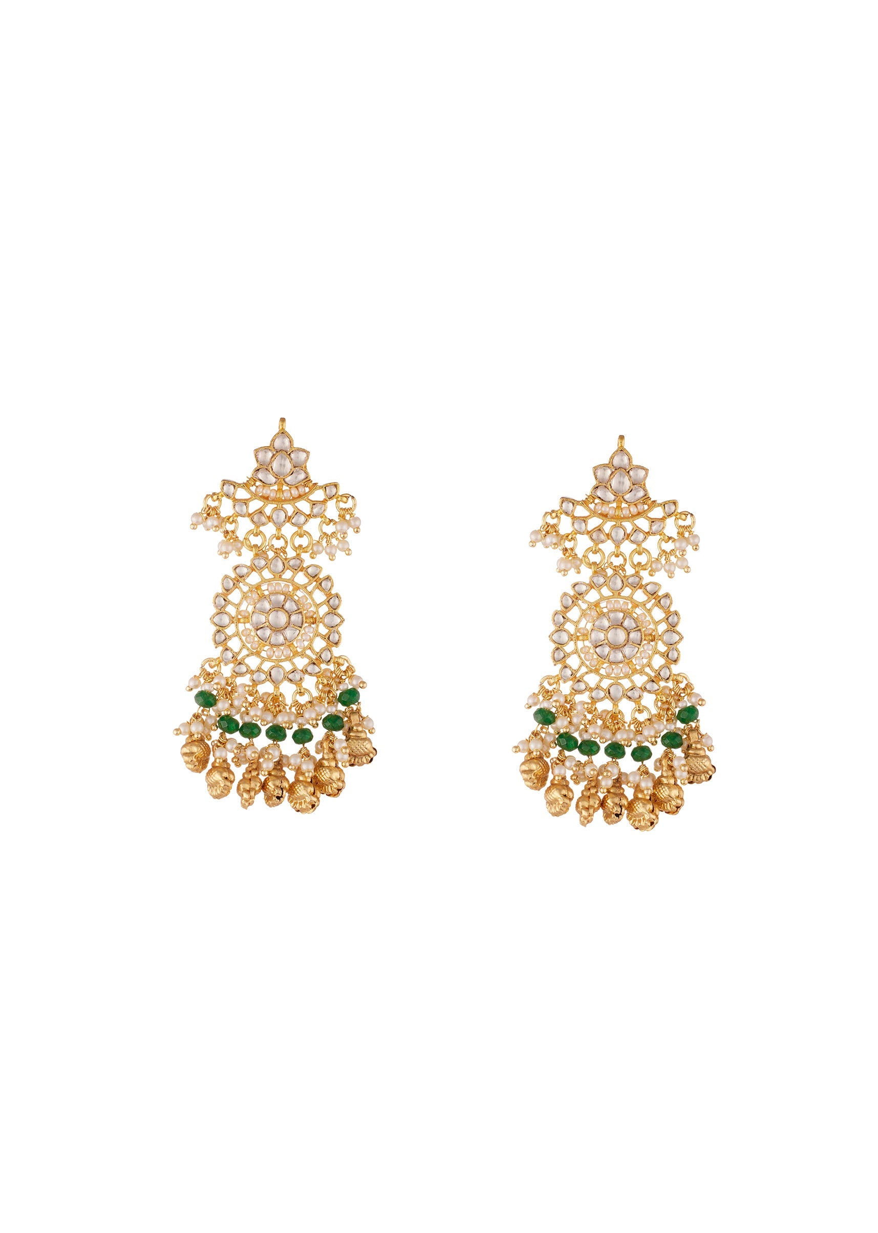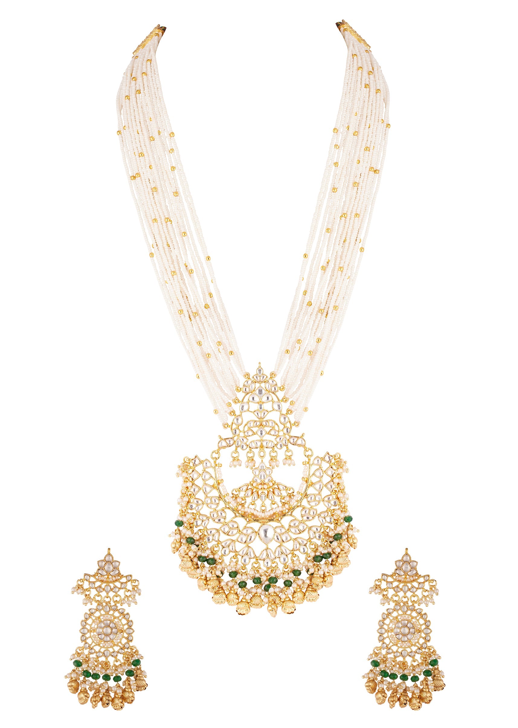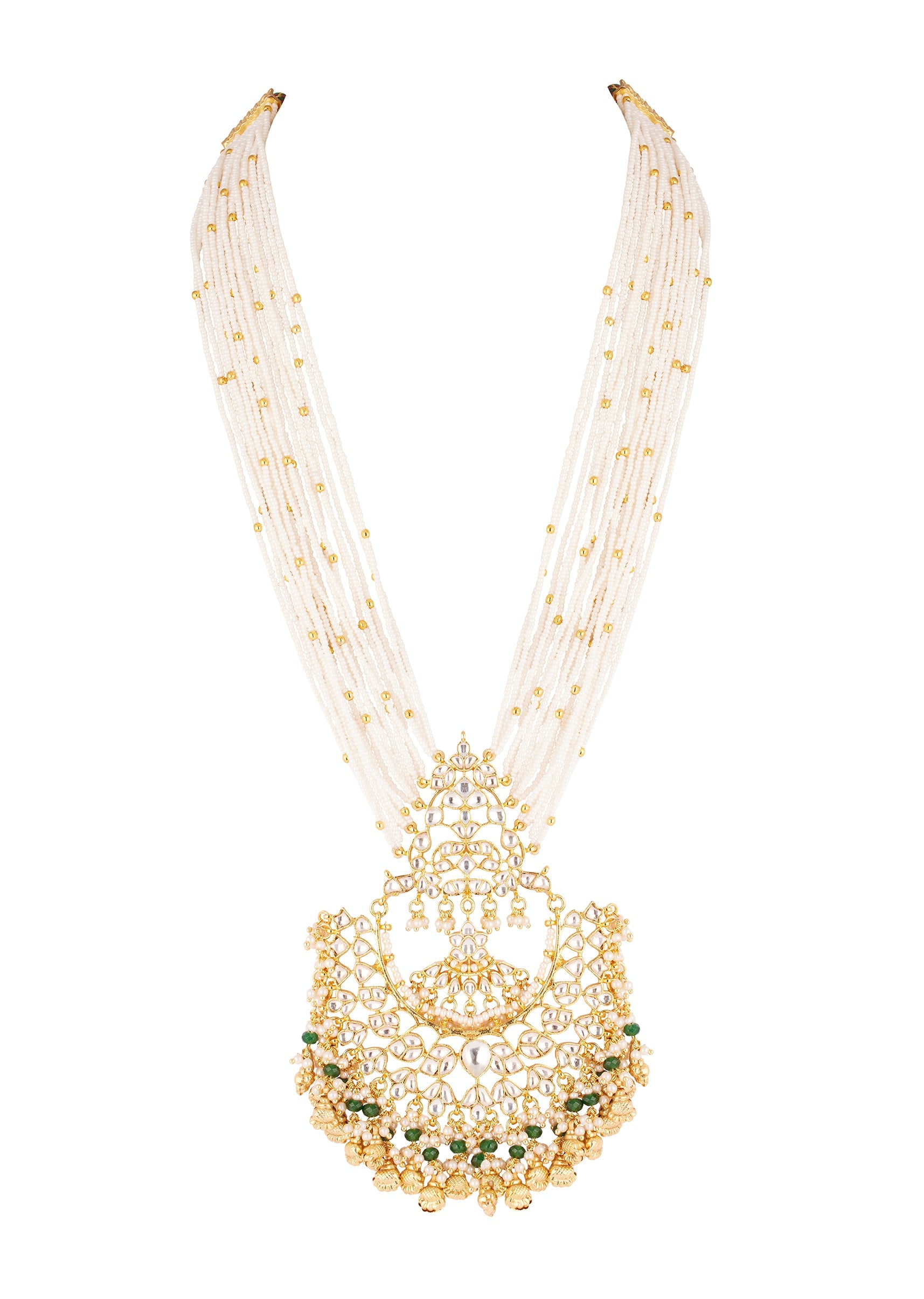 A graceful long necklace designed to bring traditional elegance to any festive or wedding look. The multi strand arrangement of small white moti beads creates a soft delicate drape highlighted with subtle gold accents for added richness. The statement crescent shaped kundan pendant is heavily set with clear stones and adorned with green beads that add depth colour and vibrance. Dangling gold bells complete the pendant with a charming rhythmic movement making this set perfect for mehendi sangeet or day weddings.