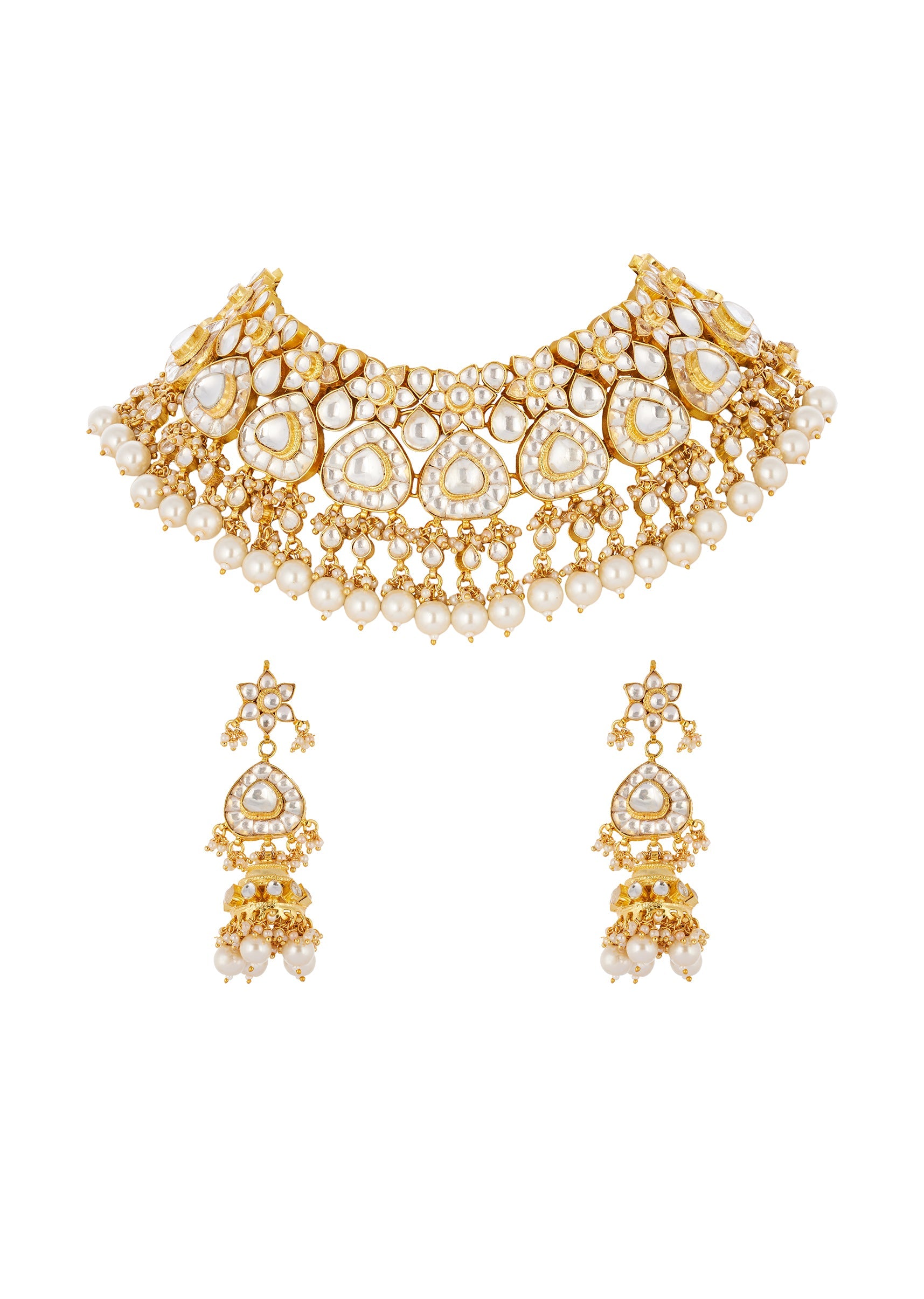 A refined white gold jewellery set crafted in the traditional Kundan Jadau technique, adorned with semi precious stones and delicate drops. Handcrafted Indian jewelry designed to bring timeless elegance to festive and wedding occasions. Awarded as the Most Trusted Brand, we're delivering styles you love, just as promised.