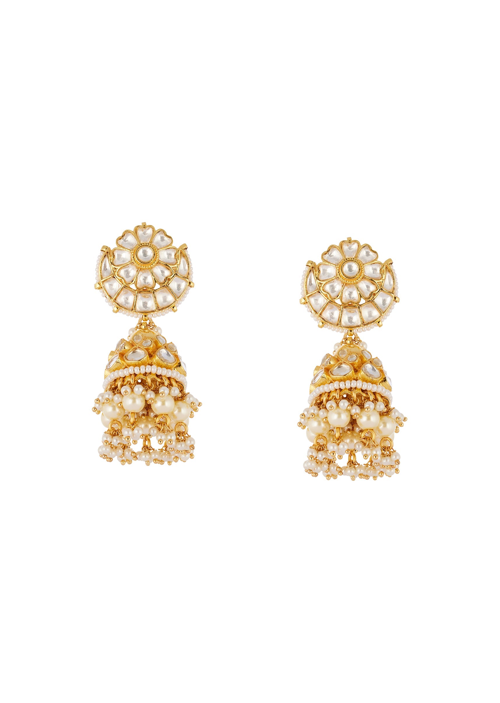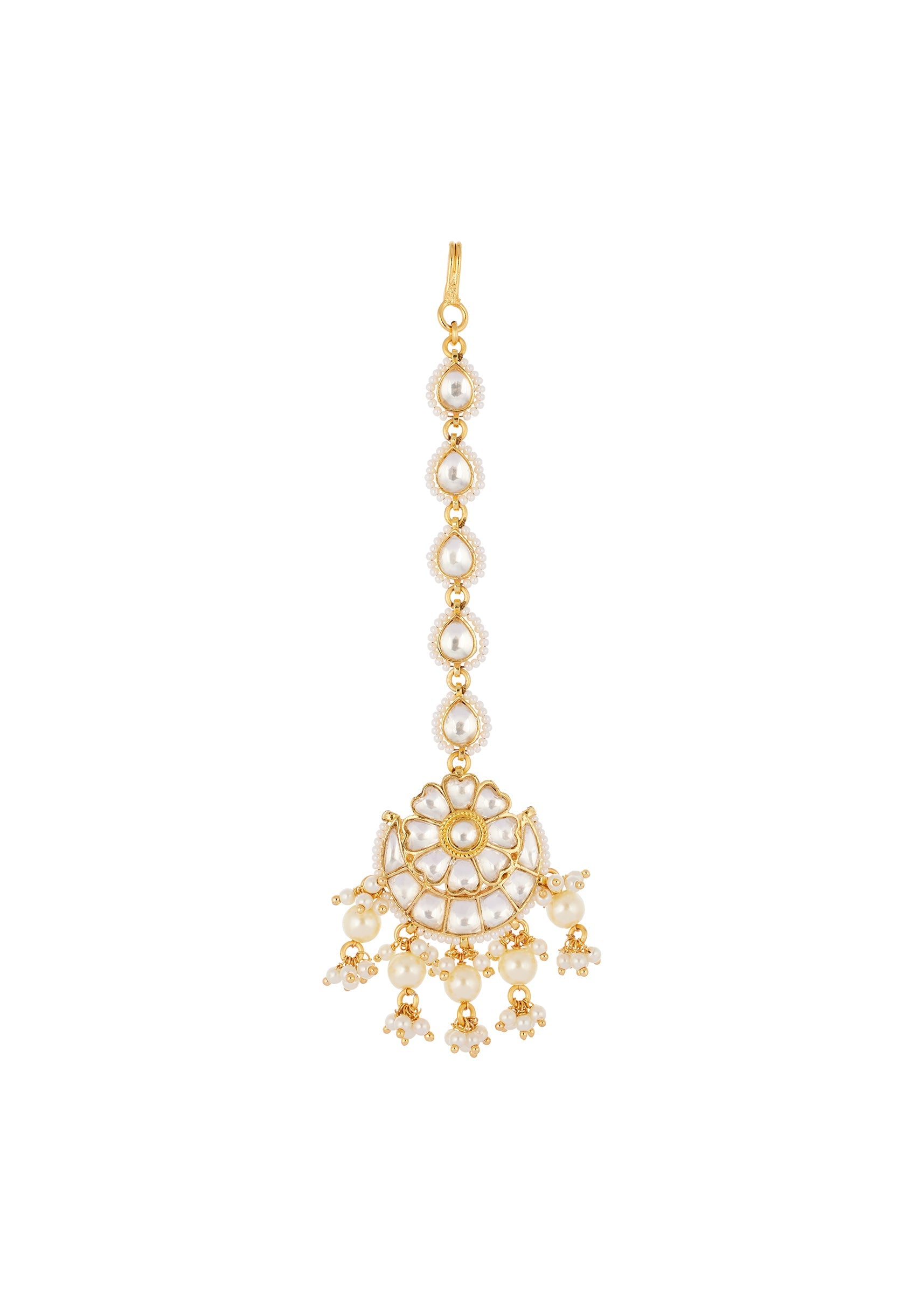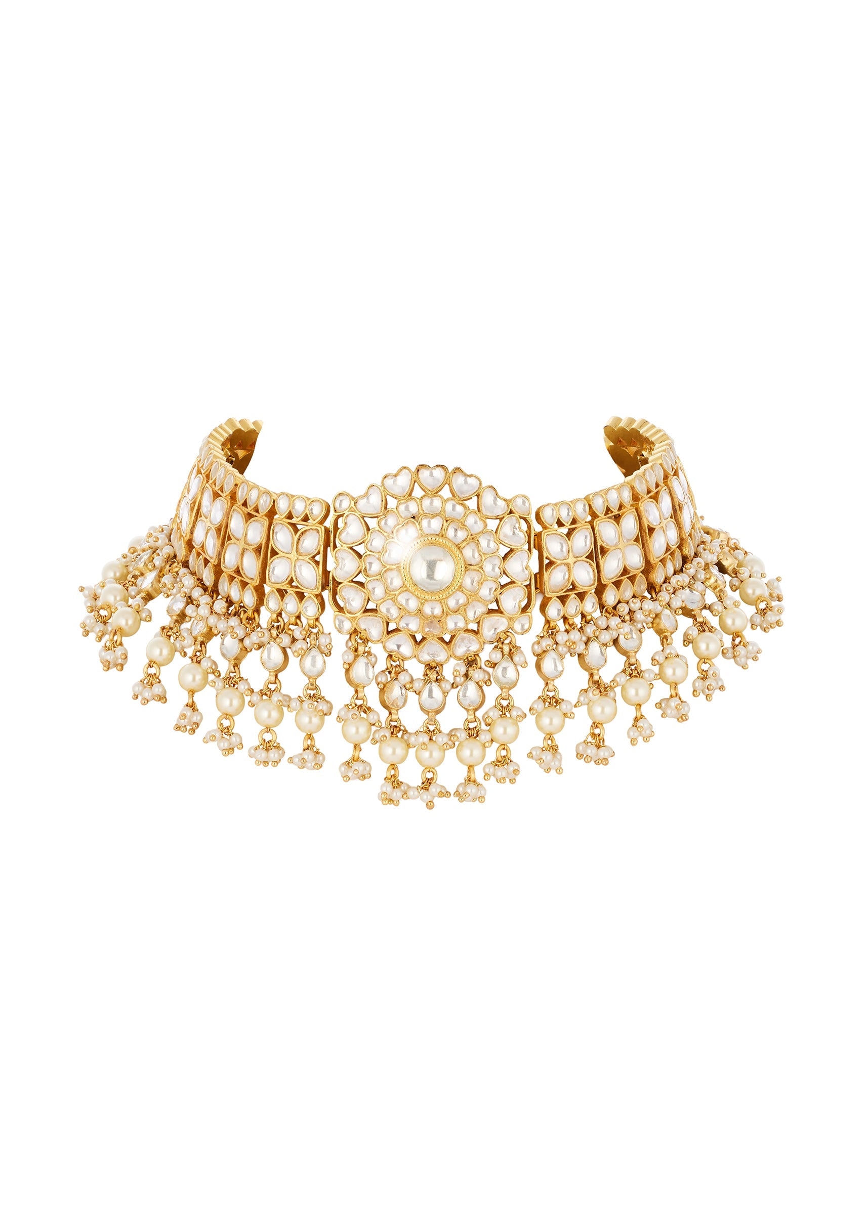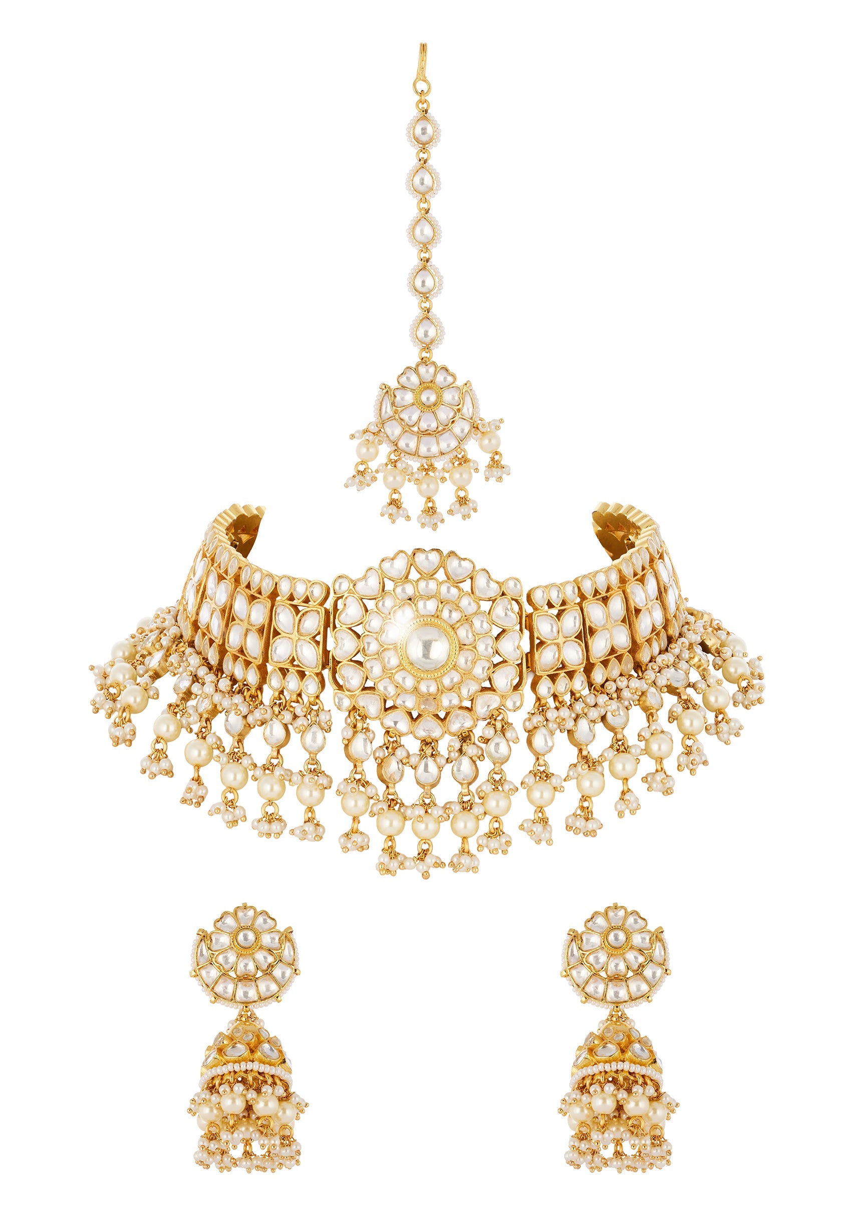 This white gold jewellery set is crafted in the traditional Kundan Jadau technique with semi precious stones and delicate drops. The handcrafted detailing brings timeless elegance with a soft festive glow that pairs beautifully with both classic and contemporary ensembles
