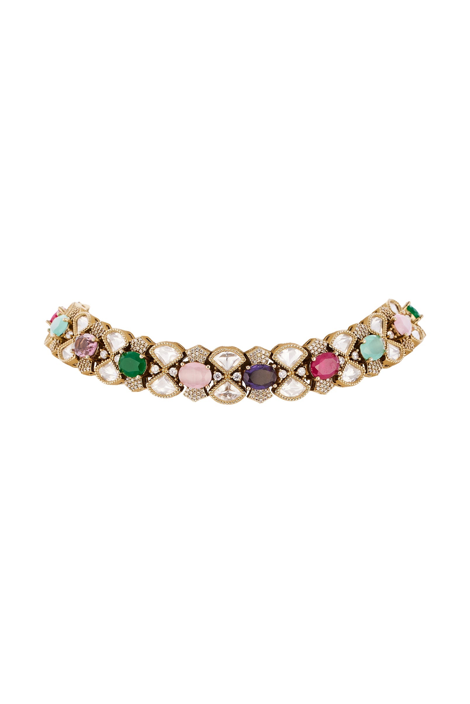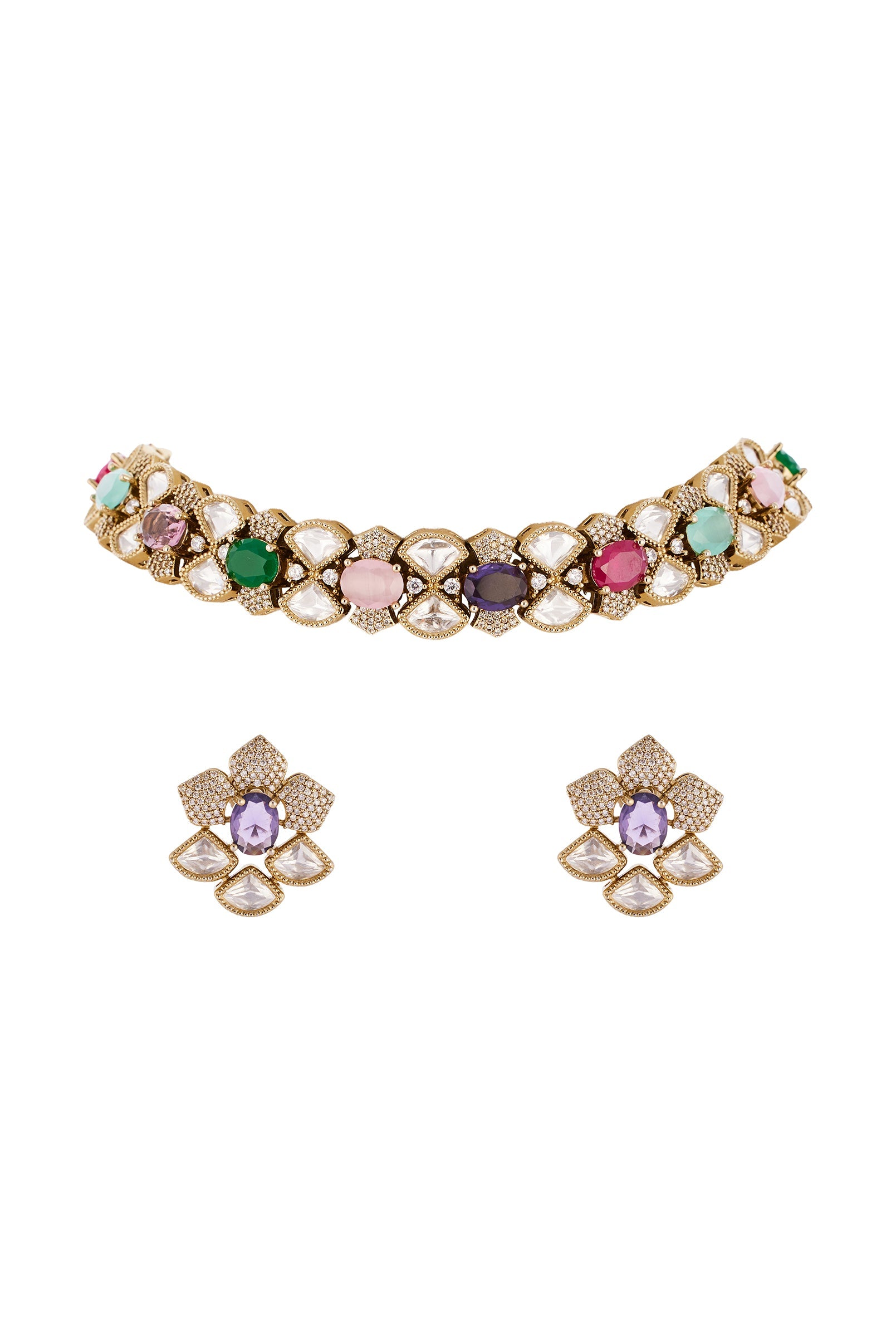 An exquisite blend of regal hues, this gold finish necklace set features uncut Polki set in the traditional Kundan Jadau technique. Handcrafted by skilled artisans, the necklace highlights striking tanzanite... More Product Details
