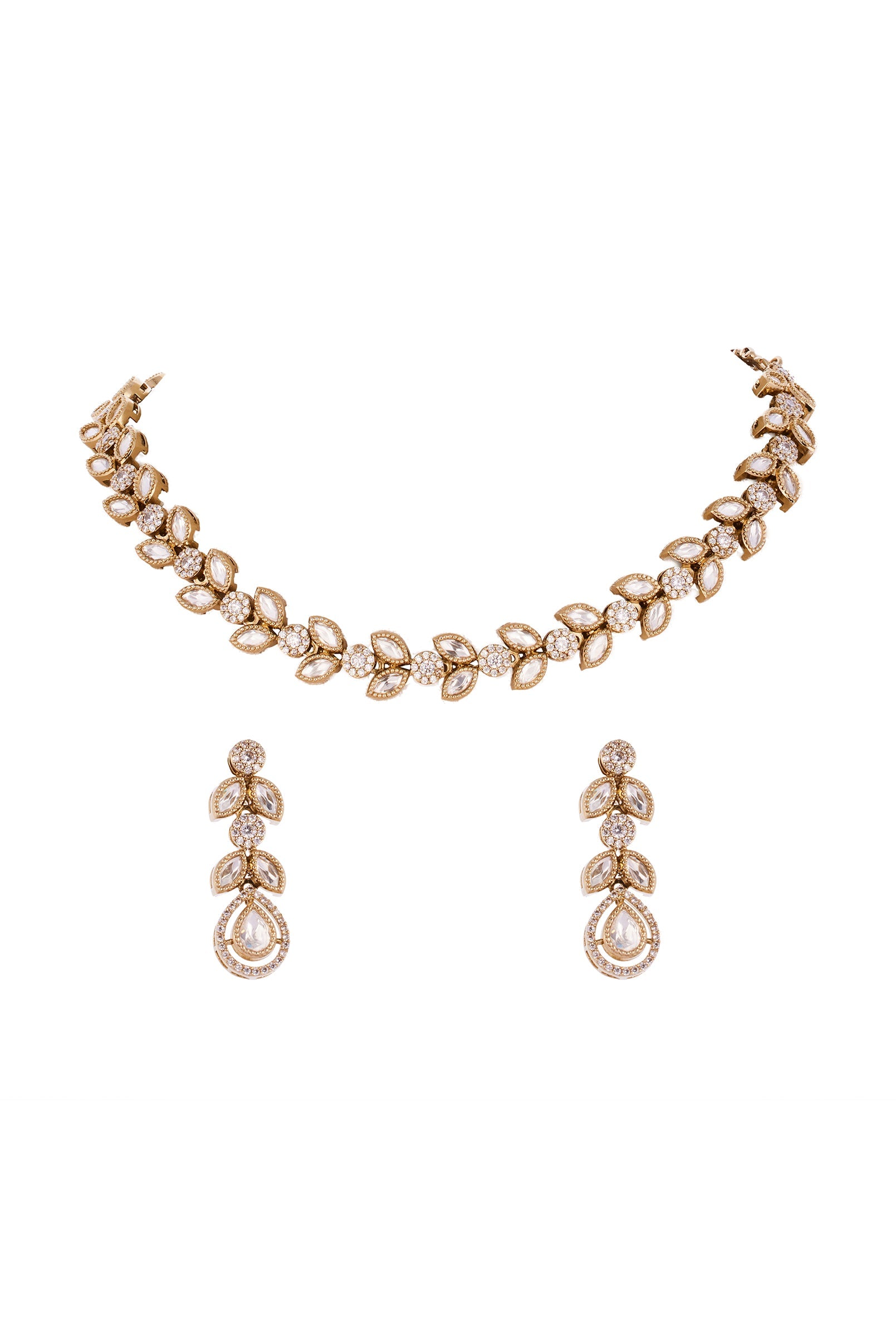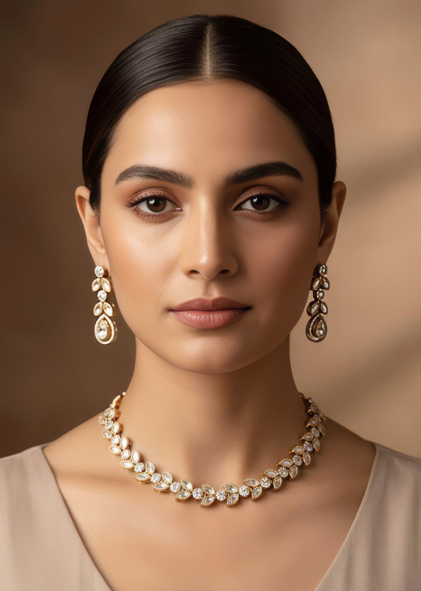A timeless gold and white necklace set adorned with Polki crafted using the traditional Kundan Jadau technique. Handcrafted by skilled artisans, this piece blends heritage detailing with elegant radiance, making it ideal for festive celebrations, weddings, engagements, and occasions where refined charm is desired.