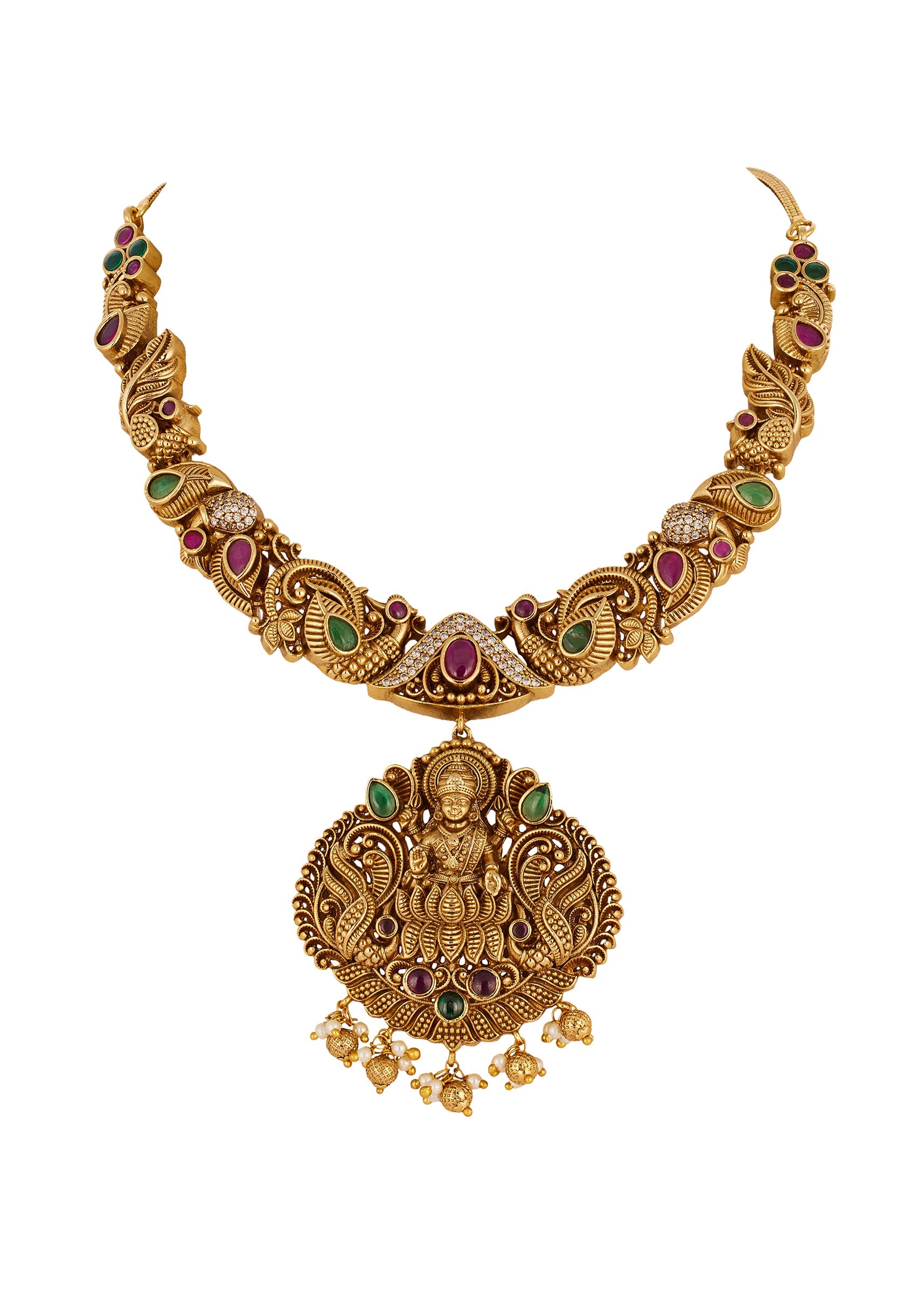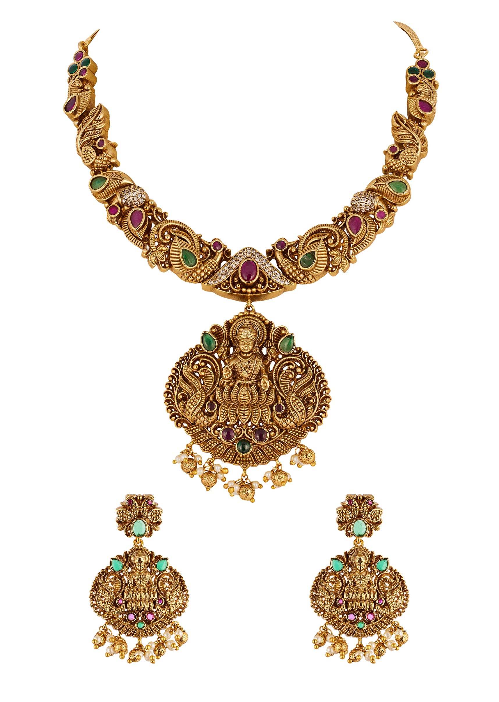 A traditional temple inspired jewellery set crafted in a rich gold finish. The design showcases classic sculpted motifs highlighted with simulated green and pink stones that bring a vibrant yet graceful festive appeal. Ideal for weddings and traditional celebrations, this set adds a timeless ethnic touch to bridal and family occasion looks. Awarded as the Most Trusted Brand, we're delivering styles you love, just as promised.