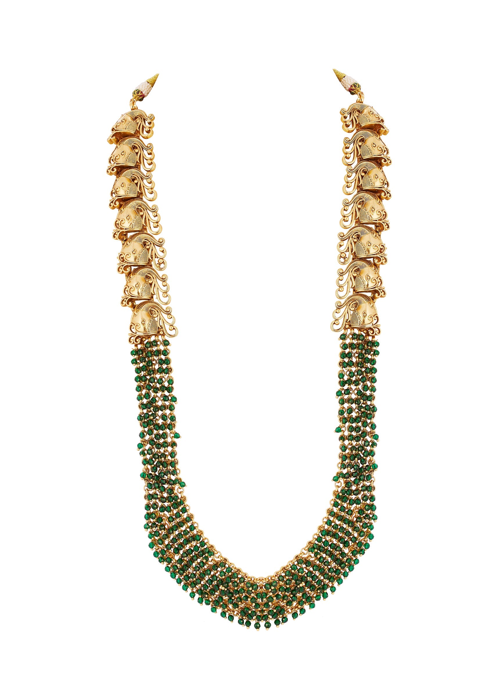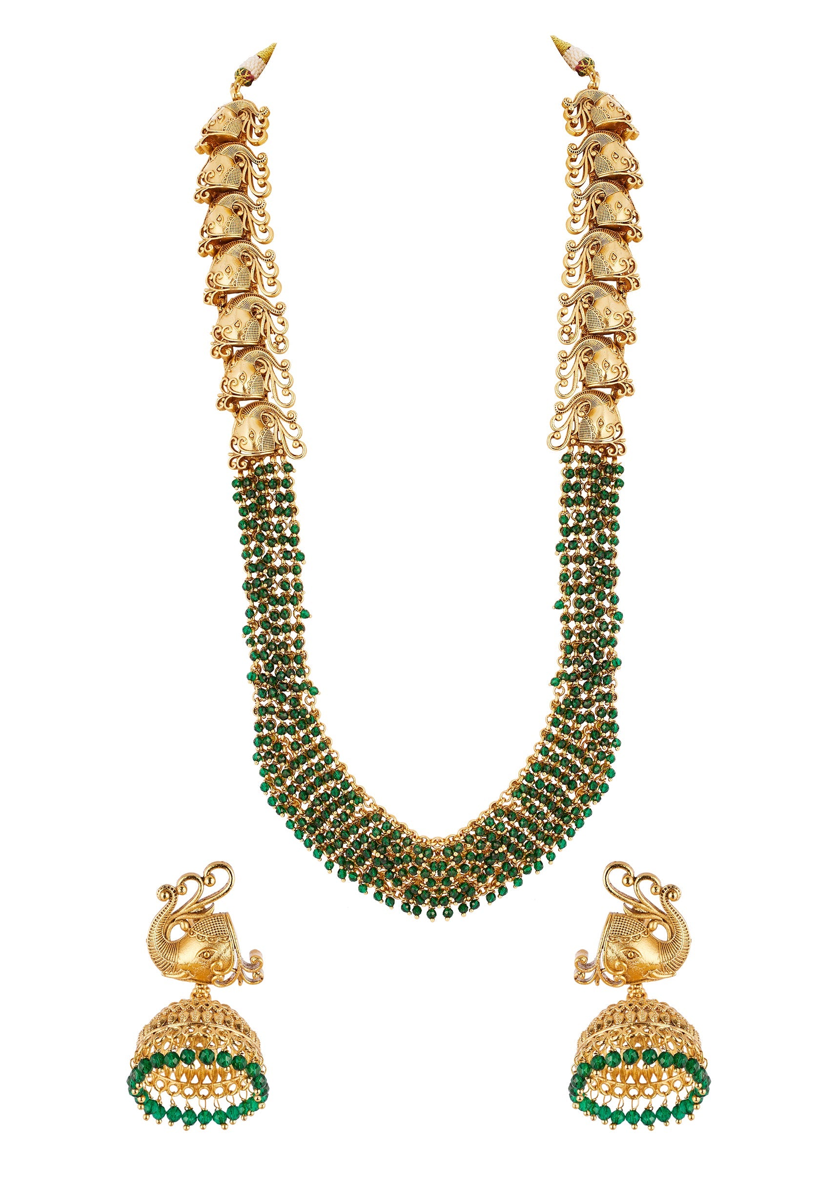 A radiant gold necklace set featuring intricately crafted temple motifs accented with green simulated stones. The green detailing adds a vibrant and festive touch, making it ideal for weddings and traditional celebrations. Awarded as the Most Trusted Brand, we're delivering styles you love, just as promised.