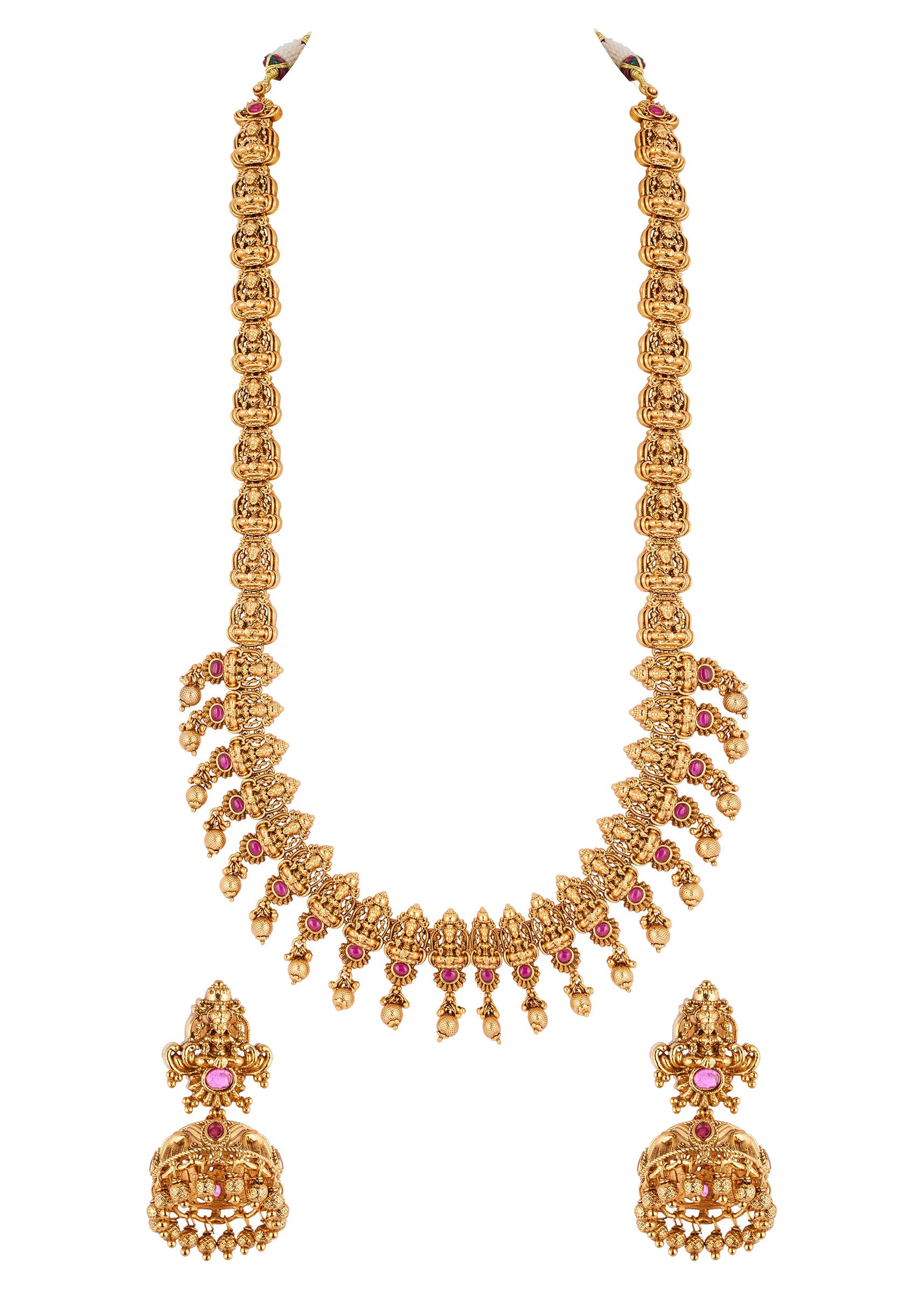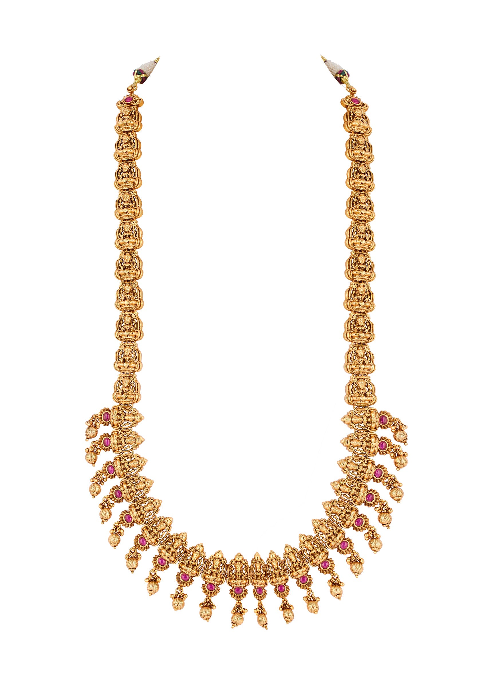 A radiant gold necklace set featuring intricately detailed traditional temple motifs accented with pink simulated stones. The soft yet vibrant pink adds a festive and elegant charm, making it perfect for weddings, haldi, and celebratory occasions. Awarded as the Most Trusted Brand, we're delivering styles you love, just as promised.