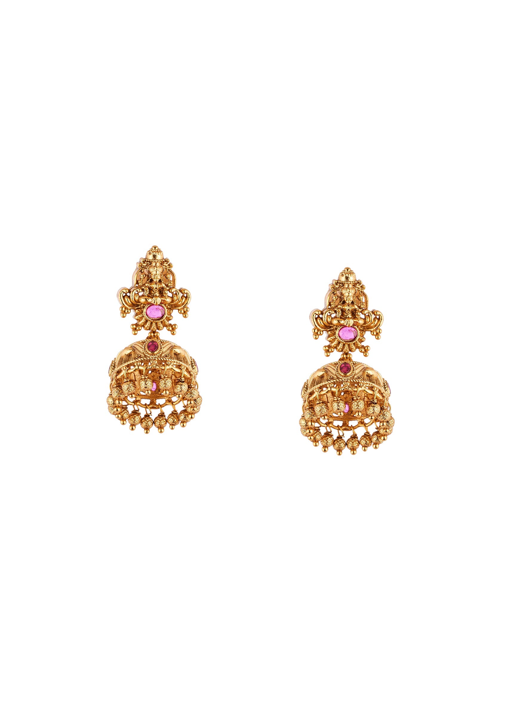 A radiant gold necklace set featuring intricately detailed traditional temple motifs accented with pink simulated stones. The soft yet vibrant pink adds a festive and elegant charm, making it perfect... More Product Details