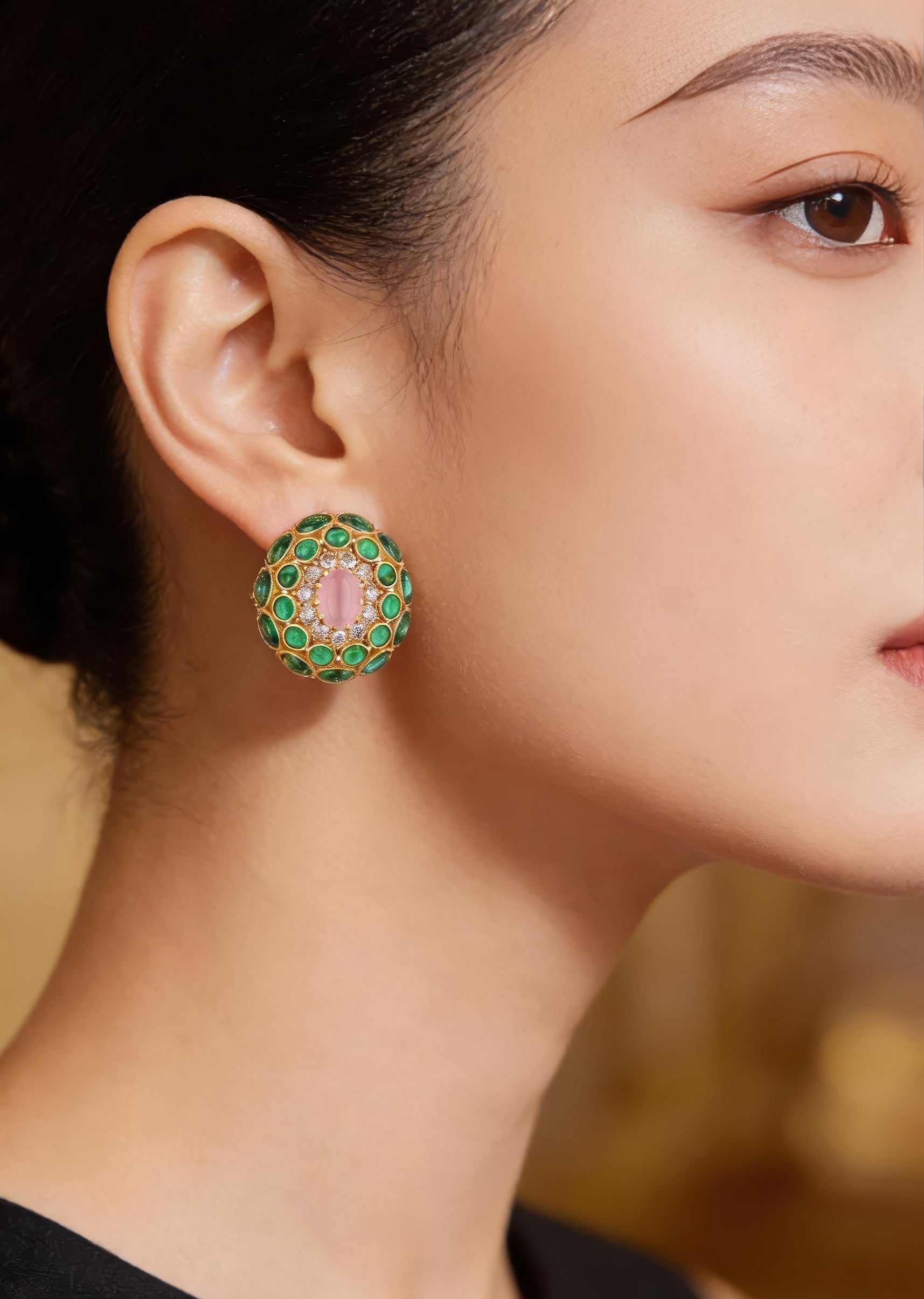A traditional pair of ornate cabochon stud earrings crafted in a rich gold finish, featuring a pink oval center stone surrounded by green and clear stone halos. The layered design combines vibrant colours with classic detailing, making it perfect for festive and celebratory occasions. Awarded as the Most Trusted Brand, we're delivering styles you love, just as promised.