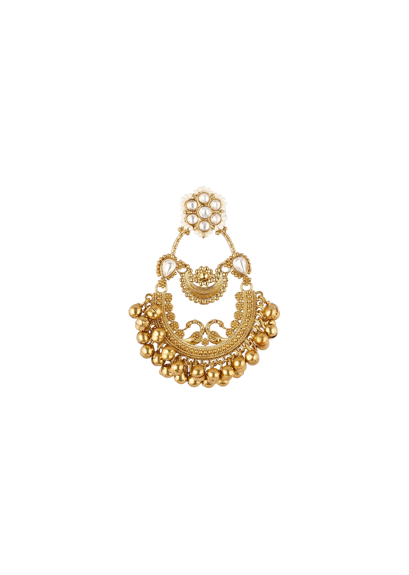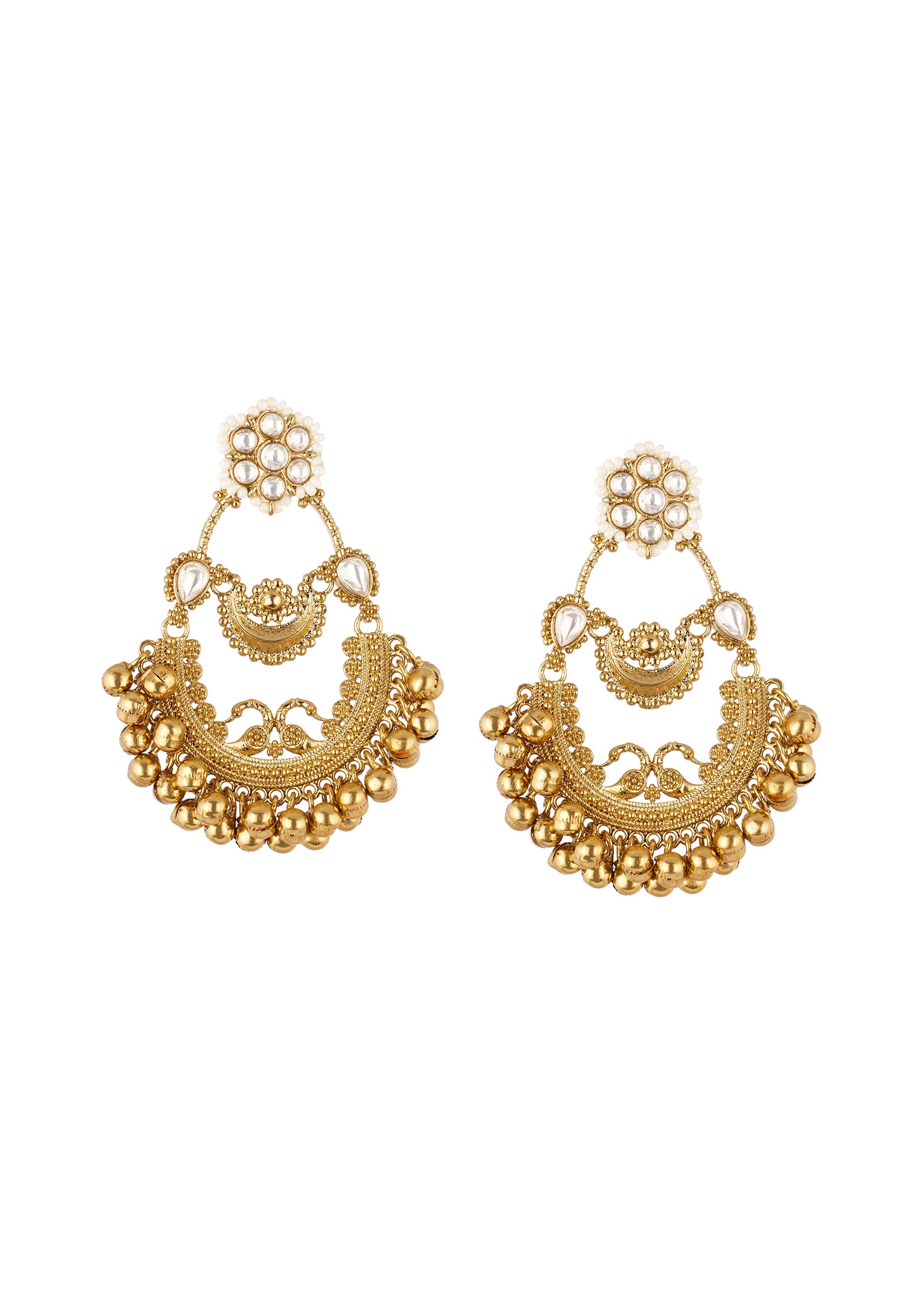 A traditional pair of ornate chandbali earrings crafted in a rich gold finish, featuring intricate peacock filigree detailing. Adorned with polki style accents and finished with golden ghungroo droplets, these earrings exude classic festive elegance and movement, making them ideal for weddings and special occasions. Awarded as the Most Trusted Brand, we're delivering styles you love, just as promised.