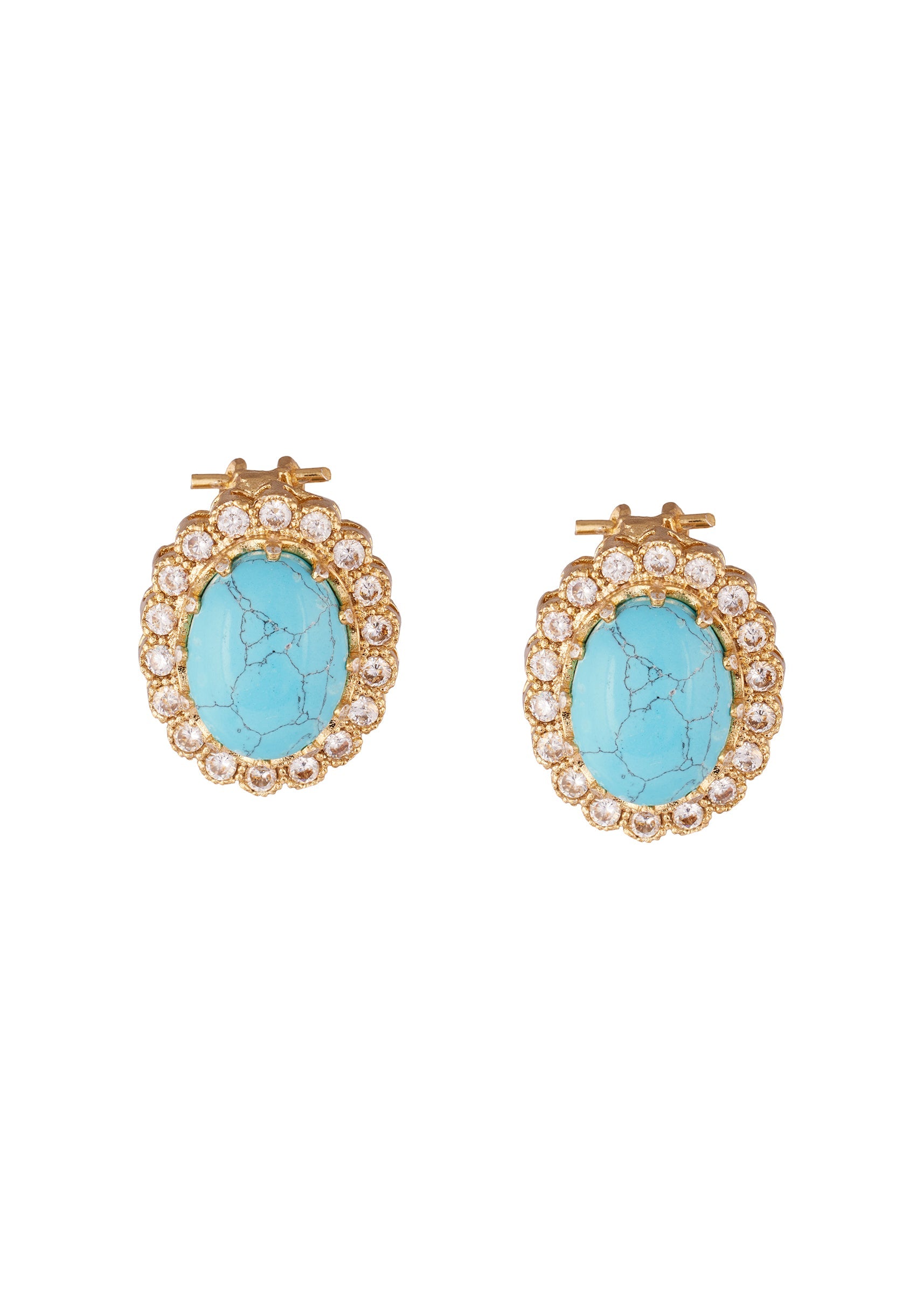 Gold Finish Oval Stud Earrings With Dome Cut Turquoise Stone And Scalloped White CZ Halo