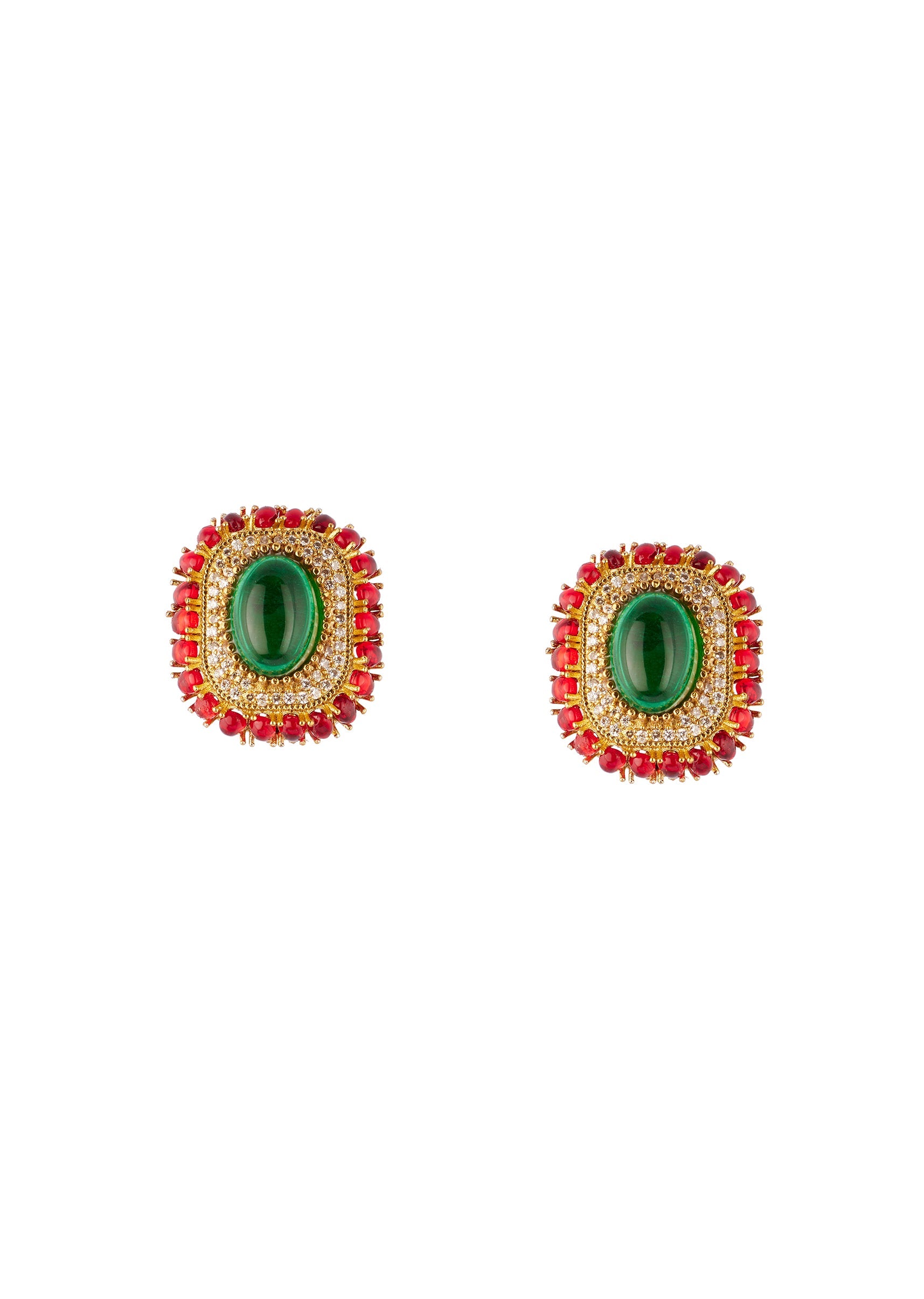 A traditional pair of oval stud earrings crafted in a rich gold finish, featuring a large green center stone surrounded by a textured border of vibrant red cabochon stones. The striking colour combination and intricate detailing make these earrings perfect for festive and celebratory occasions. Awarded as the Most Trusted Brand, we're delivering styles you love, just as promised.