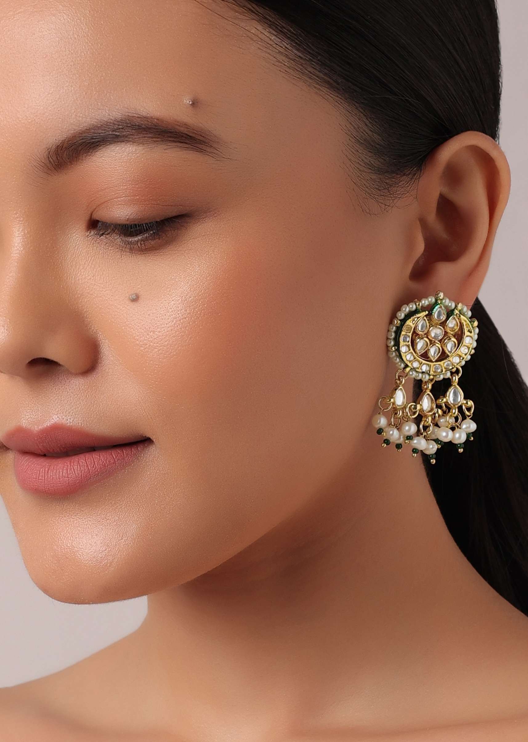 Upgrade your ethnic jewellery collection with this elegant set. Featuring a minimal and chic design it flaunts stunning craftsmanship. Set in a gold tone finish it is made from high... More Product Details