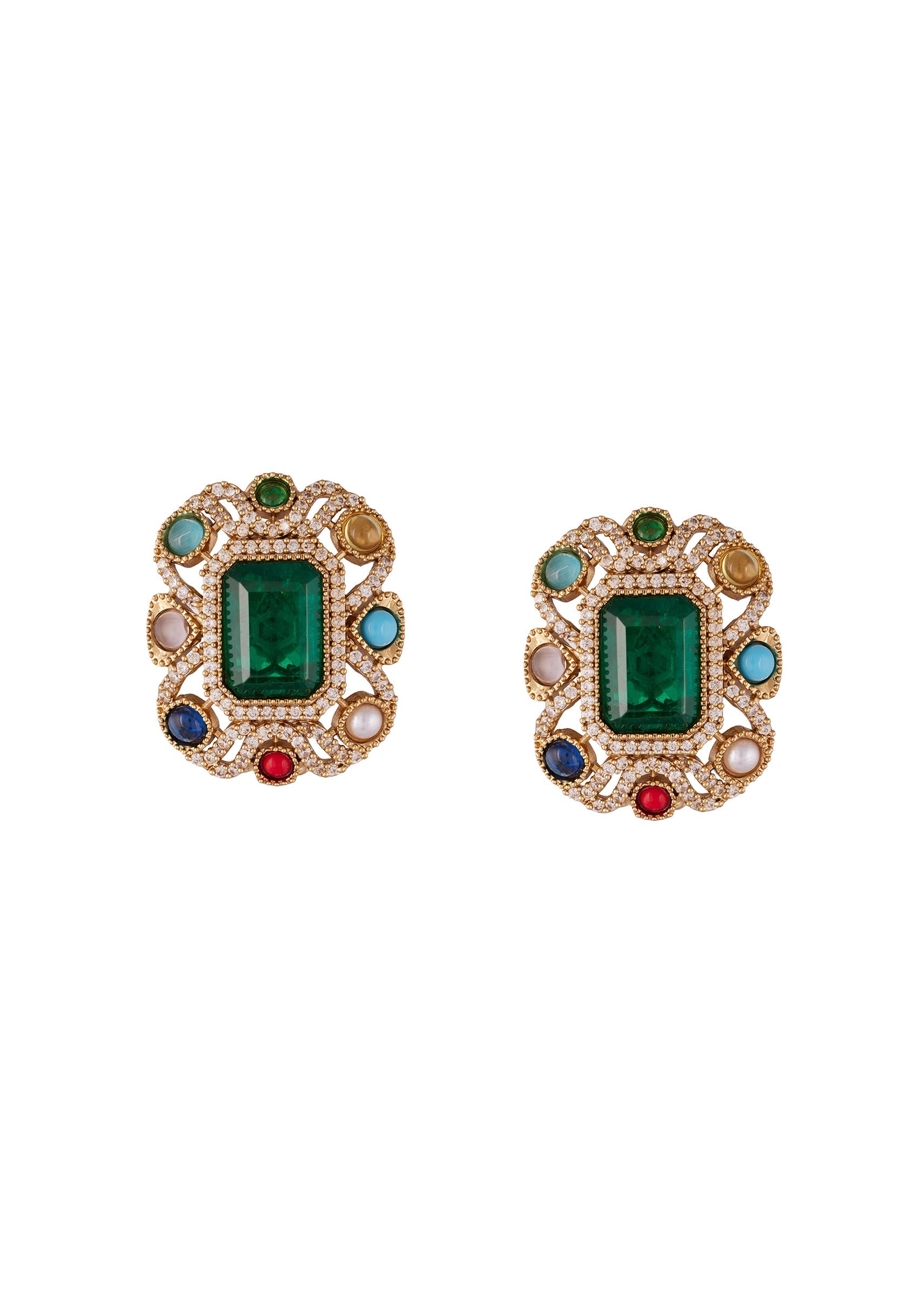 Gold Finish Rectangular Statement Earrings With Faceted Green Stone White Cz Halo And Navratna Dome Cut Border