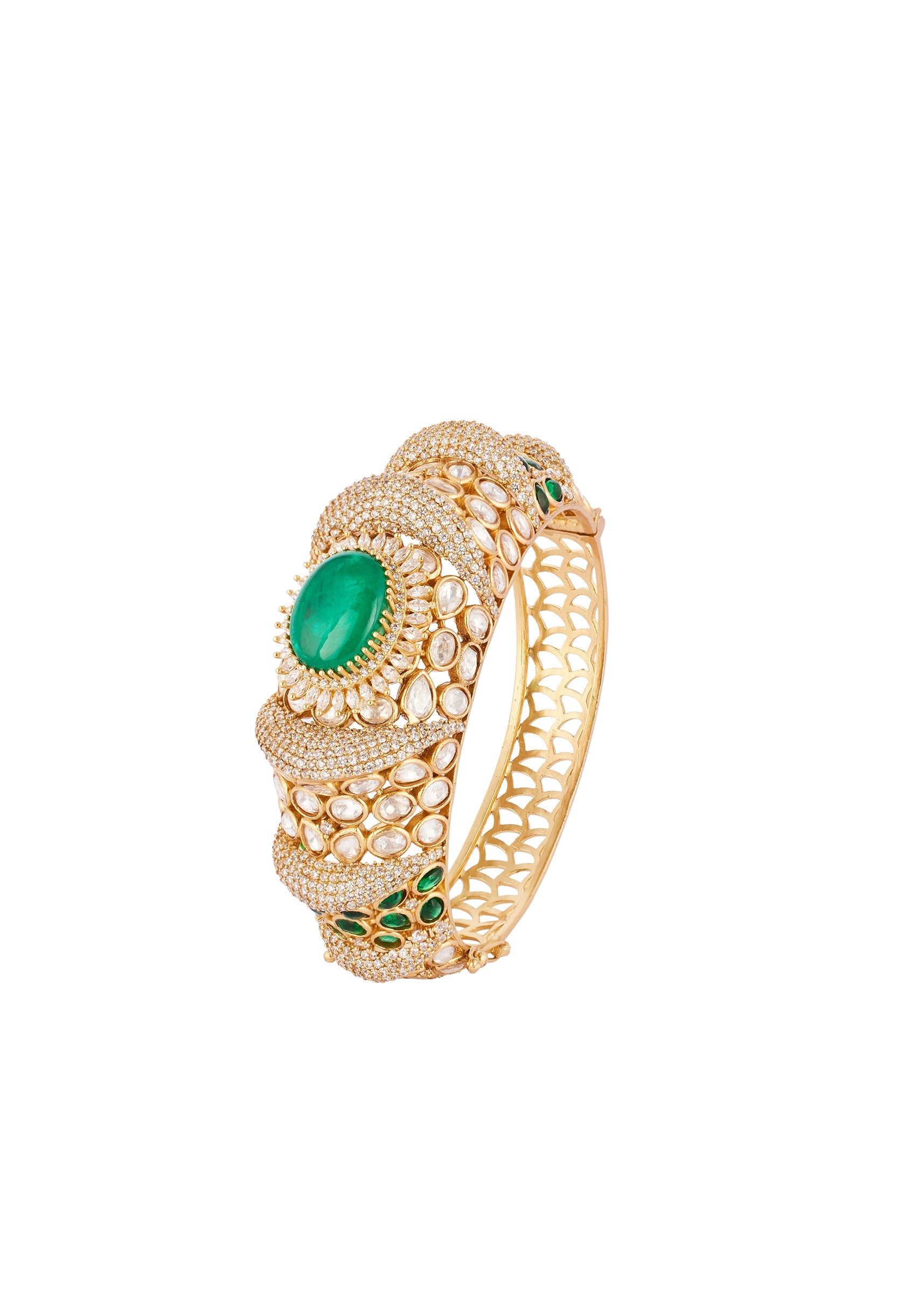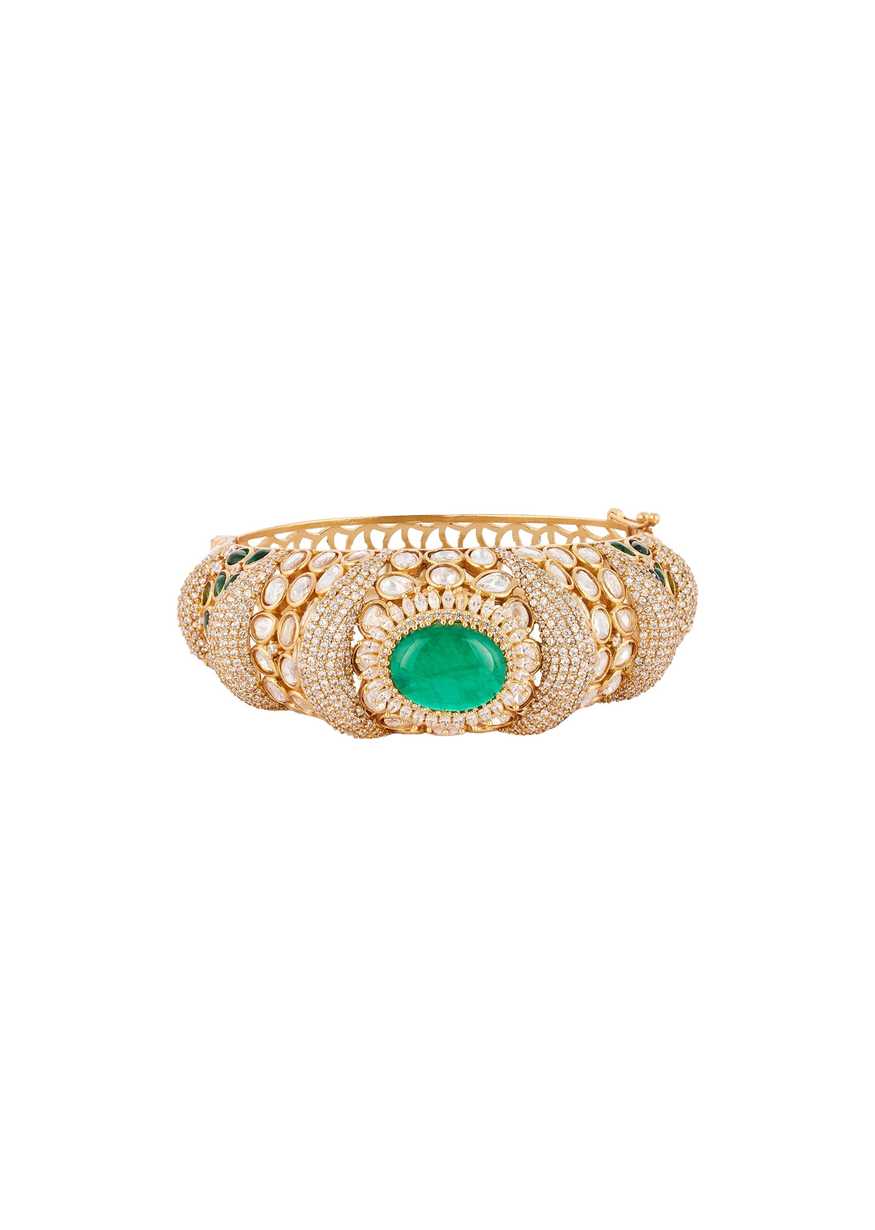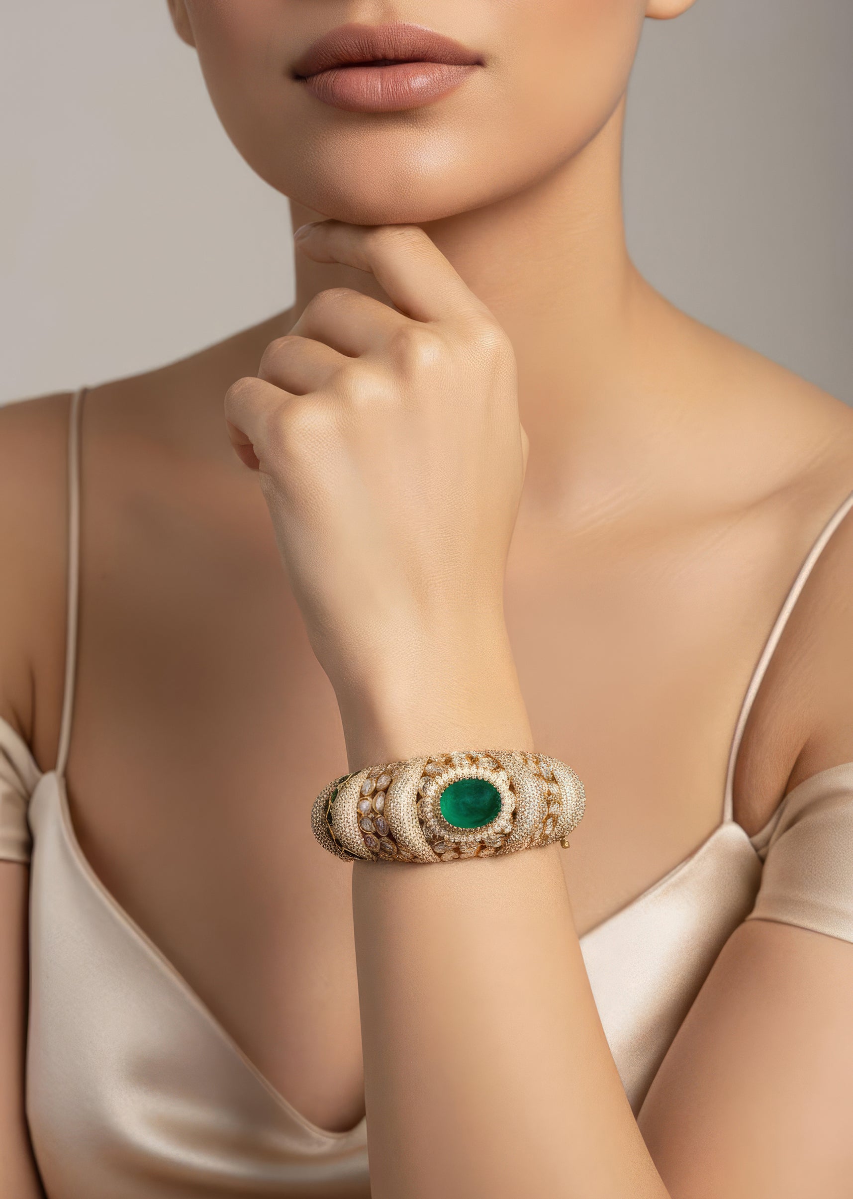 A captivating embodiment of timeless Indian artistry this exquisite green gold jewelry showcases uncut Polki diamonds meticulously set using the traditional Kundan Jadau. Adorned with semi precious stones this handcrafted... More Product Details