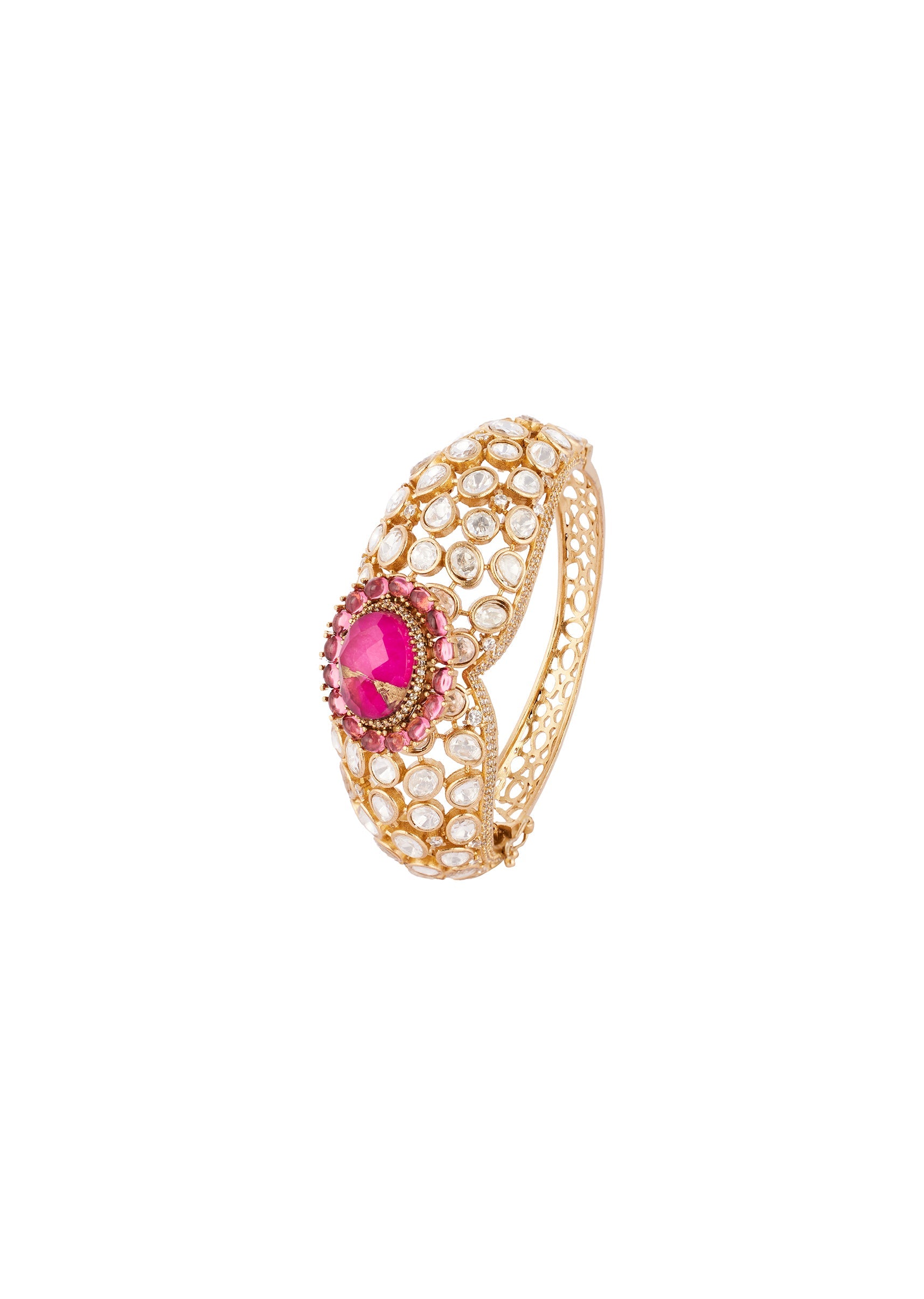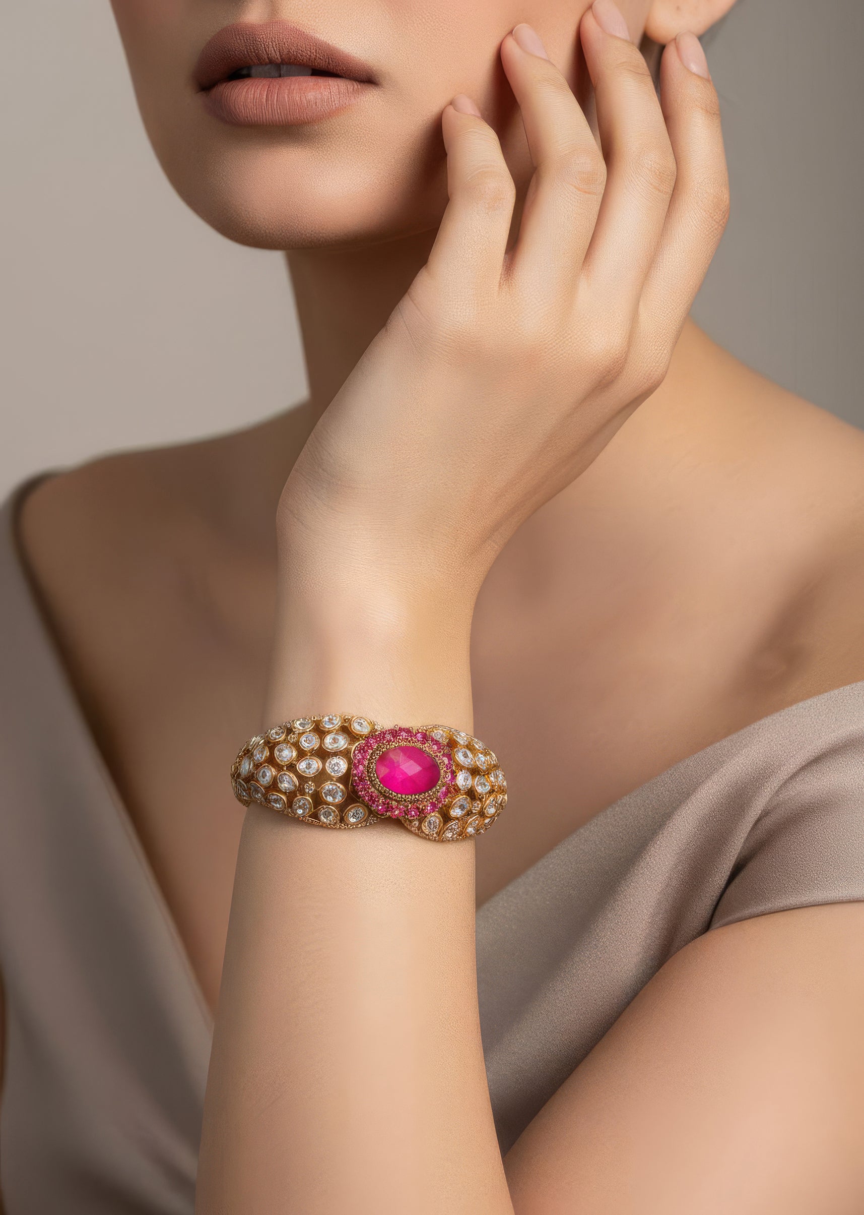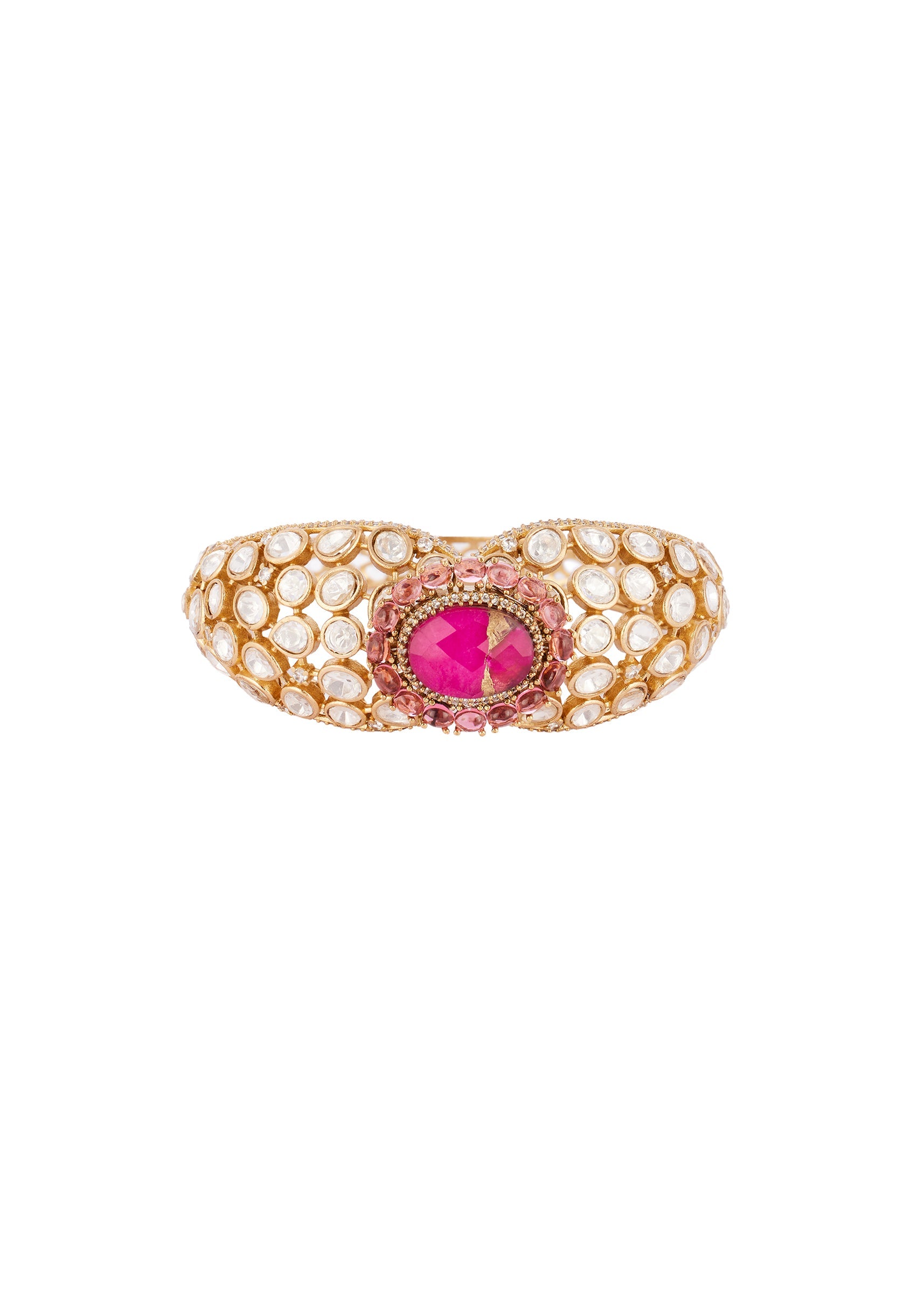 Pair this rani pink and gold piece with a matching lehenga or saree in deep pink or gold to highlight the Polki shine.