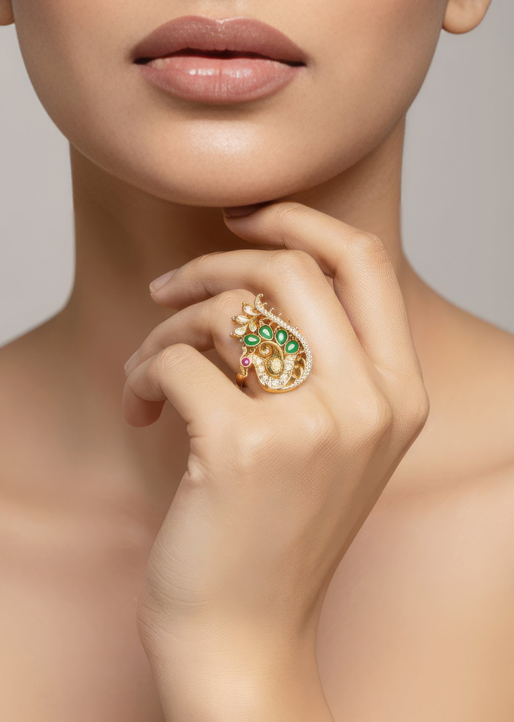 A traditional temple inspired ring crafted in a radiant gold finish. The design features intricate temple motifs accented with simulated pink and green stones that add a festive and elegant charm. Perfect for weddings and special occasions, this ring enhances bridal and family looks with timeless ethnic appeal.