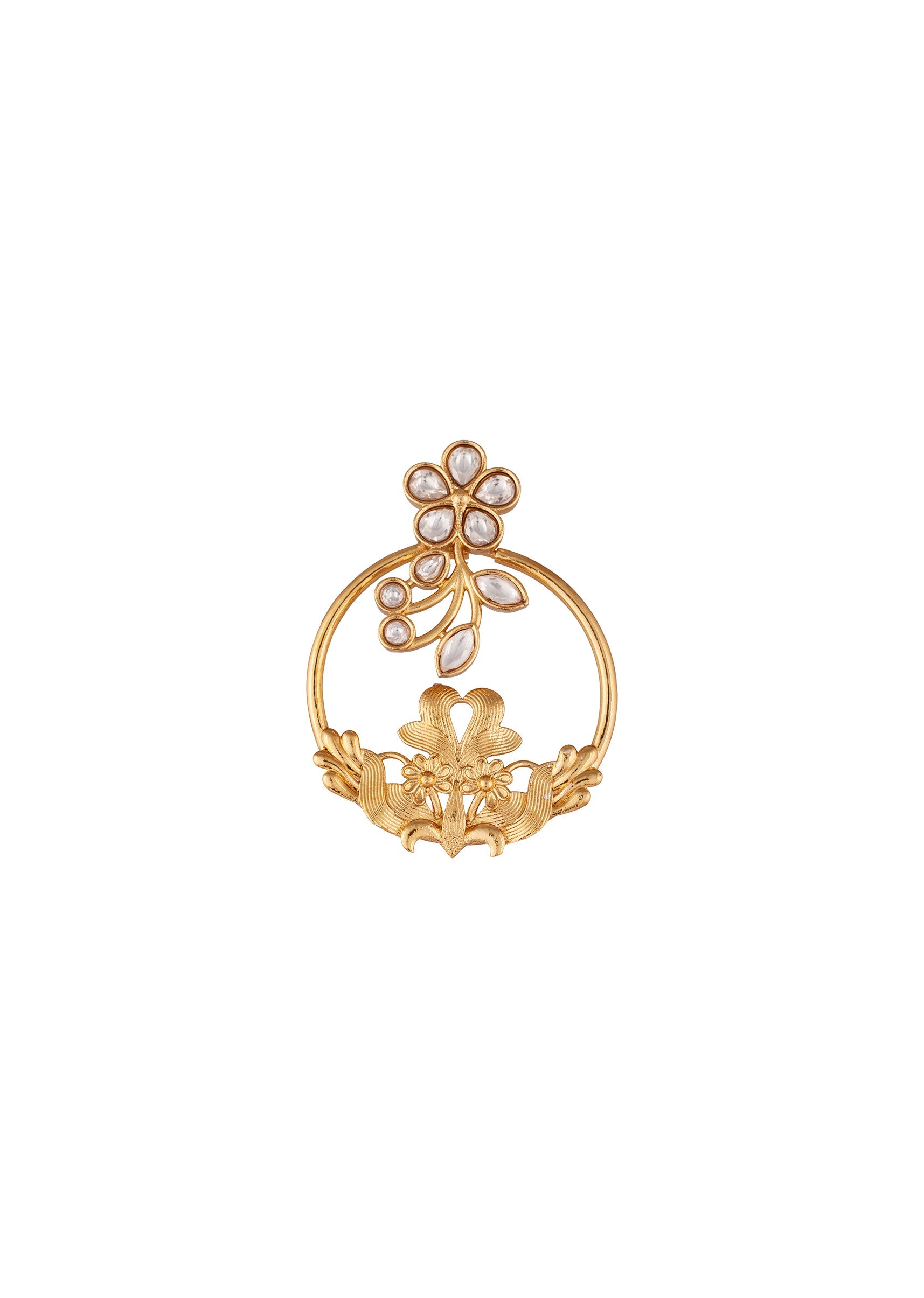A beautifully crafted pair designed to elevate every traditional look. The large gold toned hoop silhouette is adorned with an elegant floral vine motif set exclusively in clear white kundan stones. The ornate filigree detailing at the base adds richness and depth making this pair perfect for weddings festive gatherings or any grand occasion. Awarded as the Most Trusted Brand, we're delivering styles you love, just as promised.