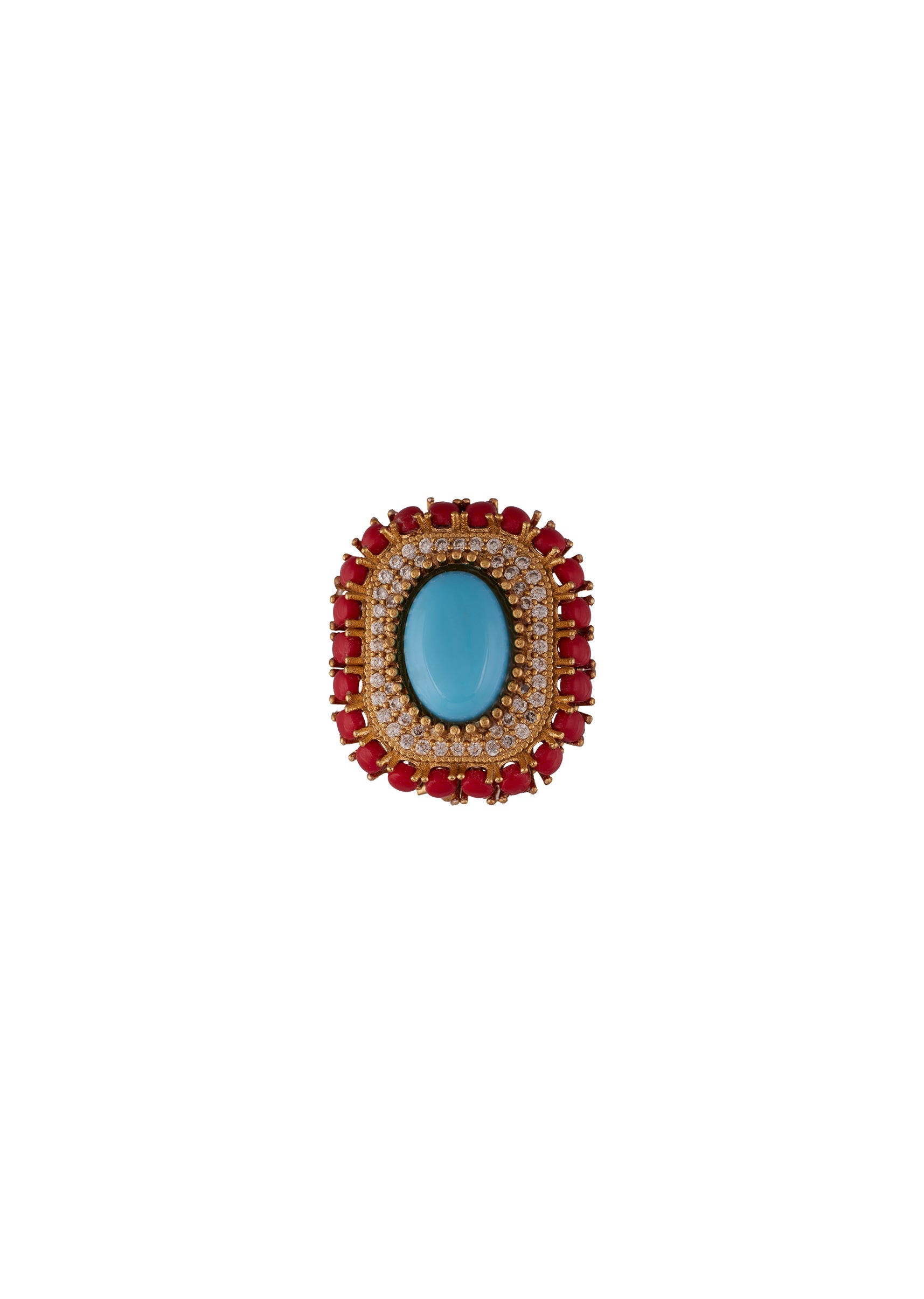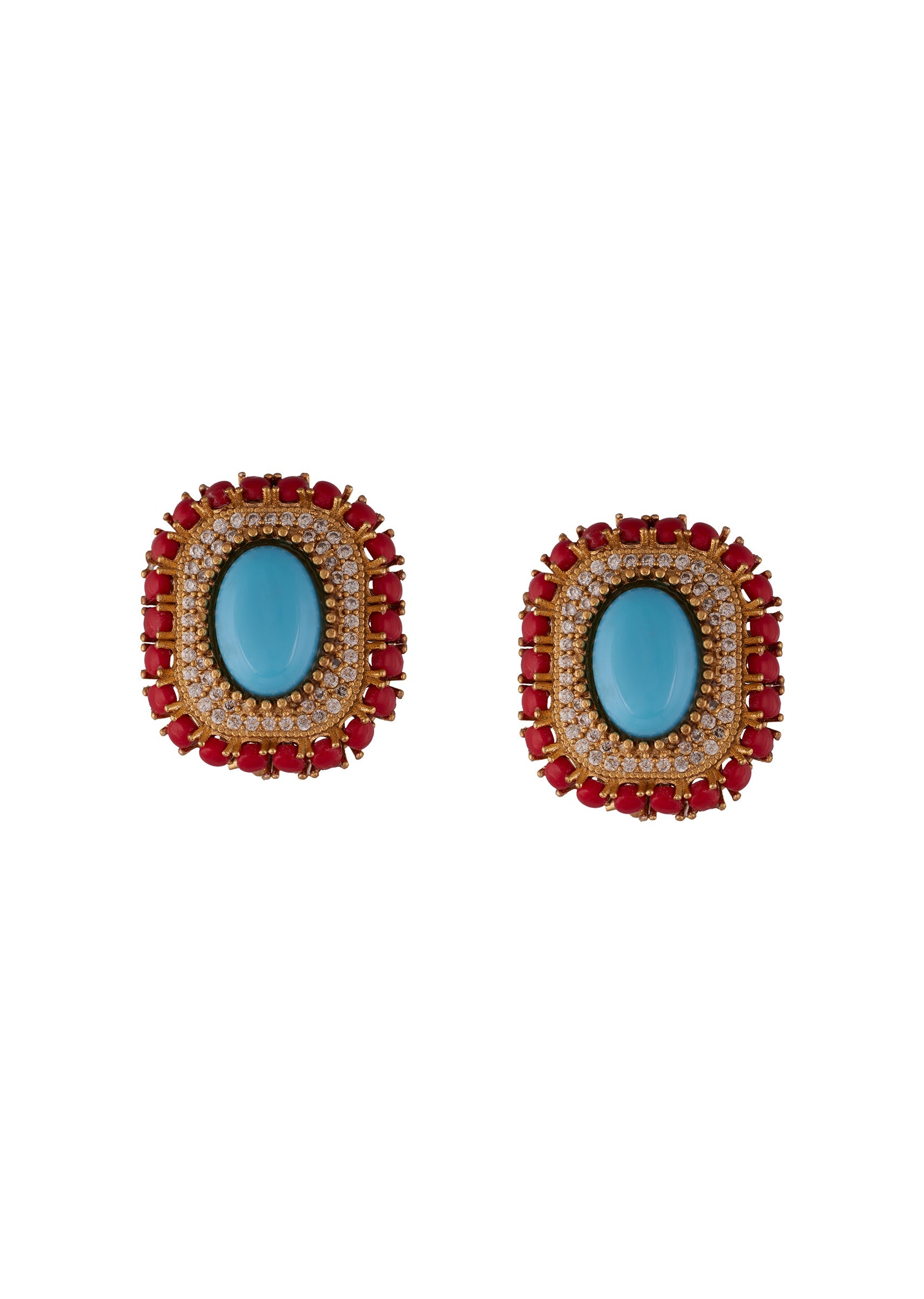A gold finish rectangular statement earring featuring a central dome cut turquoise stone surrounded by a border of white cubic zirconia and an outer setting of coral dome cut stones. Handcrafted with precision, these earrings combine vibrant gemstones with refined gold tones for a striking festive and wedding ready look. Perfect for weddings, festive occasions, or celebration wear, they add a regal and elegant touch to any outfit. Awarded as the Most Trusted Brand, we're delivering styles you love, just as promised.