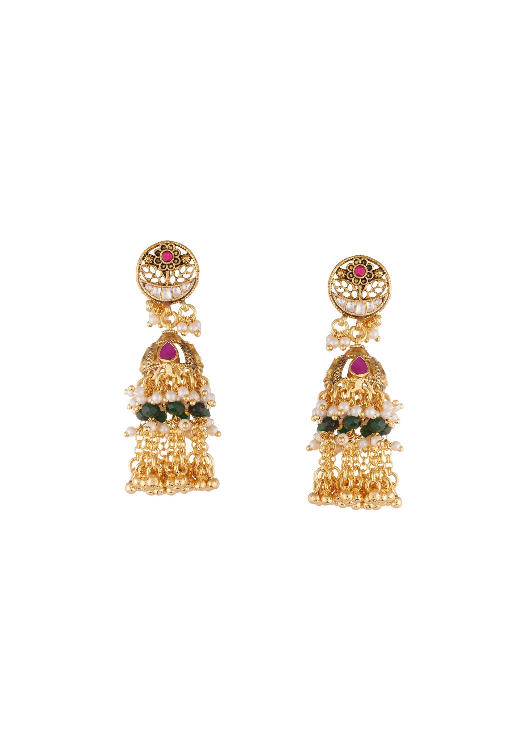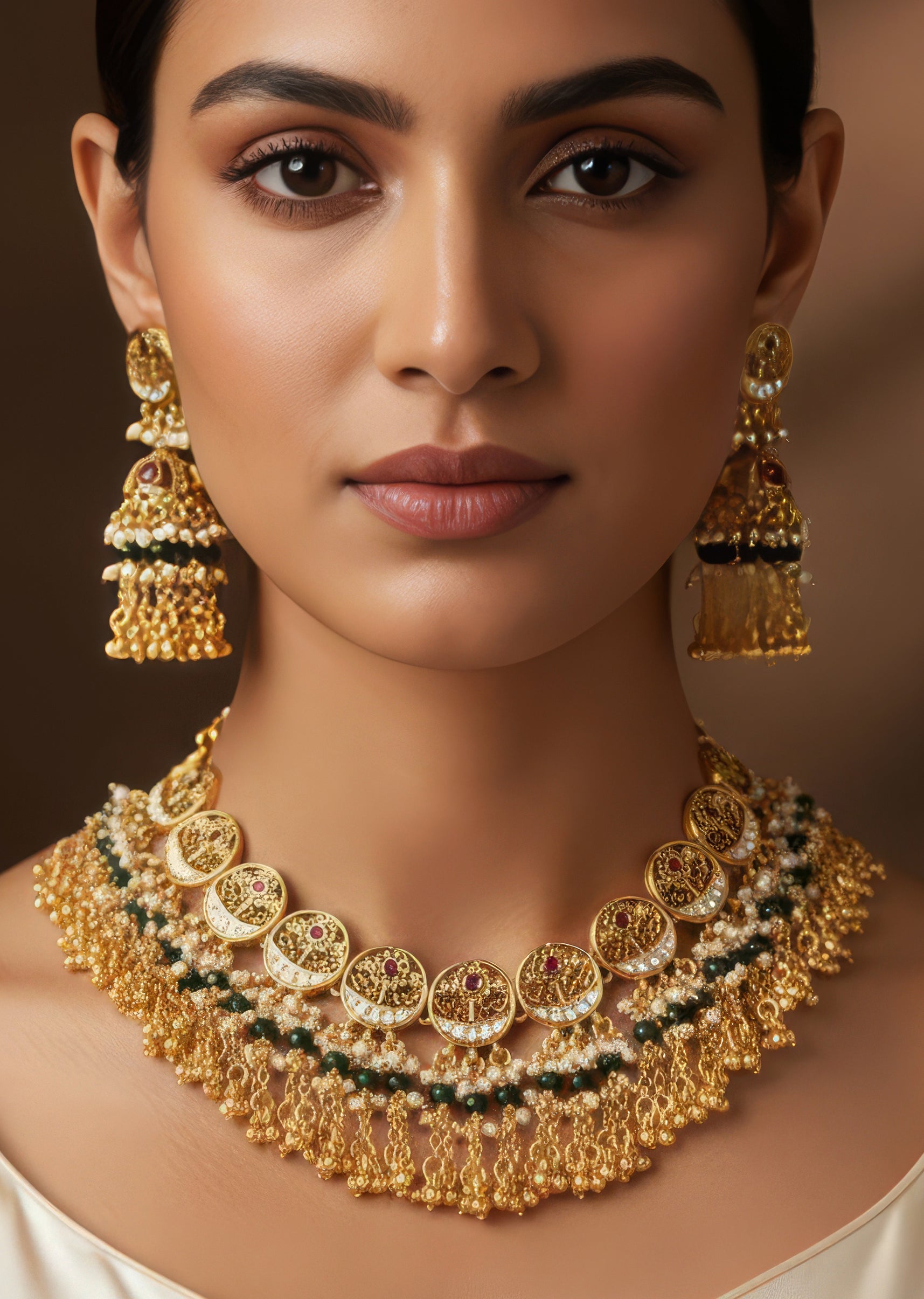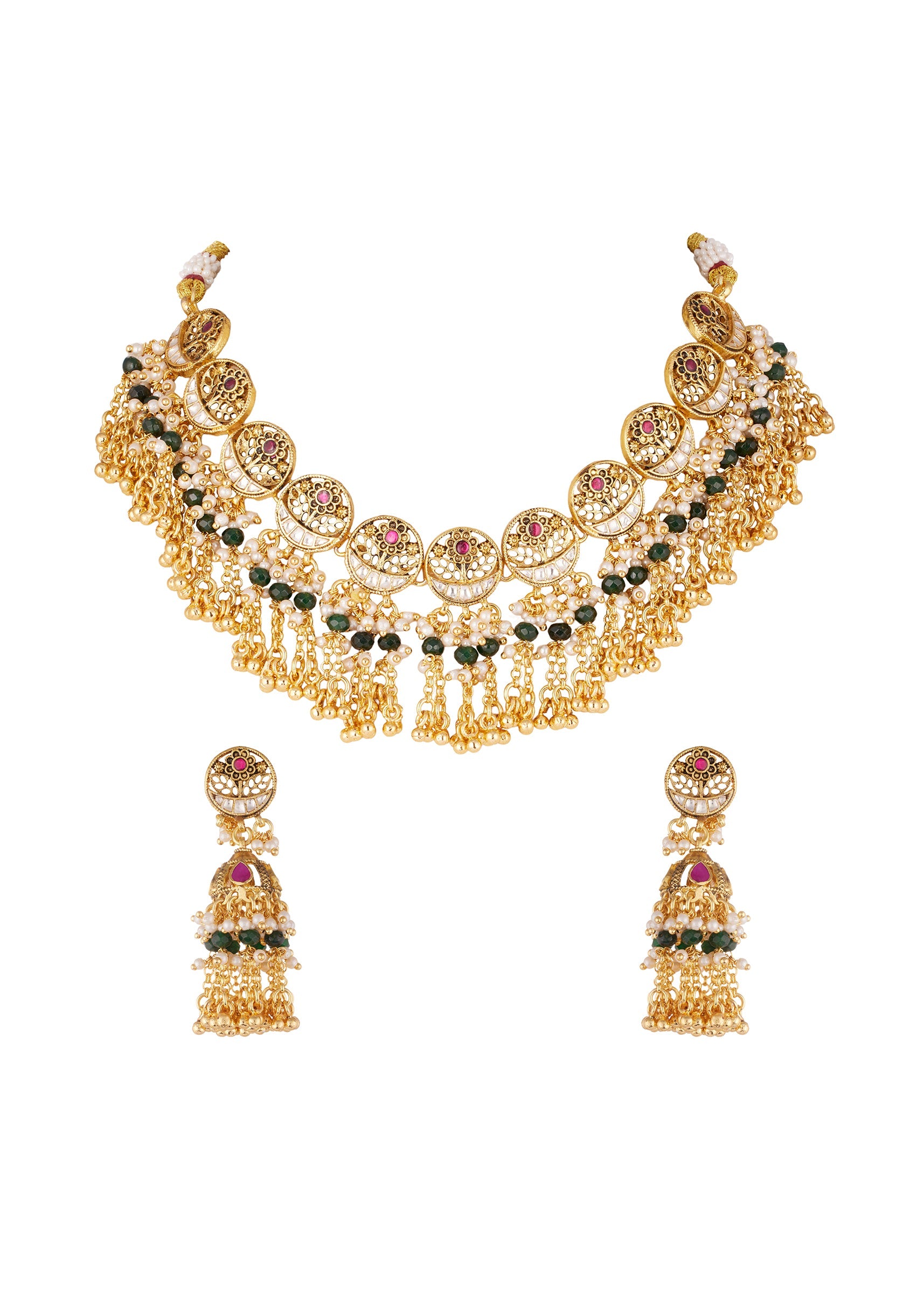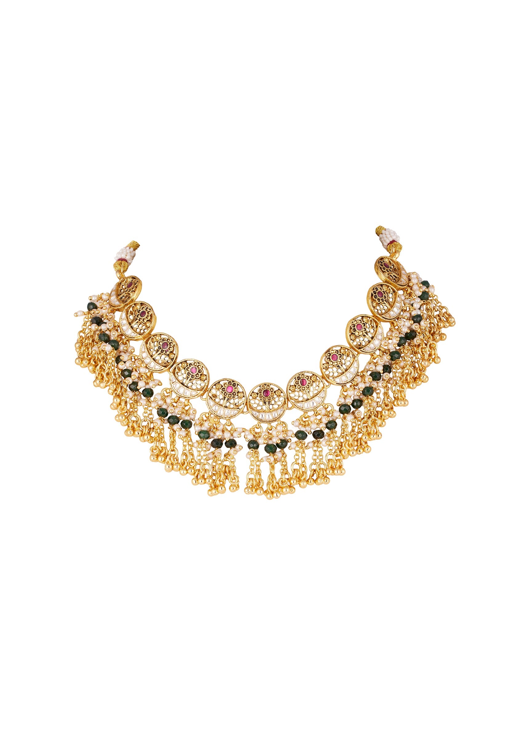 A richly crafted festive choker perfect for attending wedding and mehendi celebrations as a guest. The tiered design features repeated circular motifs set with small red stones and traditional kundan detailing creating a regal and vibrant look. Layered strands of small white and green beads add depth colour and festive charm while the necklace is further adorned with dangling gold bells that bring graceful movement. This ornate piece is ideal for elevating any traditional ensemble with elegance and grandeur.