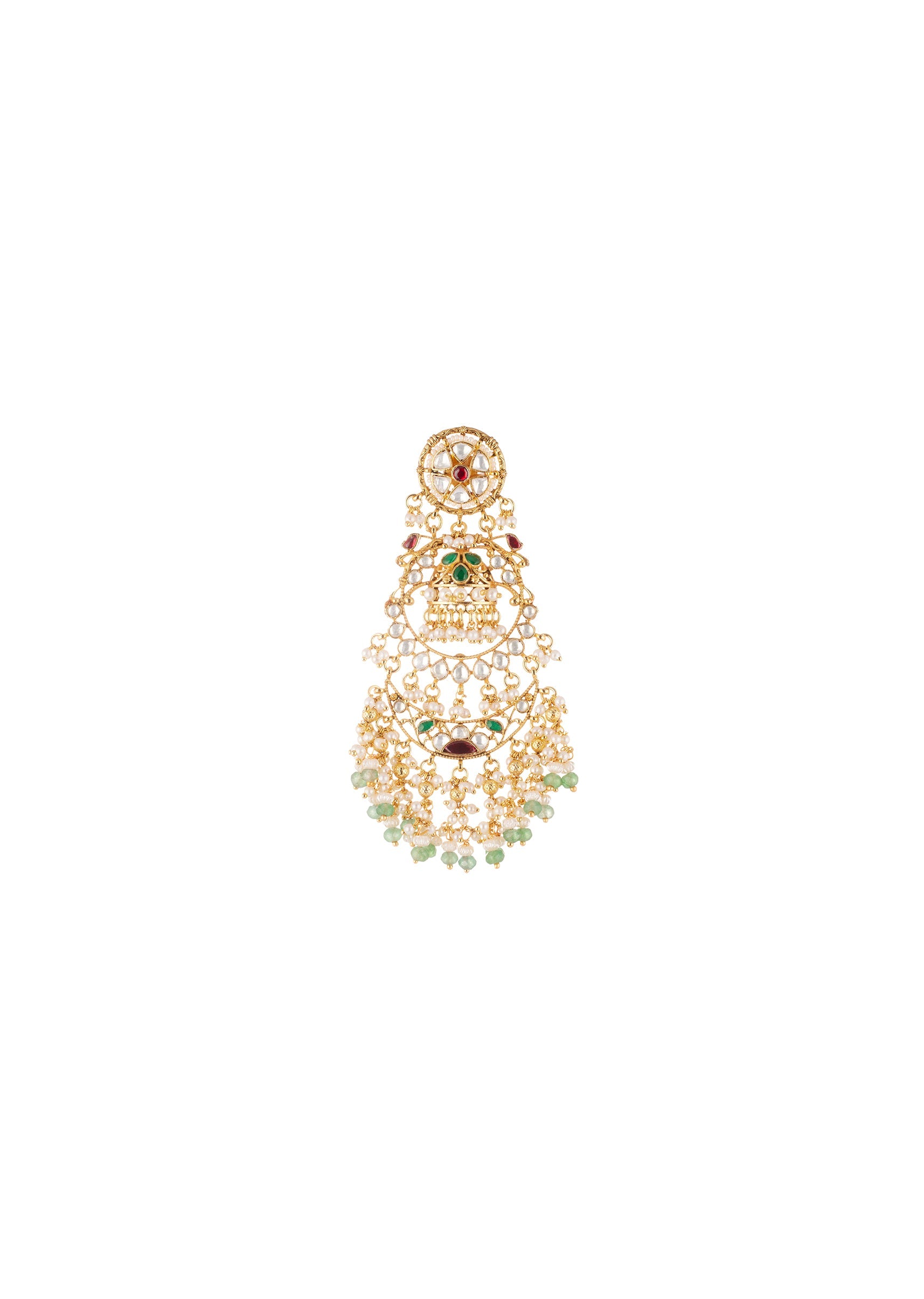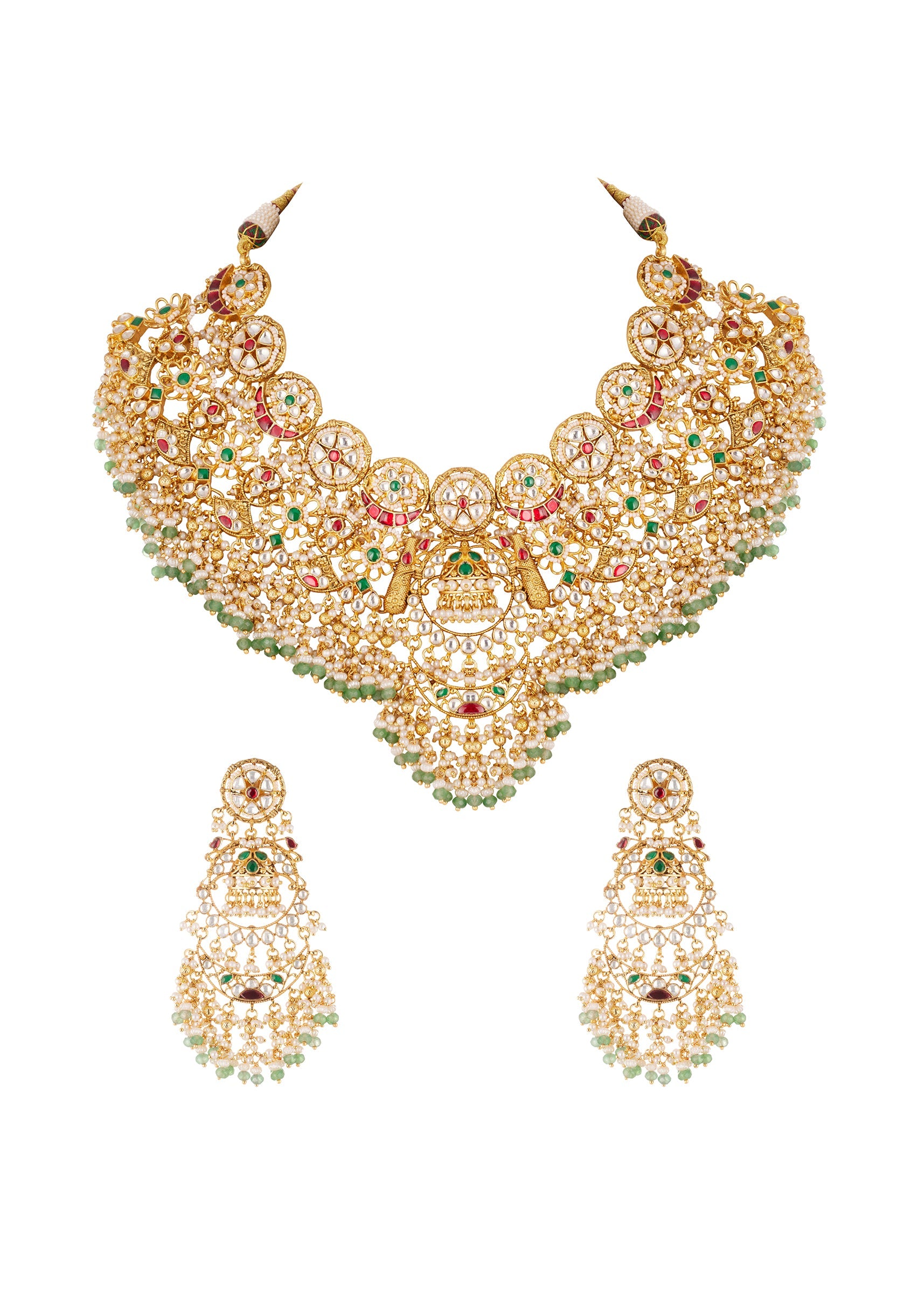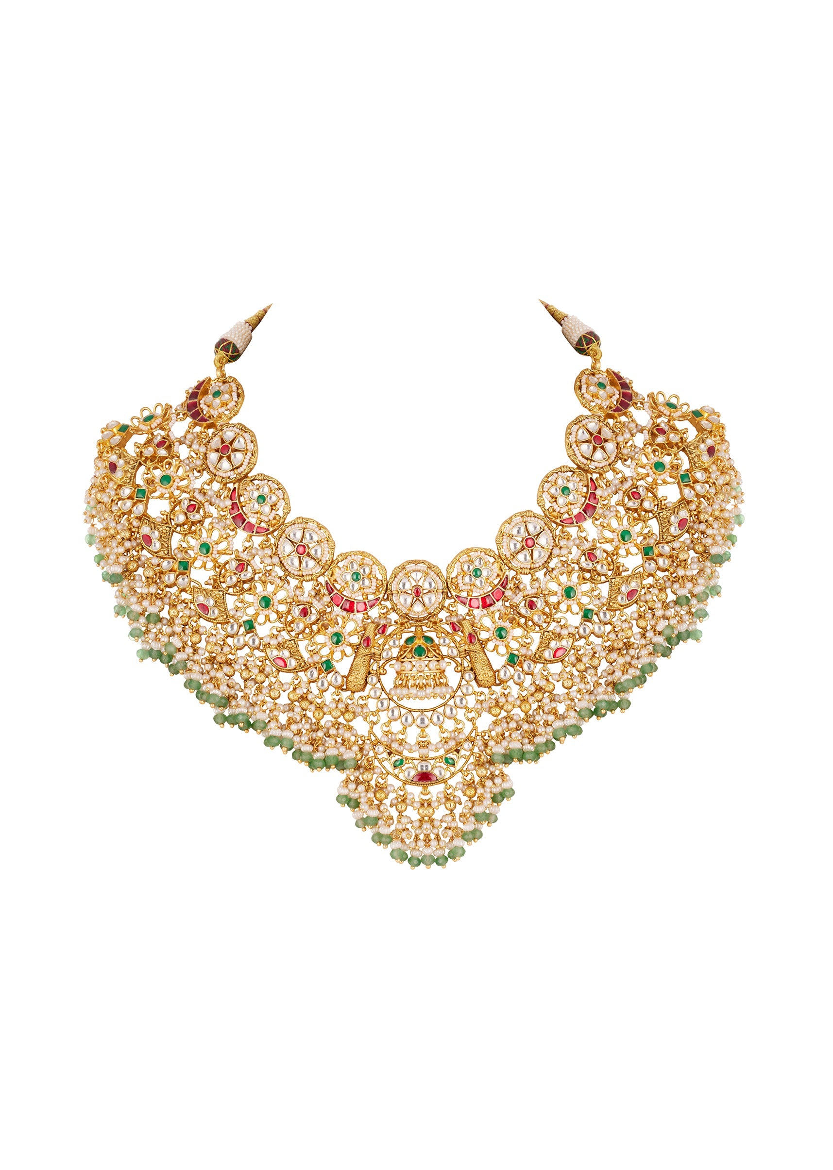: Pair it with a red green or cream lehenga or a silk saree to accentuate the bead layers and highlight the kundan motifs.