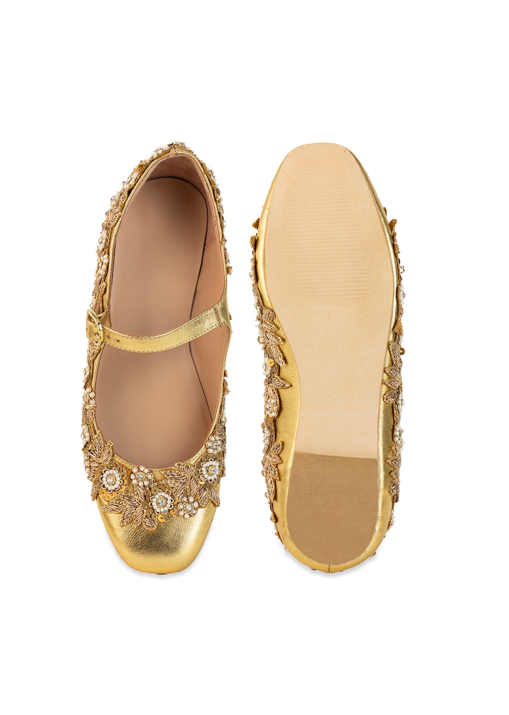 Bask in festive brilliance with gold juttis that shimmer in a radiant gold finish and showcase intricate floral embroidery enriched with sequins, beads, and zari for a truly luxurious look.... More Product Details