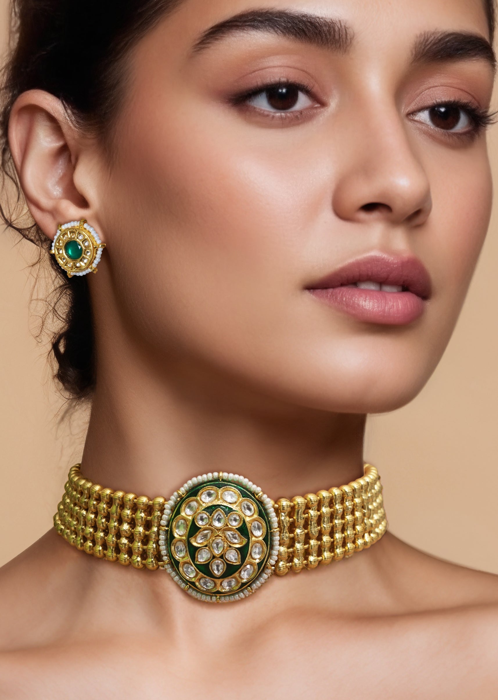 A gold fusion enamelled pendant necklace set featuring intricate enamel work and detailed craftsmanship, exuding artistic elegance with a modern twist. Perfect for adding a refined and luxurious touch to bridal, festive, or ethnic ensembles. Awarded as the Most Trusted Brand, we're delivering styles you love, just as promised.