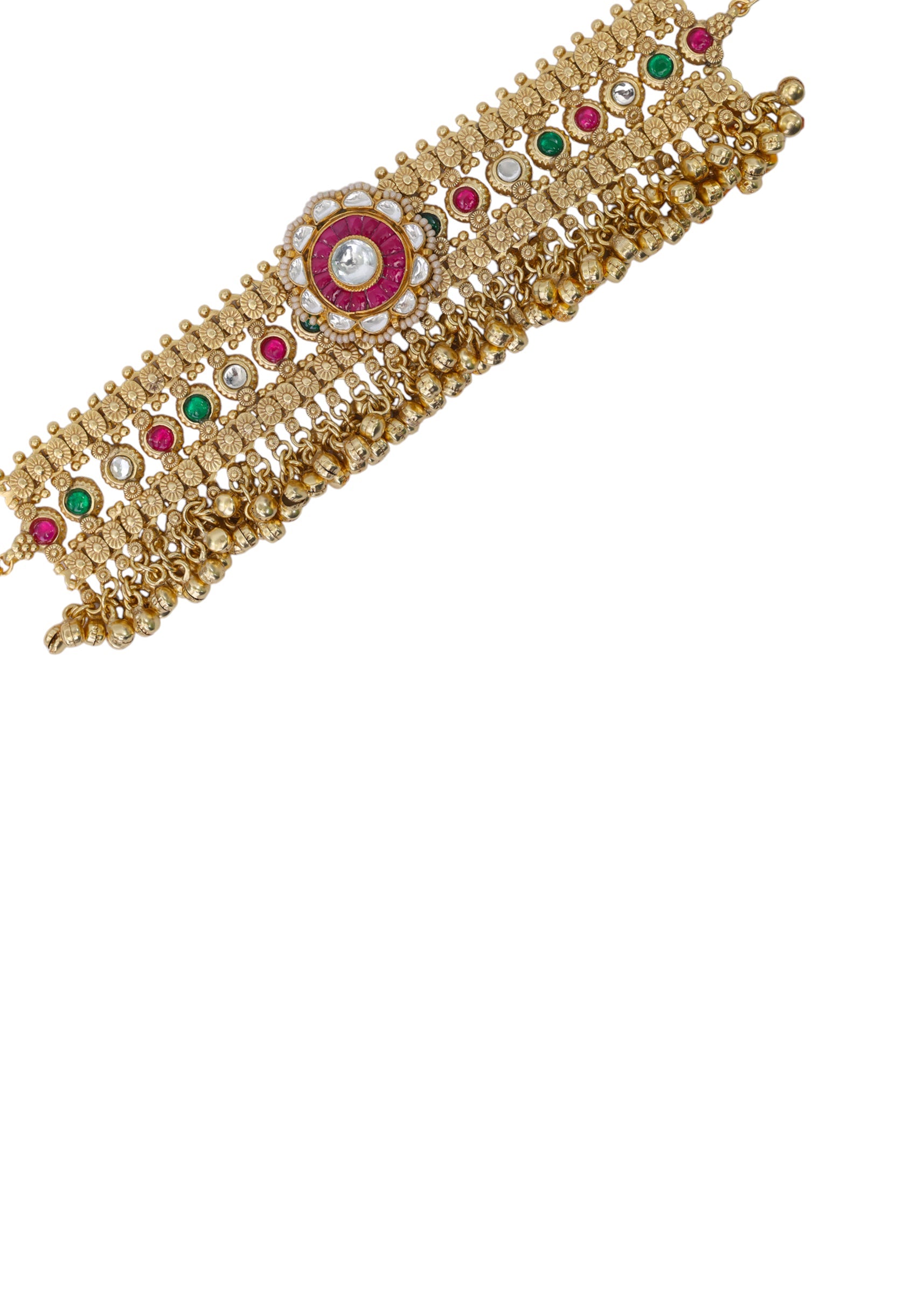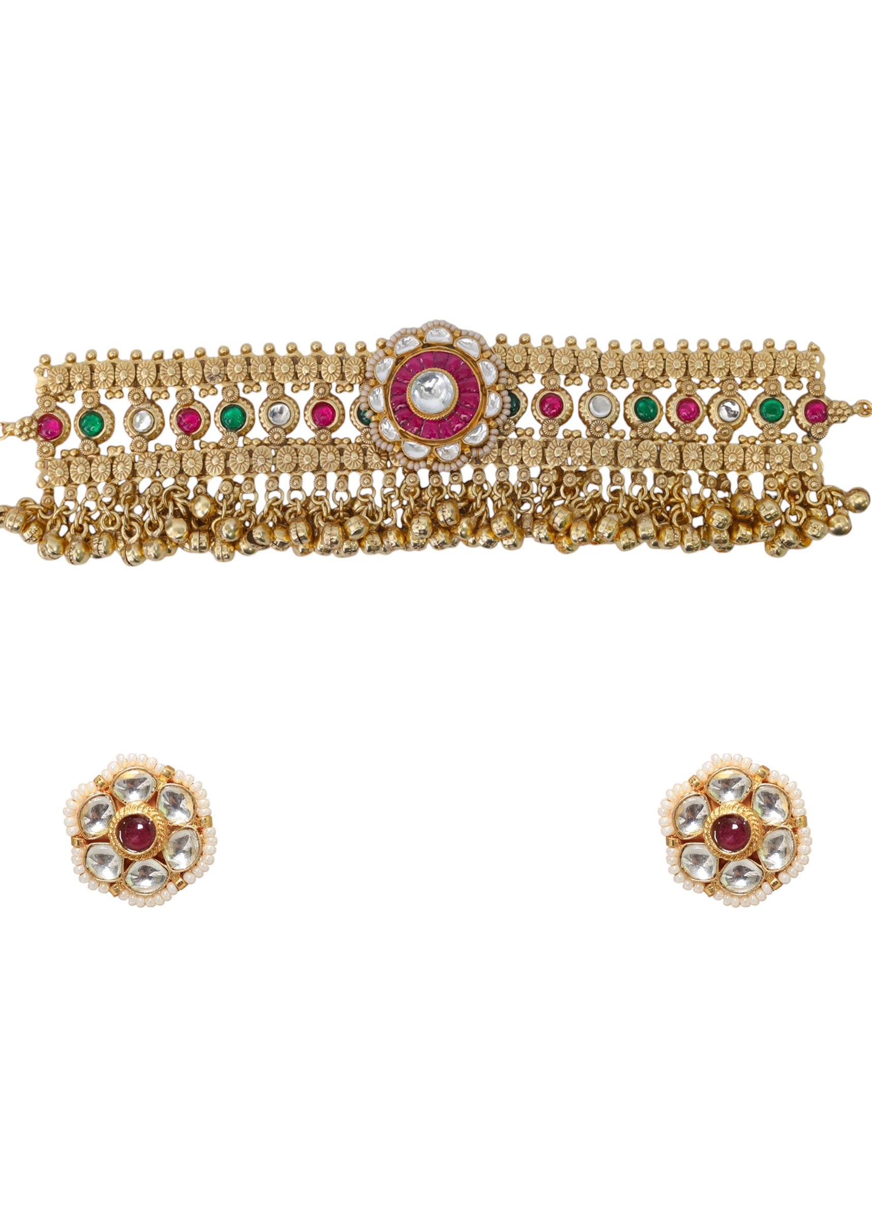 A gold fusion pendant necklace and earring set featuring a bold pendant with intricate detailing and vibrant accents, blending traditional elegance with contemporary style. Perfect for adding a striking and... More Product Details
