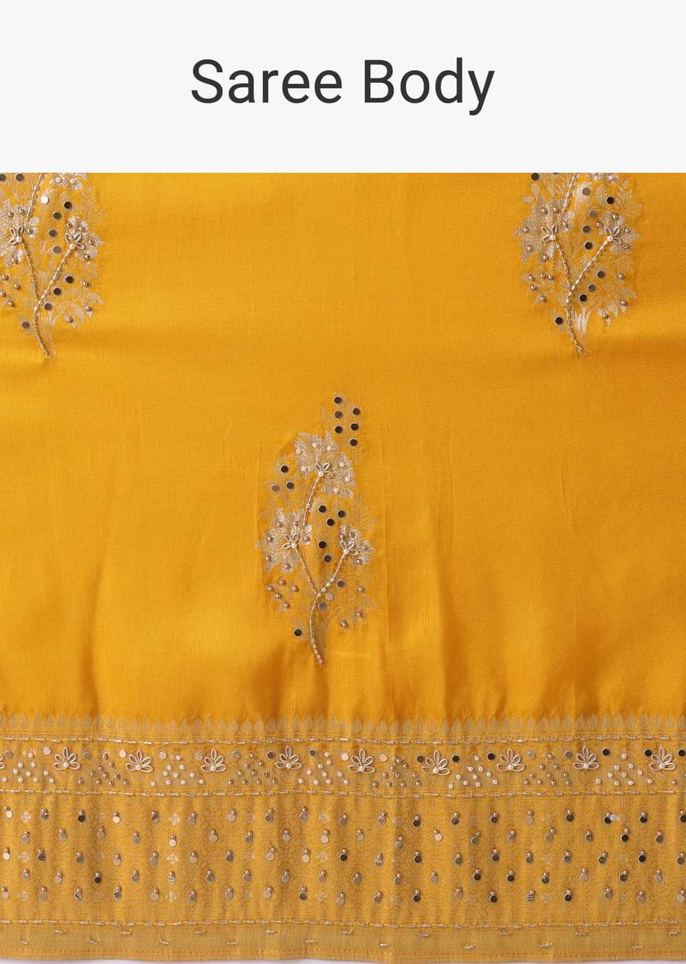 Gold fusion yellow woven saree with embroidery in beads, zardosi, cut dana, and, mock mirrors. The saree is fabricated in khadi and has a rich work on its scallop pallu... More Product Details