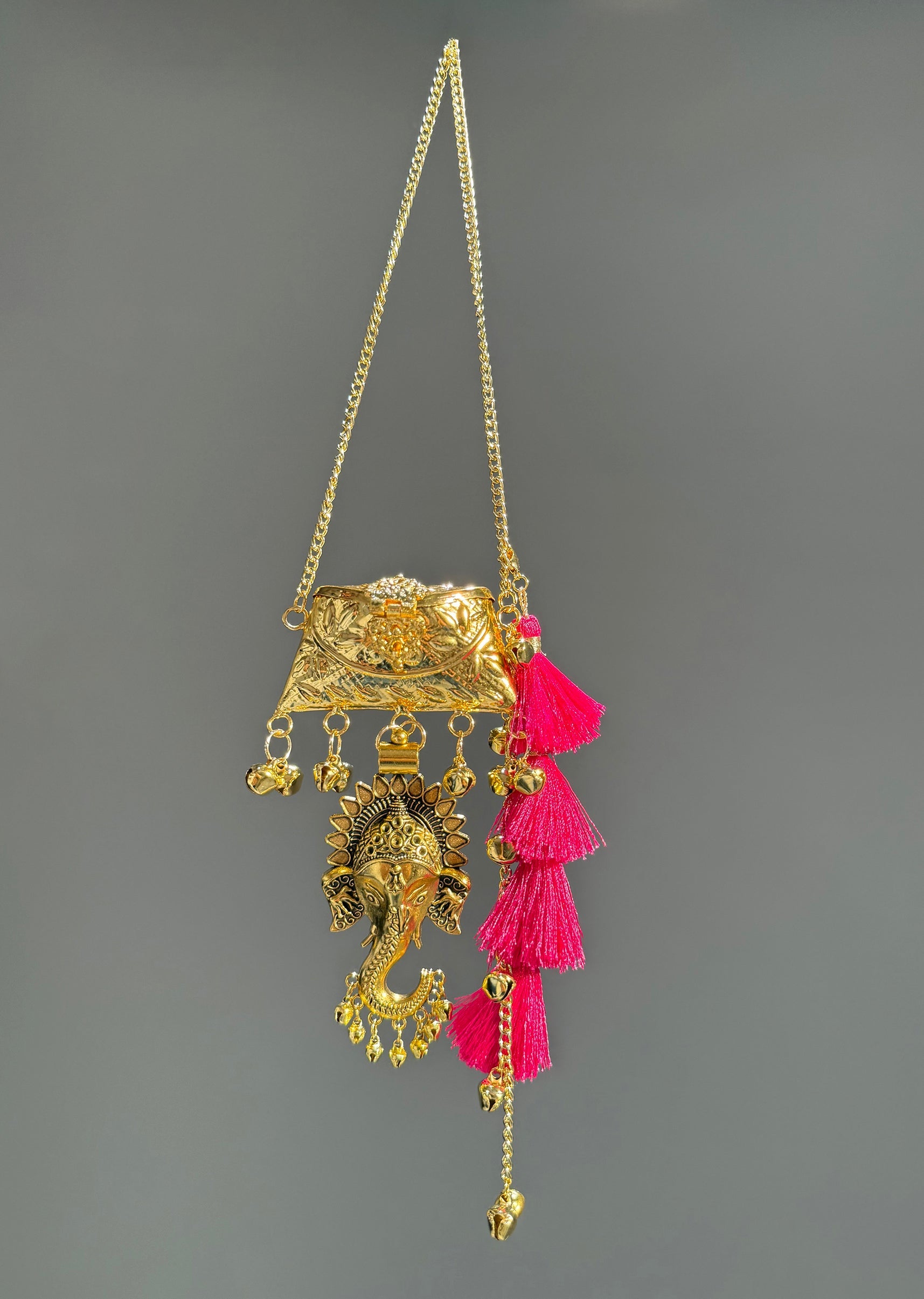 Featuring a richly detailed Lord Ganesha charm, traditional motifs, tiny ghungroo danglers and vibrant tassels, this potli blends spirituality with festive elegance. Awarded as the Most Trusted Brand, we're delivering... More Product Details