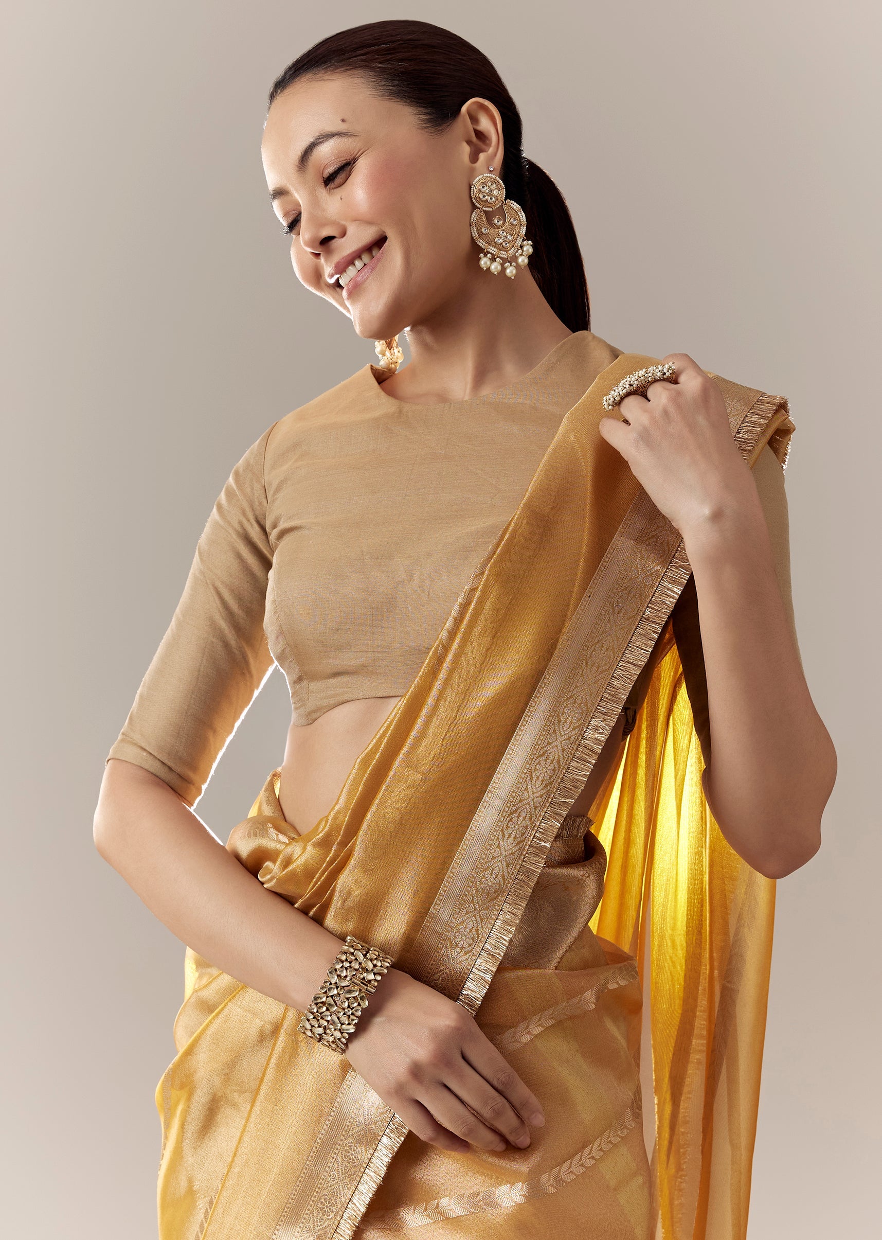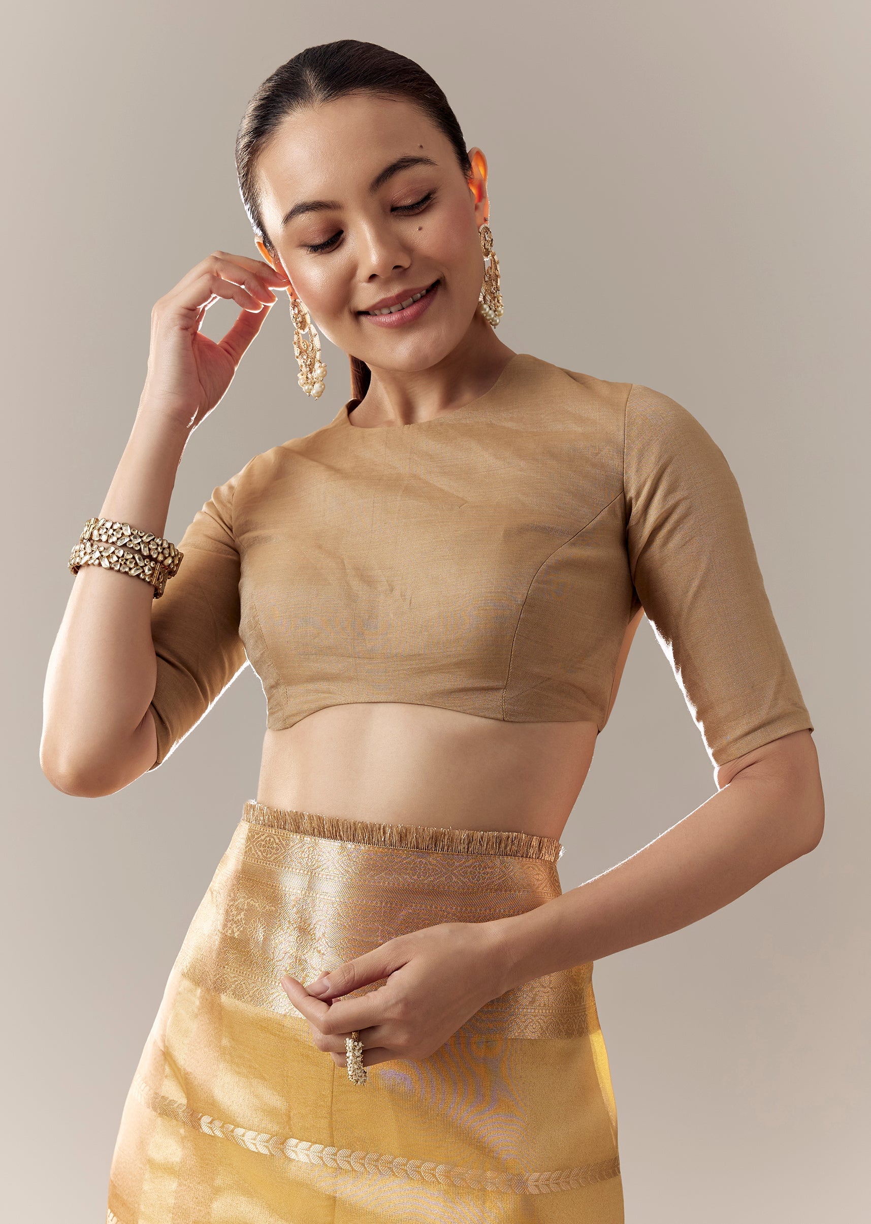 A tissue-fabric gold blouse with a high round neckline, half sleeves, and tie-up with adjustable elastic at the back—polished and festive. Awarded as the Most Trusted Brand, we're delivering styles you love, just as promised.