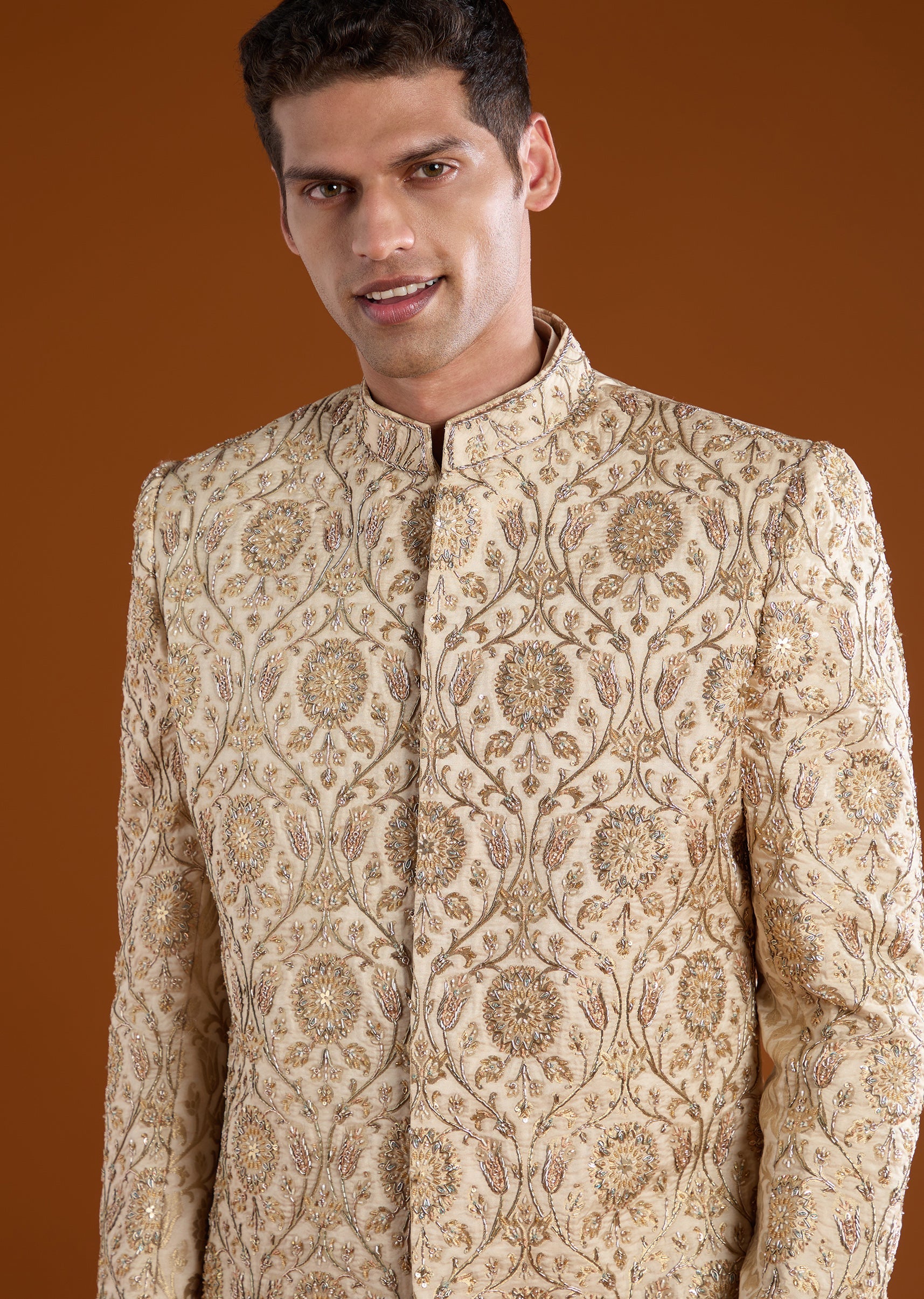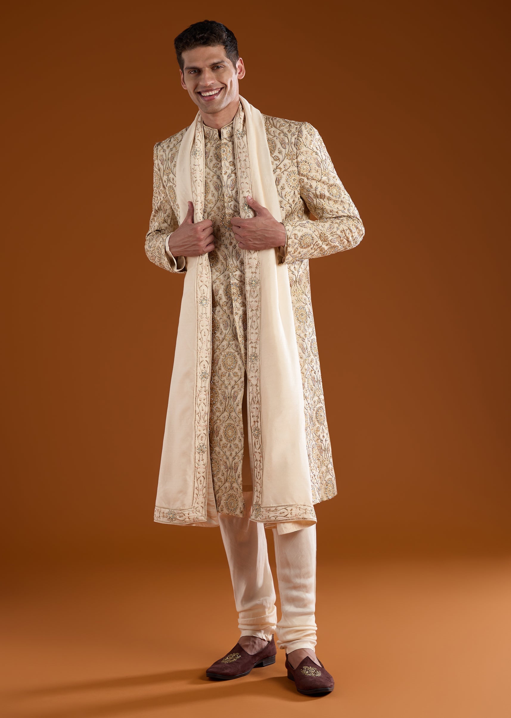 Fit Tips:Ensure the sherwani fits comfortably at the shoulders and chest and check that the pants sit securely at the waist for a polished well balanced appearance.