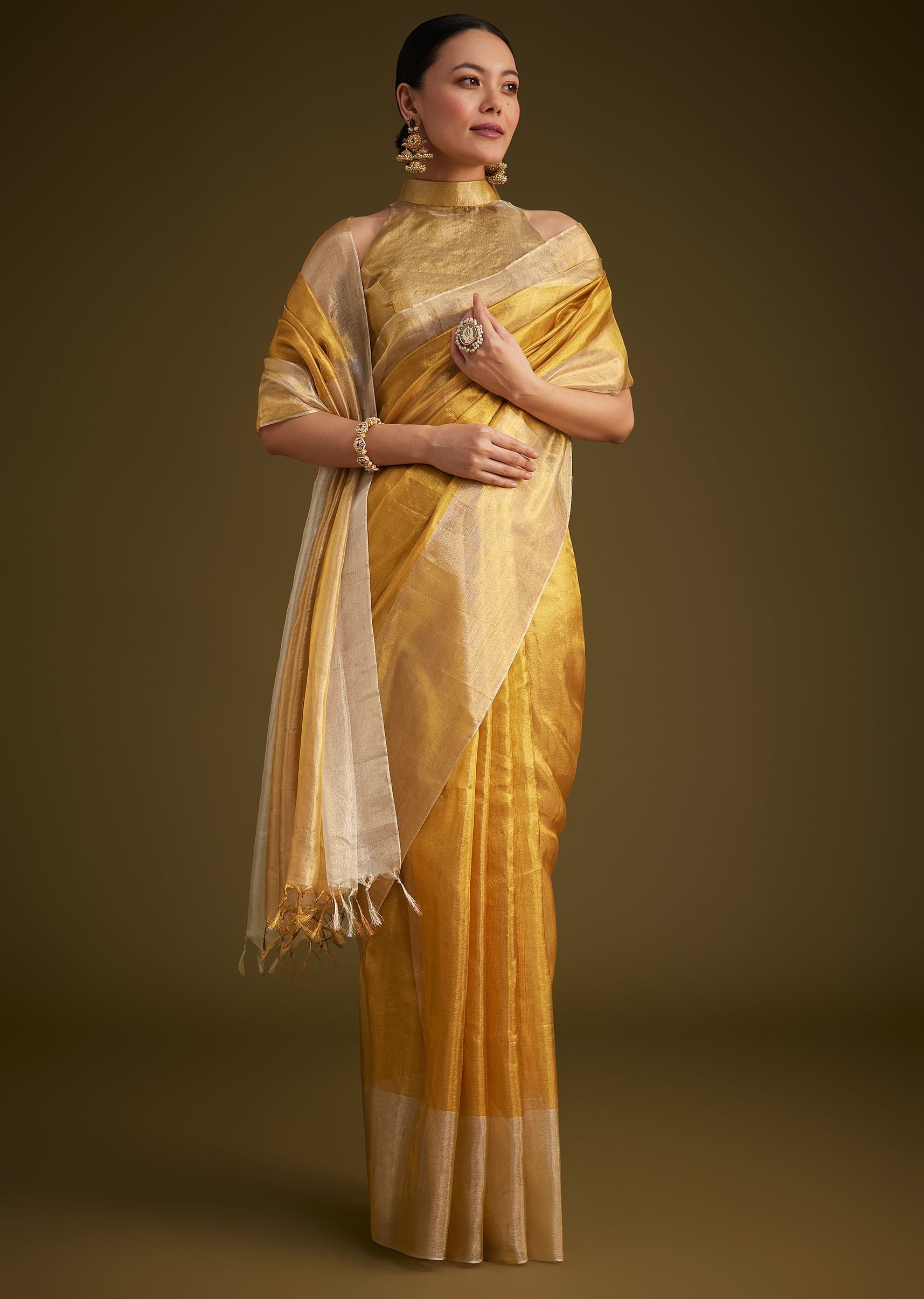 - Grace Any Occasion With This Gold Kanjivaram Silk Saree Accentuated By A Striking Contrast Border And Pallu.
