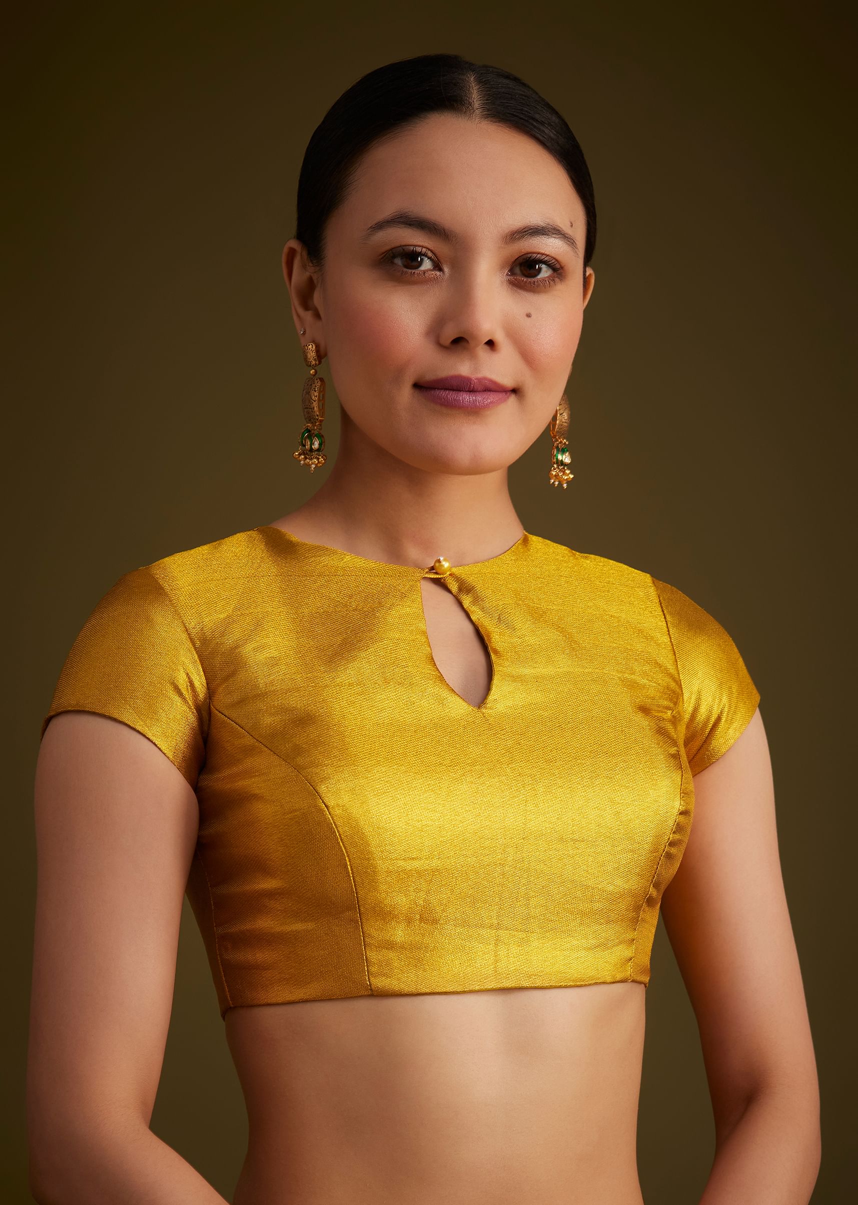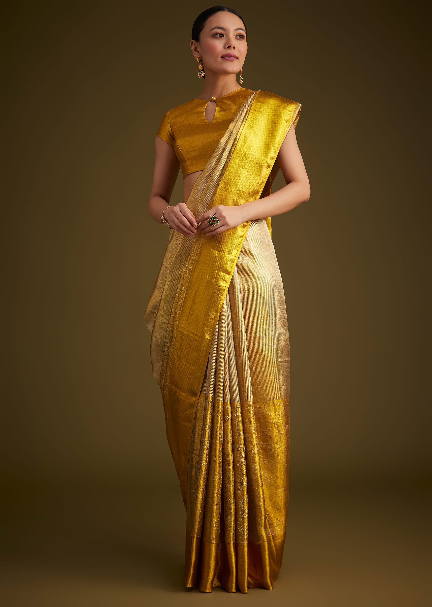 - Celebrate Tradition With This Radiant Gold Kanjivaram Silk Saree Accentuated By A Classic Golden Zari Border.