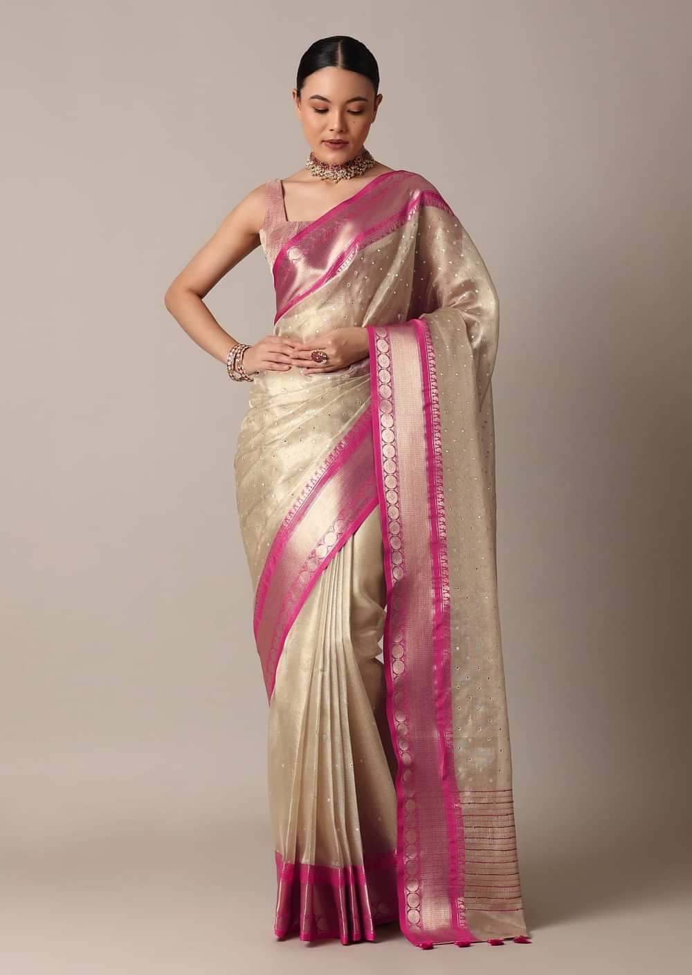 Gold Kota Silk Chanderi Saree With Mirror Detail And Unstitched Blouse Piece