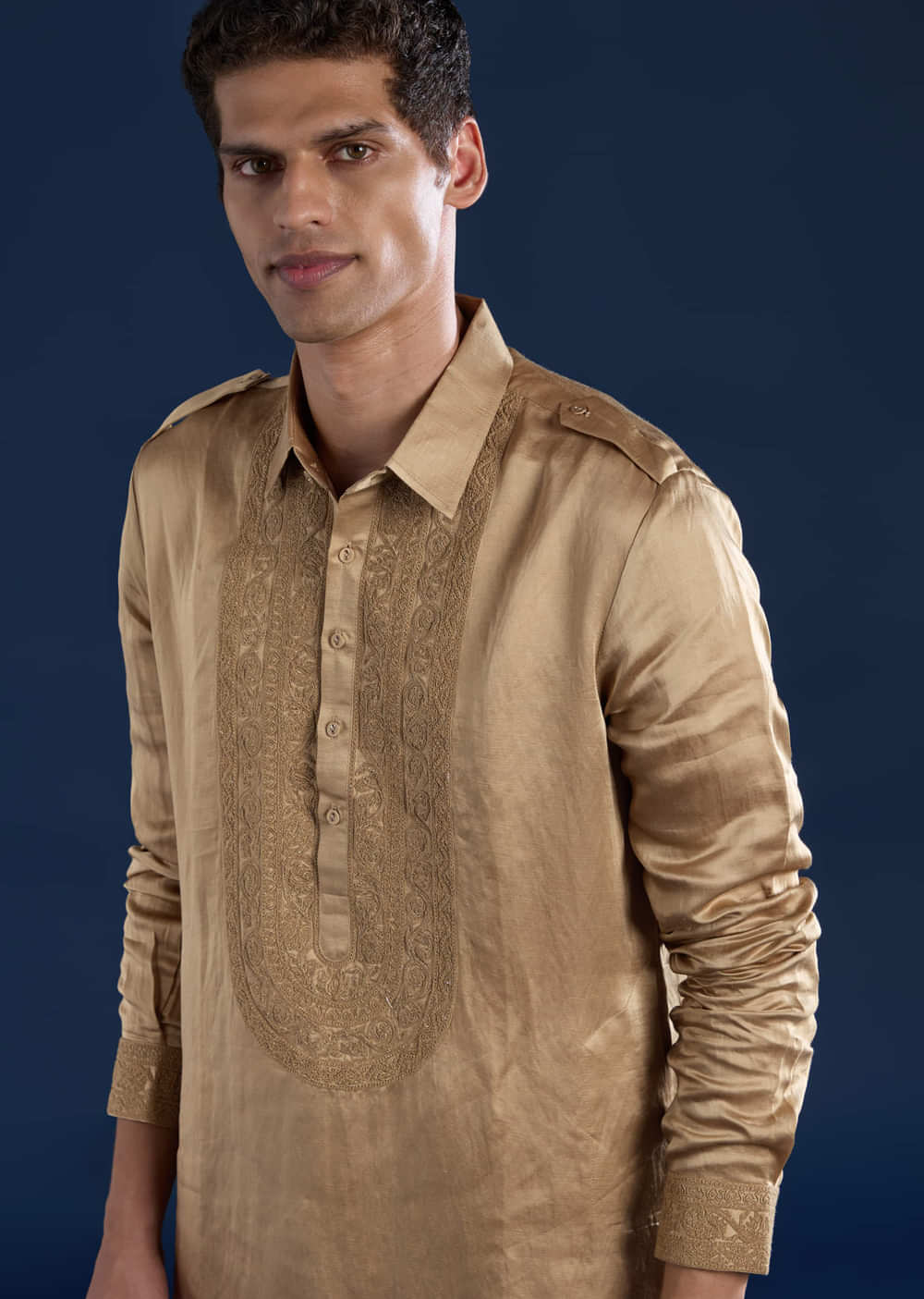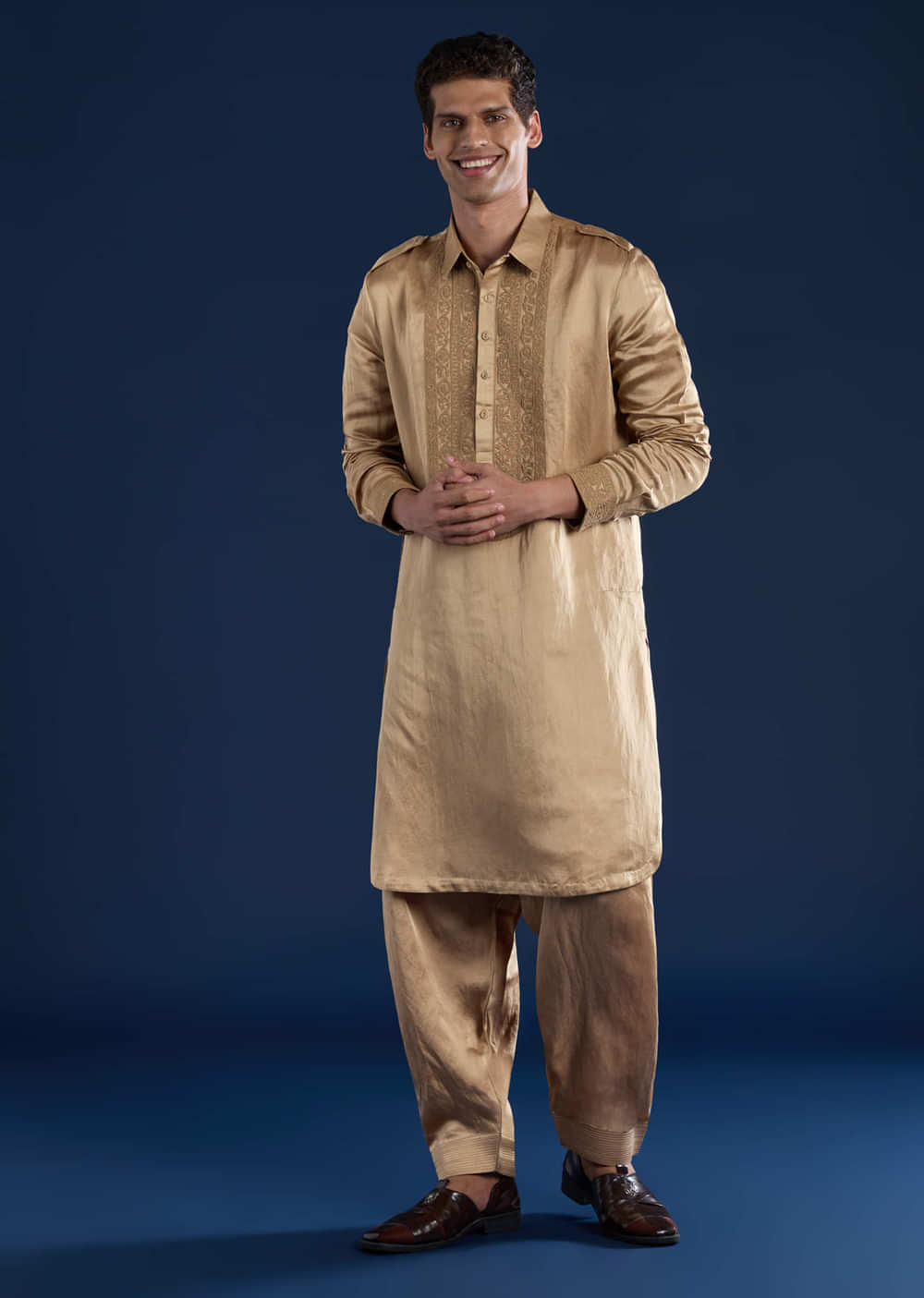 Gold Linen Satin Embroidered Mens Kurta and Pant Set