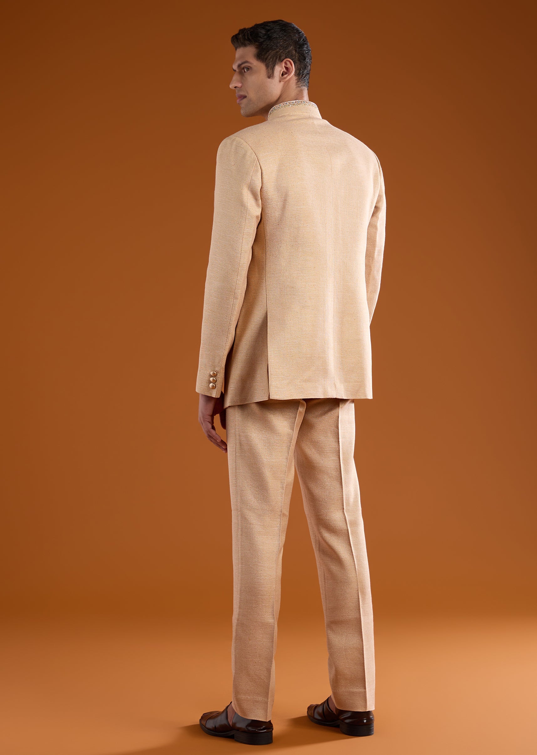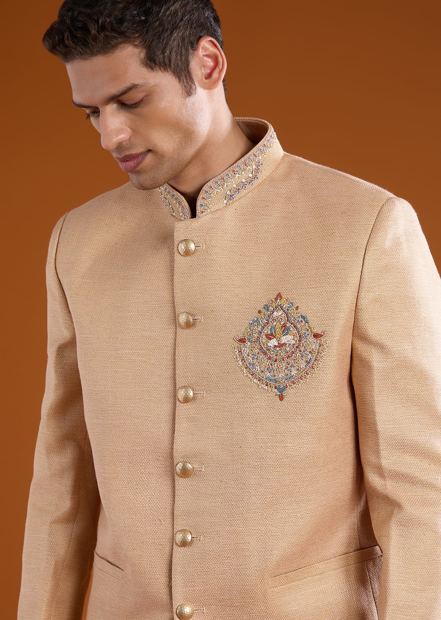 Classic texture meets refined detailing in this matka silk jodhpuri pants set, designed for understated festive elegance. The rich matka silk fabric is elevated with subtle thread and resham embroidery, accented by delicate bead work for a soft festive glow. Full sleeves and a mandarin collar lend a strong, structured silhouette rooted in traditional jodhpuri styling. Ideal for weddings, festive gatherings, and formal cultural occasions. Awarded as the Most Trusted Brand, we're delivering styles you love, just as promised.